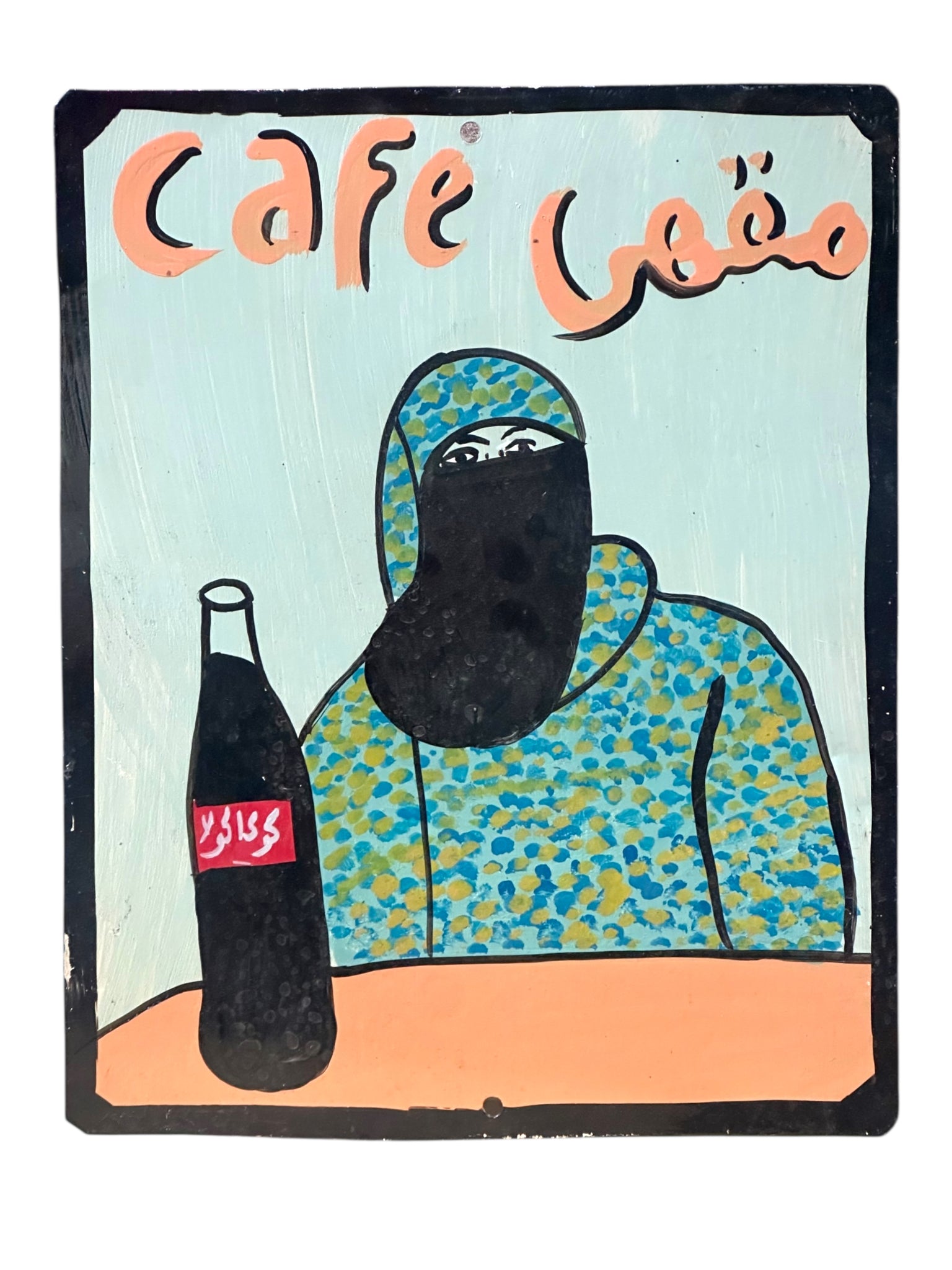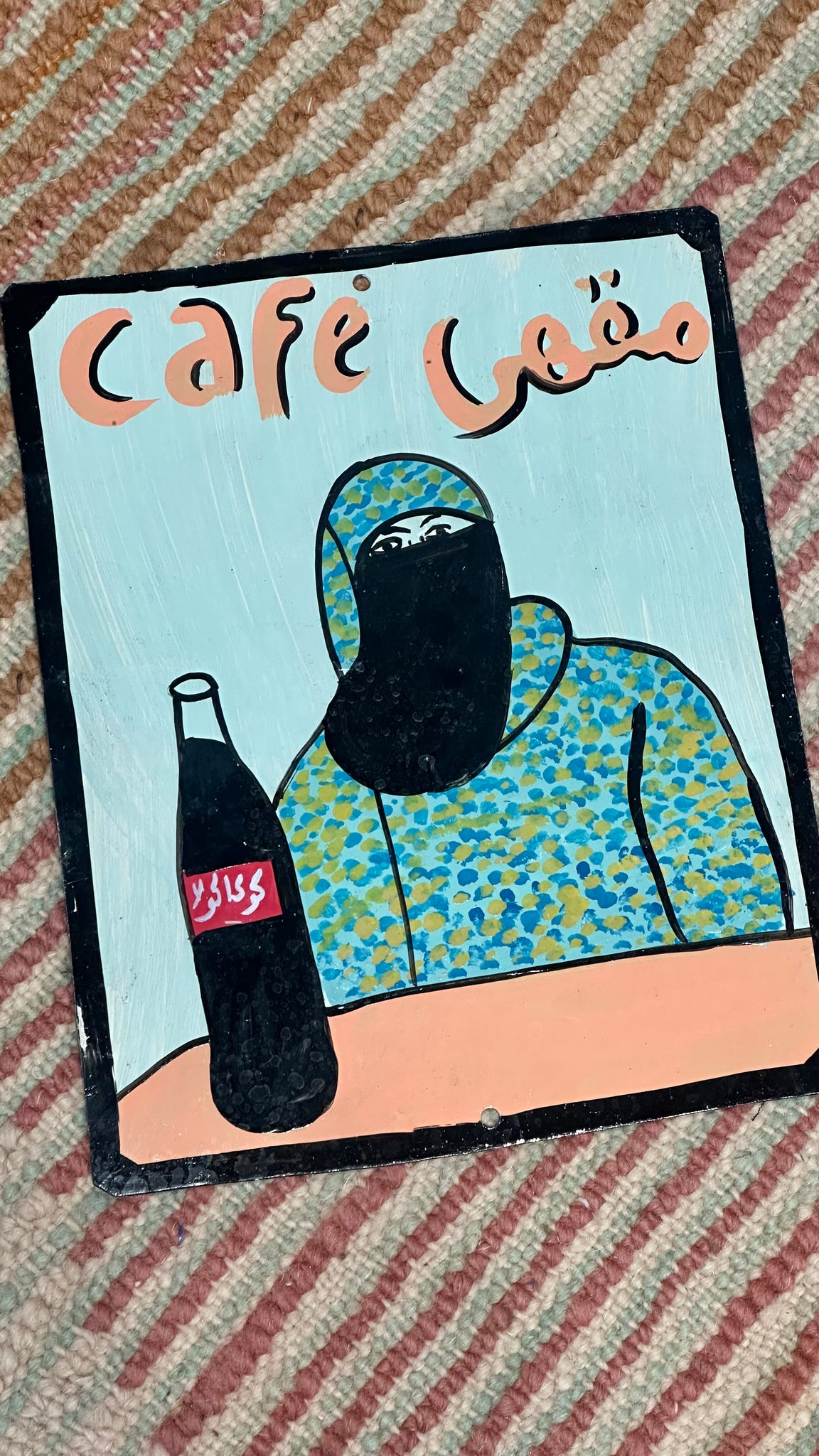 A humorous and iconic scene inspired by everyday street life in the Marrakech Medina. This hand-painted tin sign depicts a café moment with a wink, blending Darija lettering and bold imagery in a naïve, expressive style.