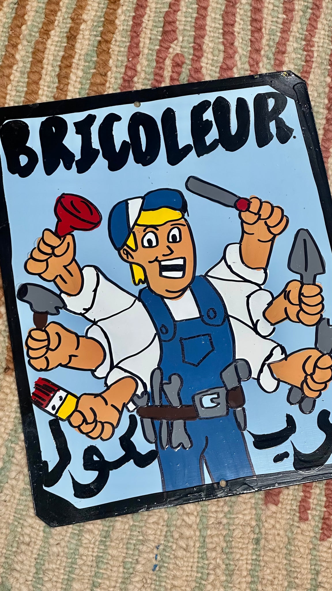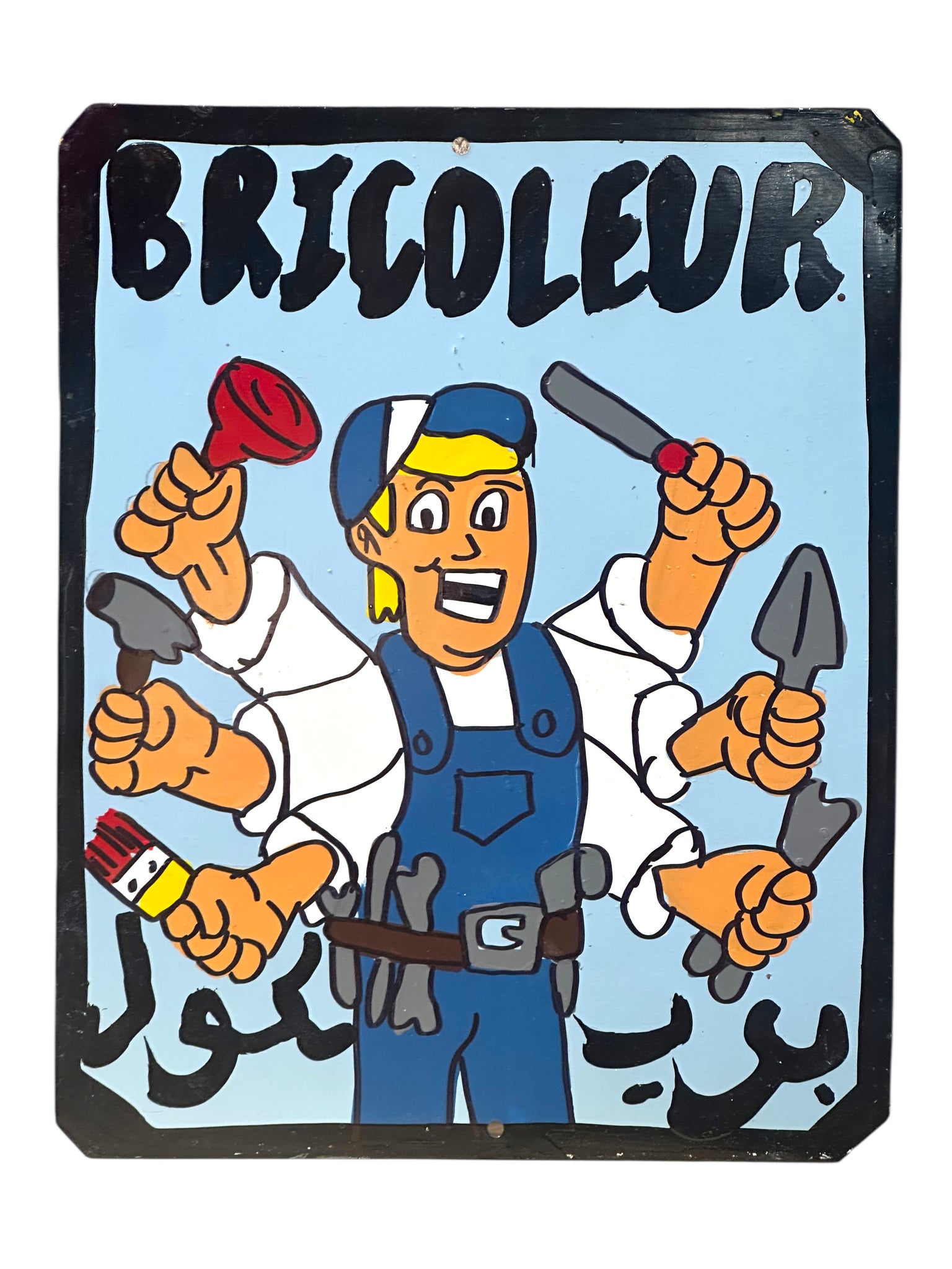 A cheerful tribute to the ultimate handyman, inspired by the iconic shop signs of the Marrakech Medina. This hand-painted tin sign shows a bricoleur in action, surrounded by tools, captured in a bold and playful naïve style.