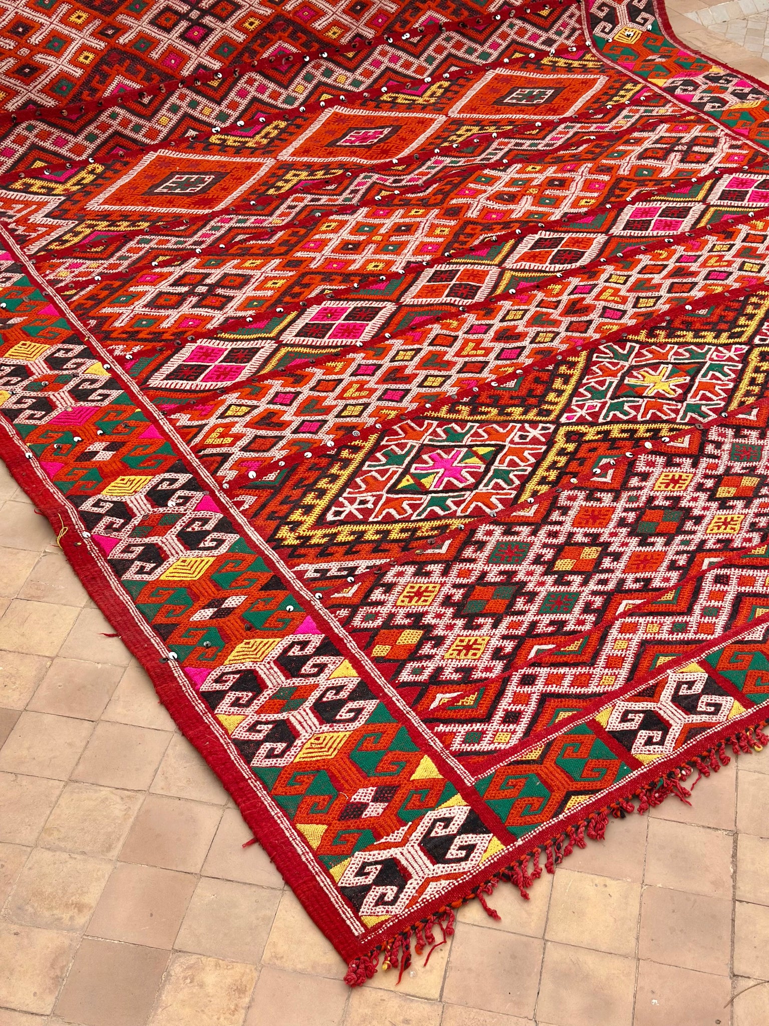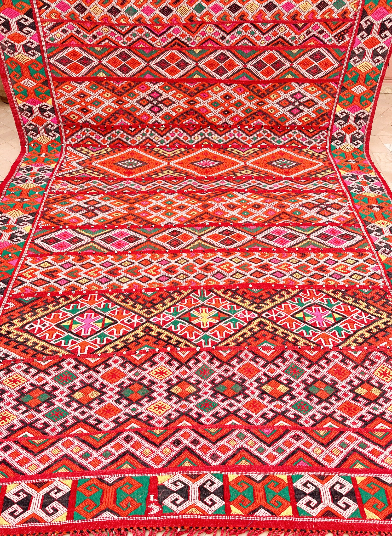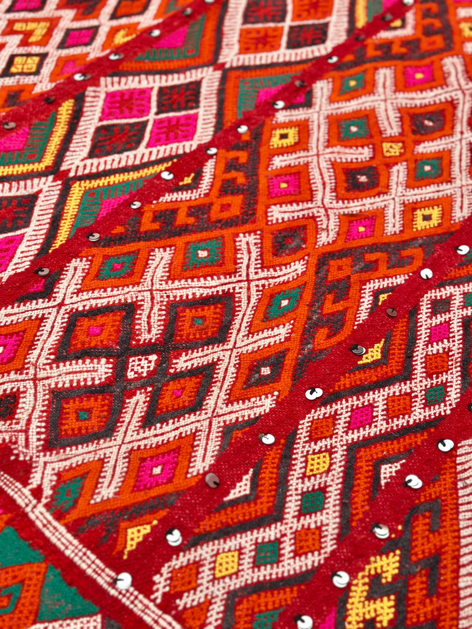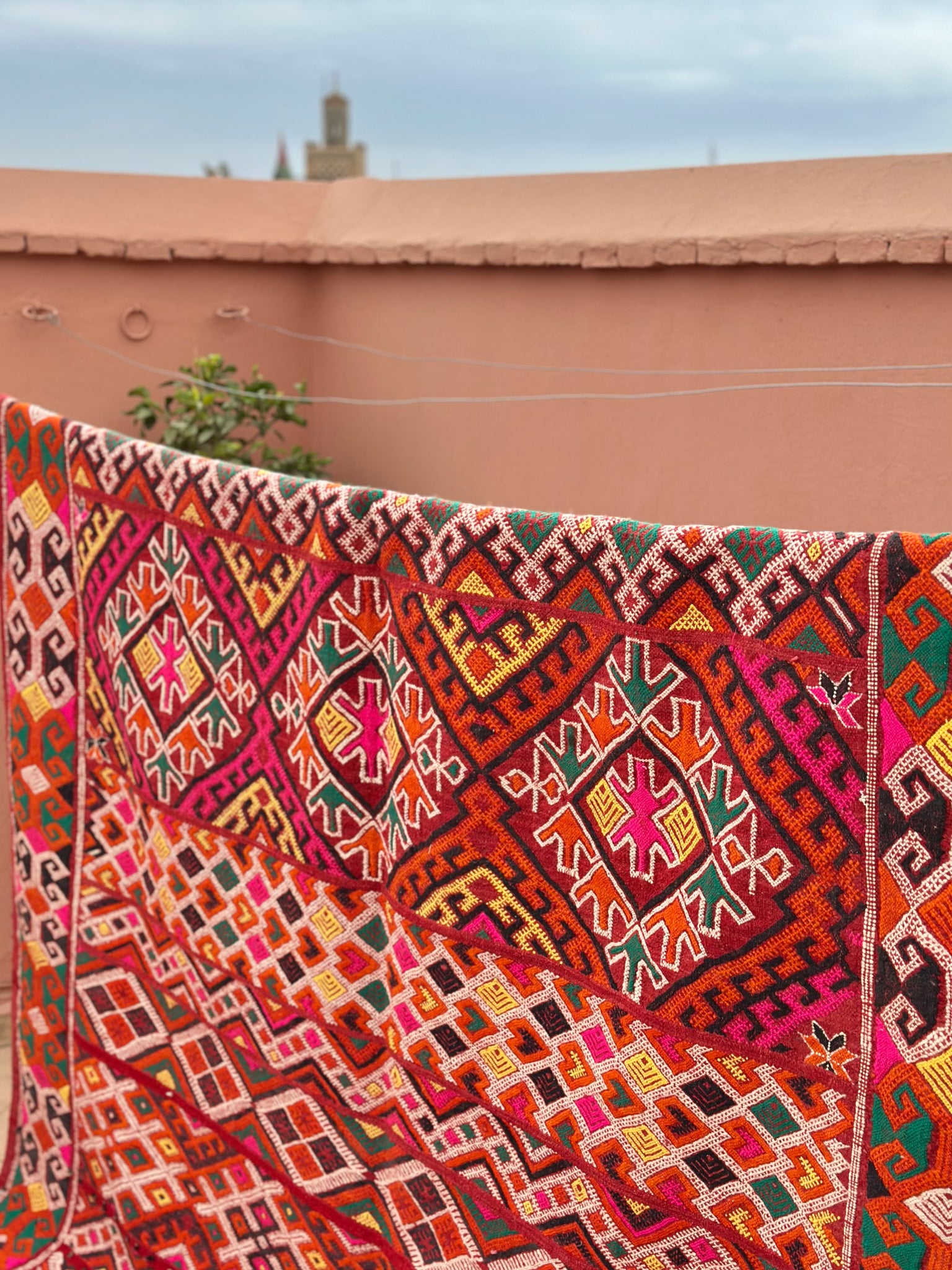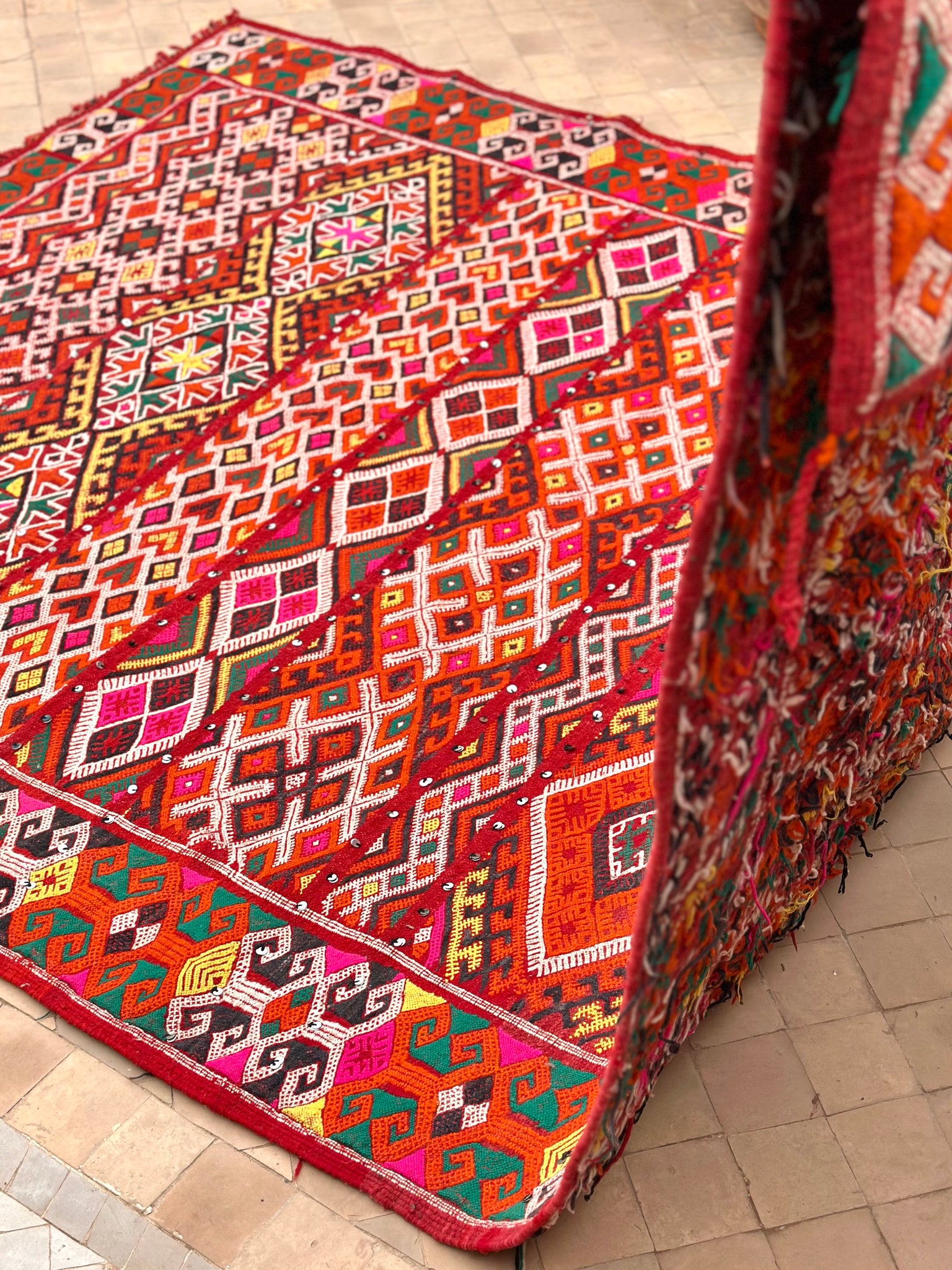 A true statement piece — this extraordinary Boujad Hanbel bursts with vibrant energy, woven in radiant shades of red, orange, fuchsia, green, yellow, and black. Its intricate embroidered motifs, geometric symbolism, and subtle sequin details create a dynamic tapestry that feels both traditional and boldly contemporary.