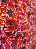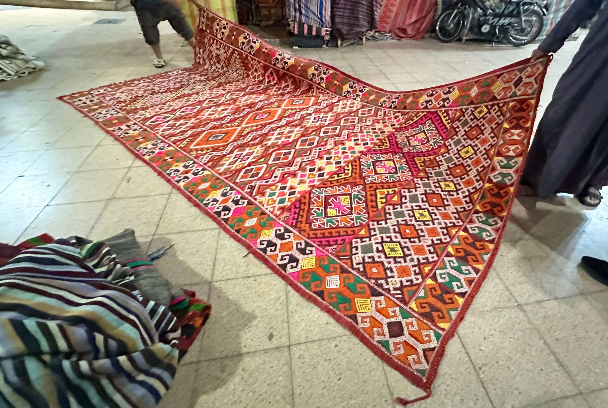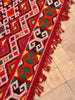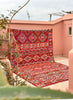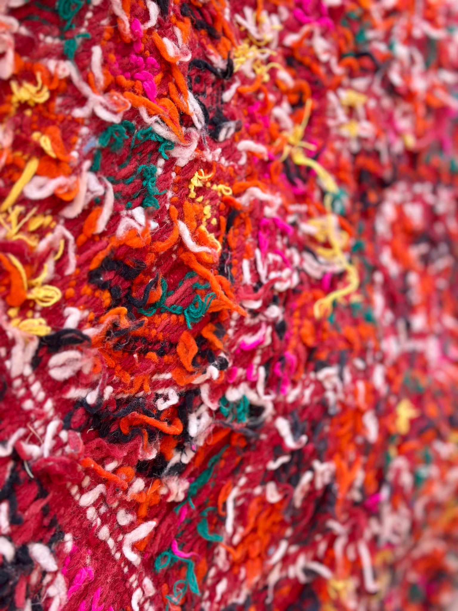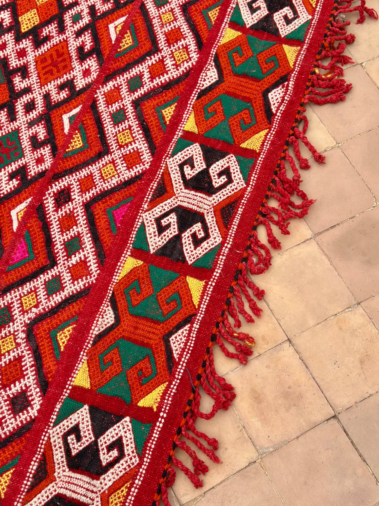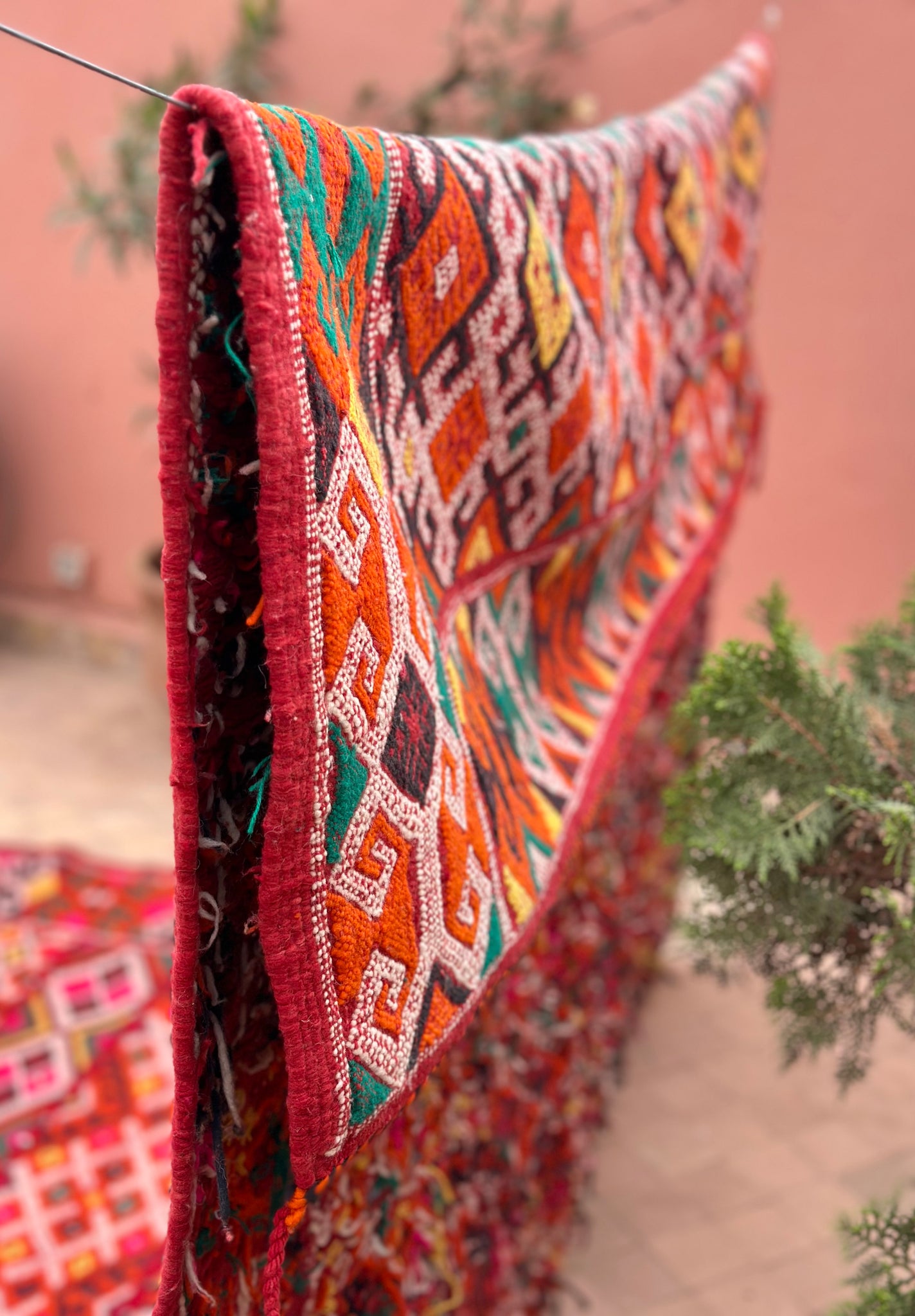 A true statement piece — this extraordinary Boujad Hanbel bursts with vibrant energy, woven in radiant shades of red, orange, fuchsia, green, yellow, and black. Its intricate embroidered motifs, geometric symbolism, and subtle sequin details create a dynamic tapestry that feels both traditional and boldly contemporary.