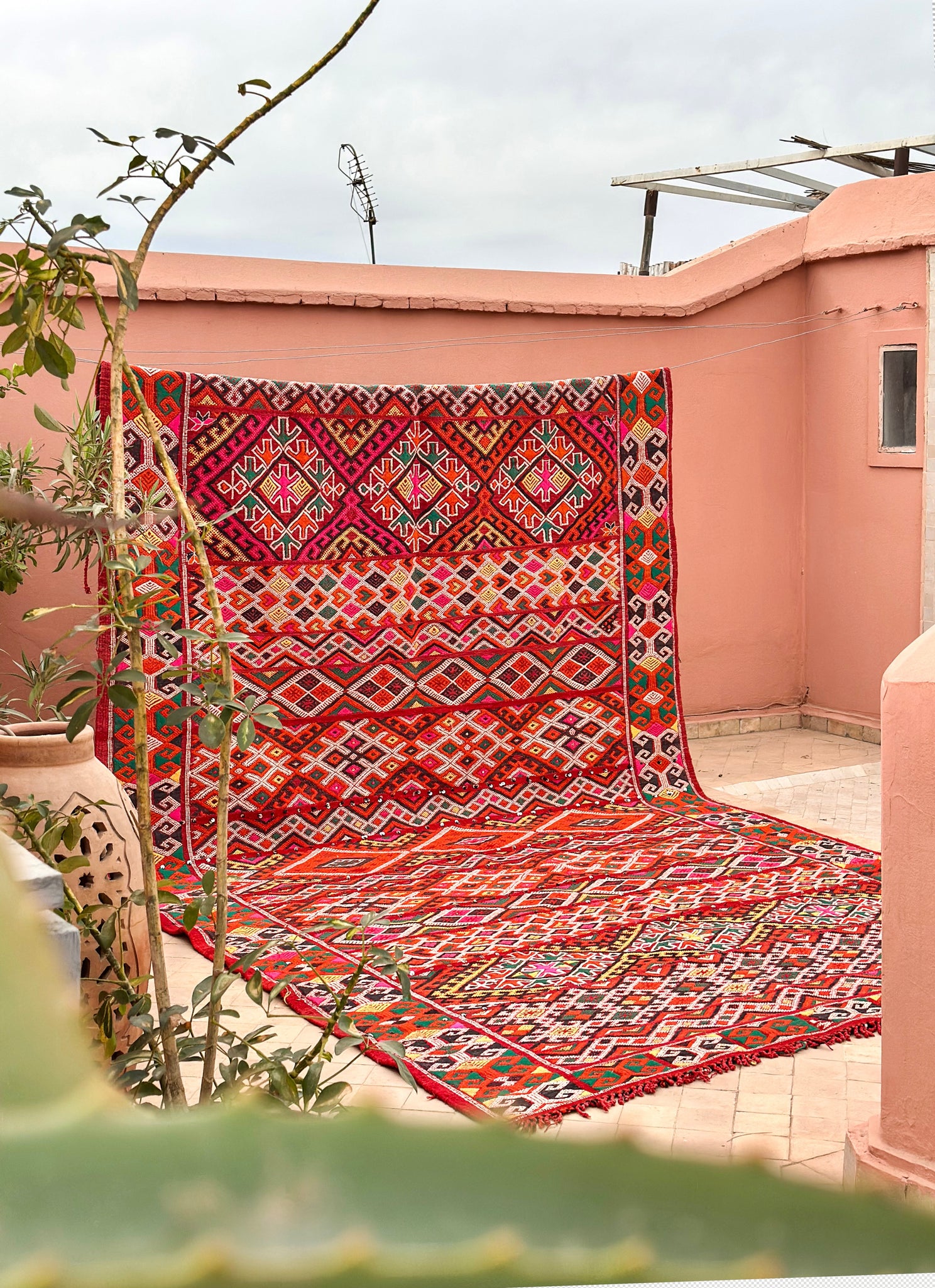 Photographed on a Marrakech rooftop, this large flatweave radiates warmth, craftsmanship, and cultural richness — a collectible textile that transforms any space, whether styled on the floor or hung as art.