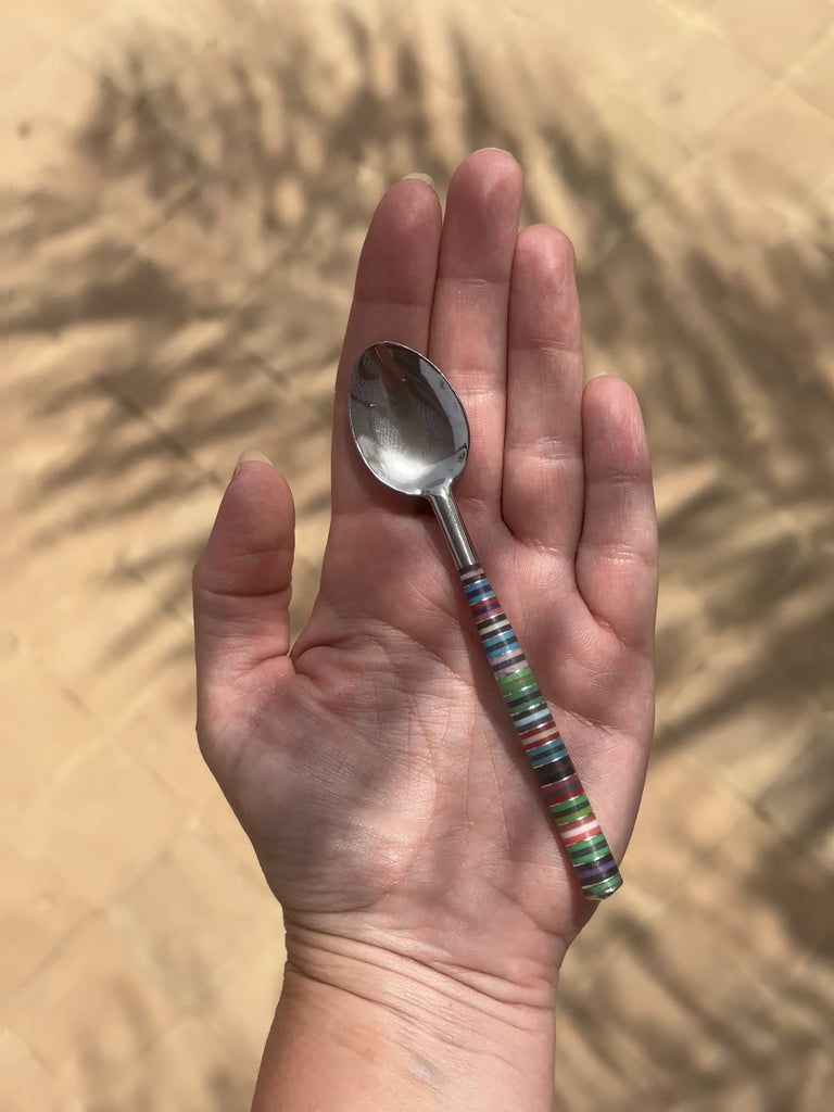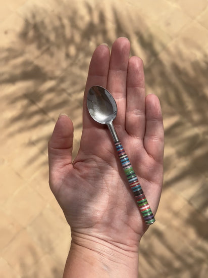 These iconic, colourful Moroccan teaspoons each feature a slightly different striped resin and metal handle.