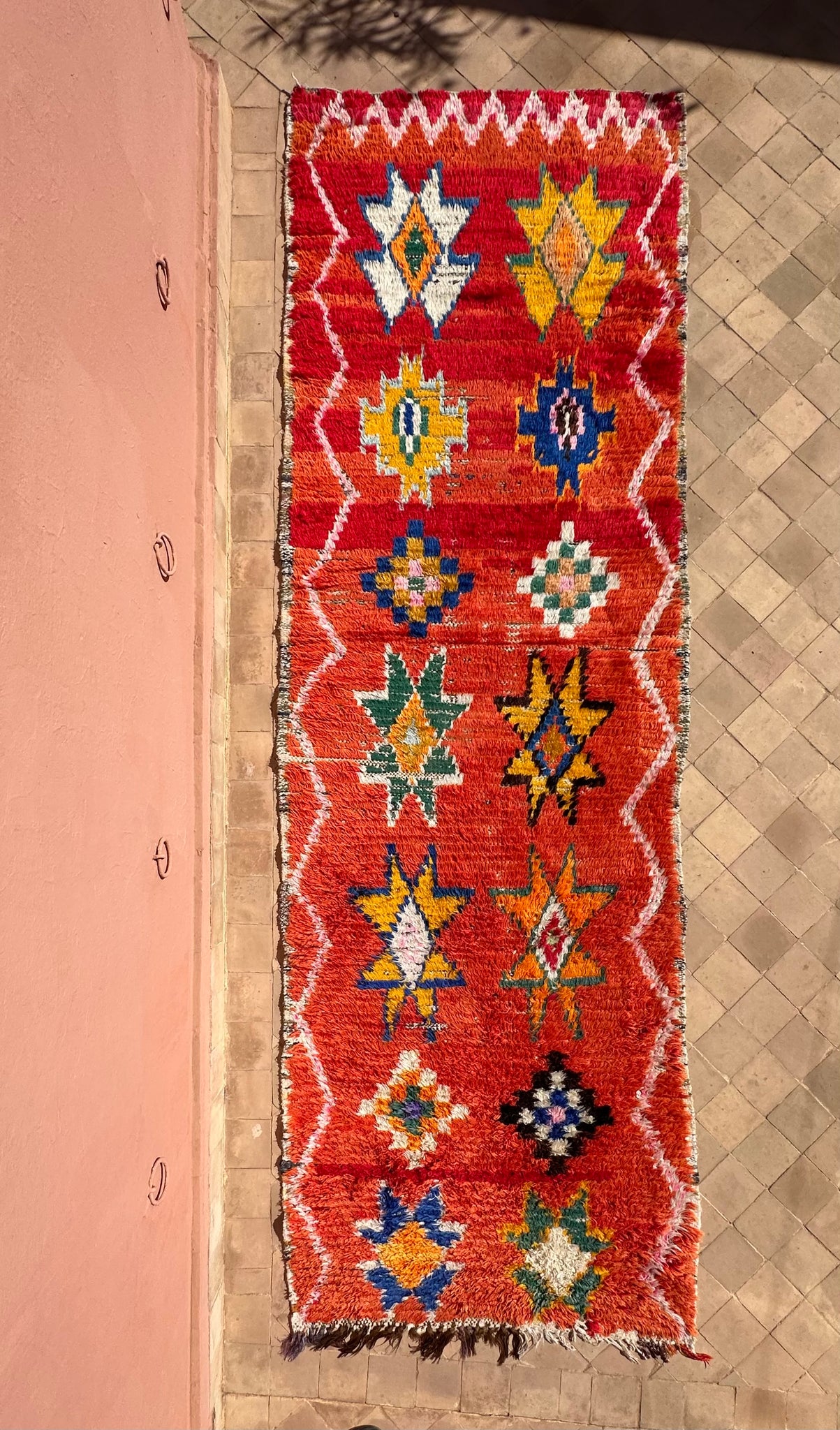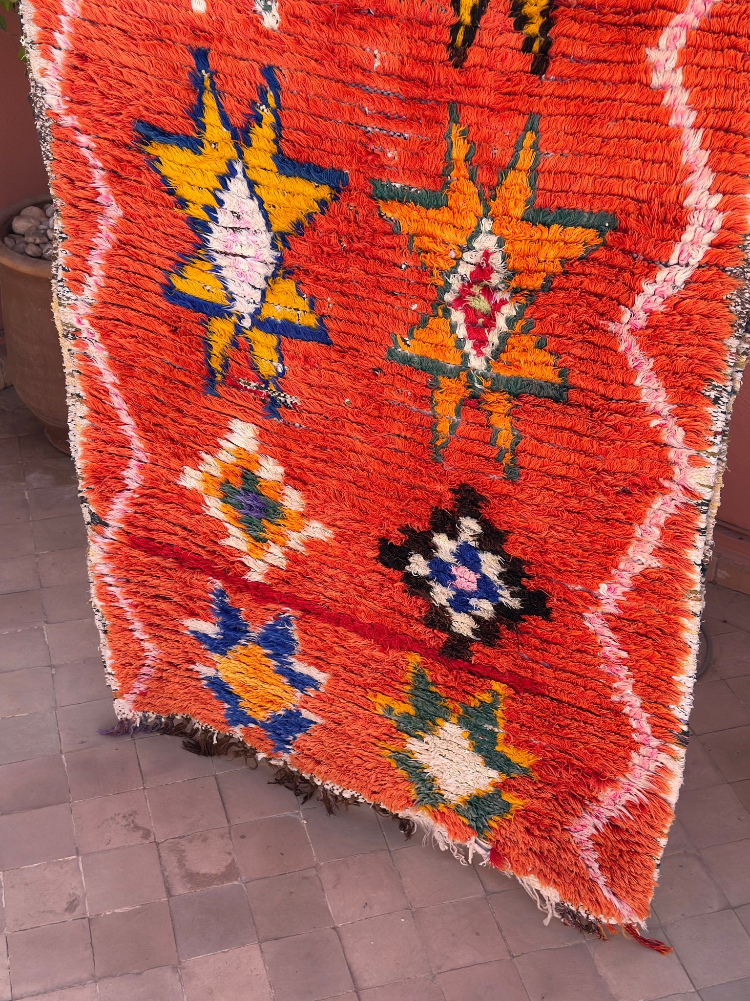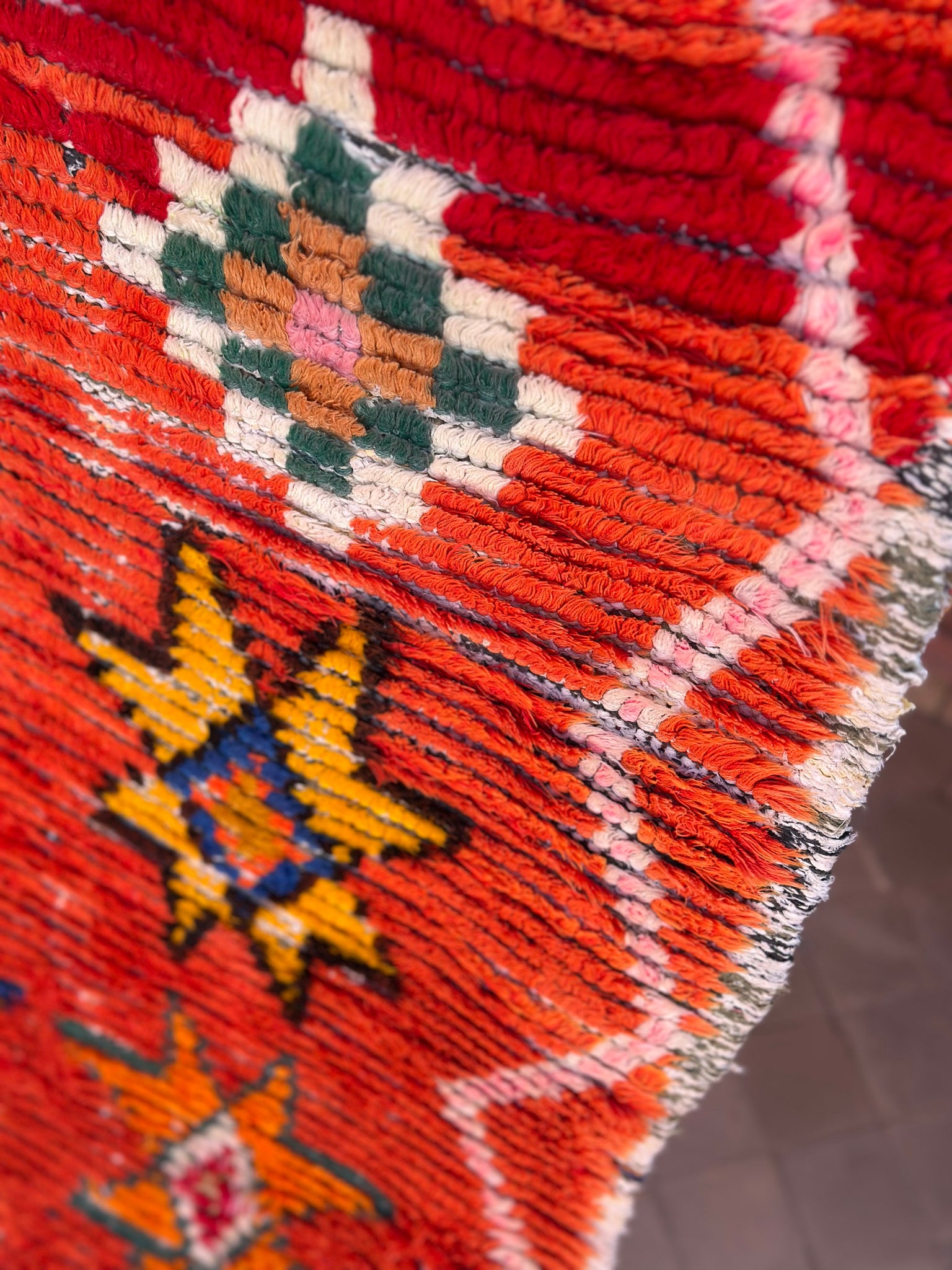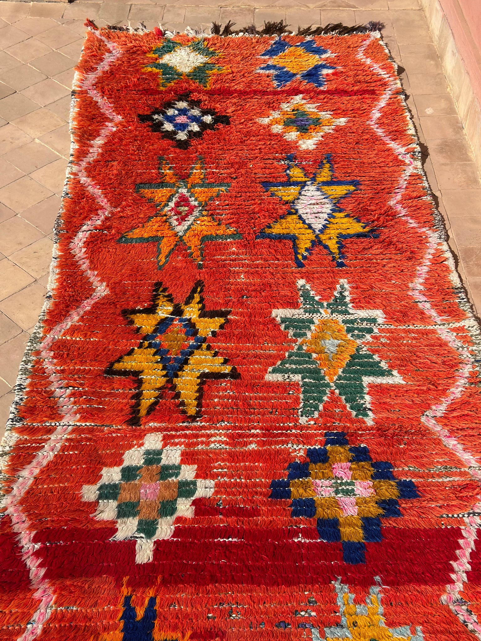 This vibrant boucherouite is all about energy and emotion: bold star-like motifs in saffron yellow, emerald green, inky blue and bright ivory dance across the surface, each one unique, each one carrying the joyful spontaneity of handwoven craft. Soft pink and white wave lines frame the composition like gentle brushstrokes, giving the entire piece movement and rhythm.