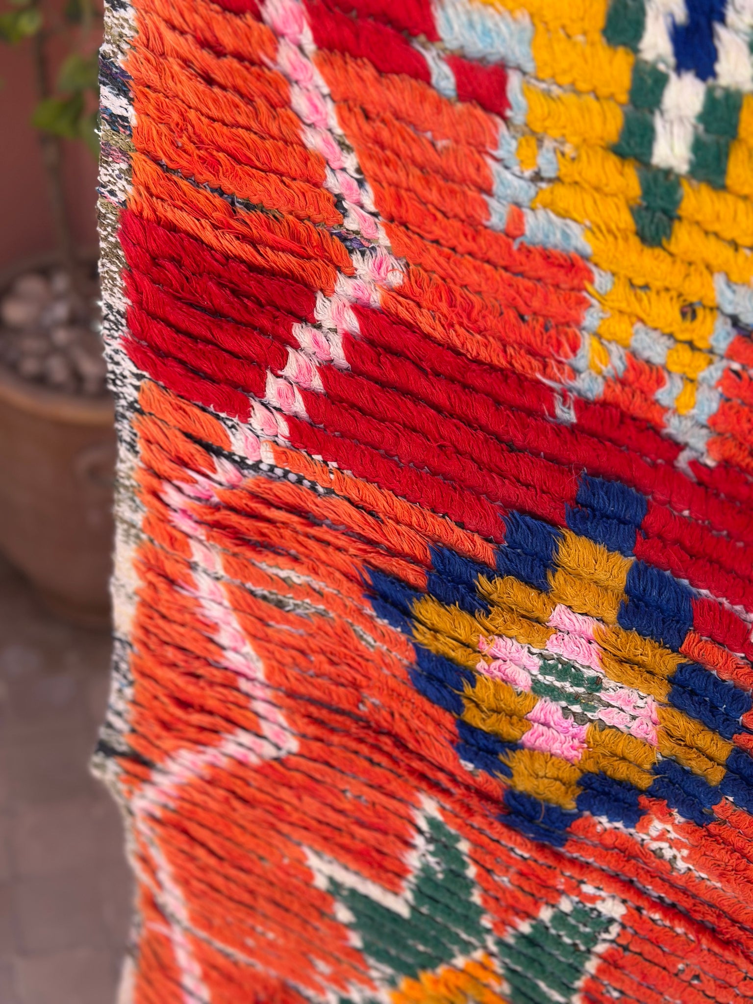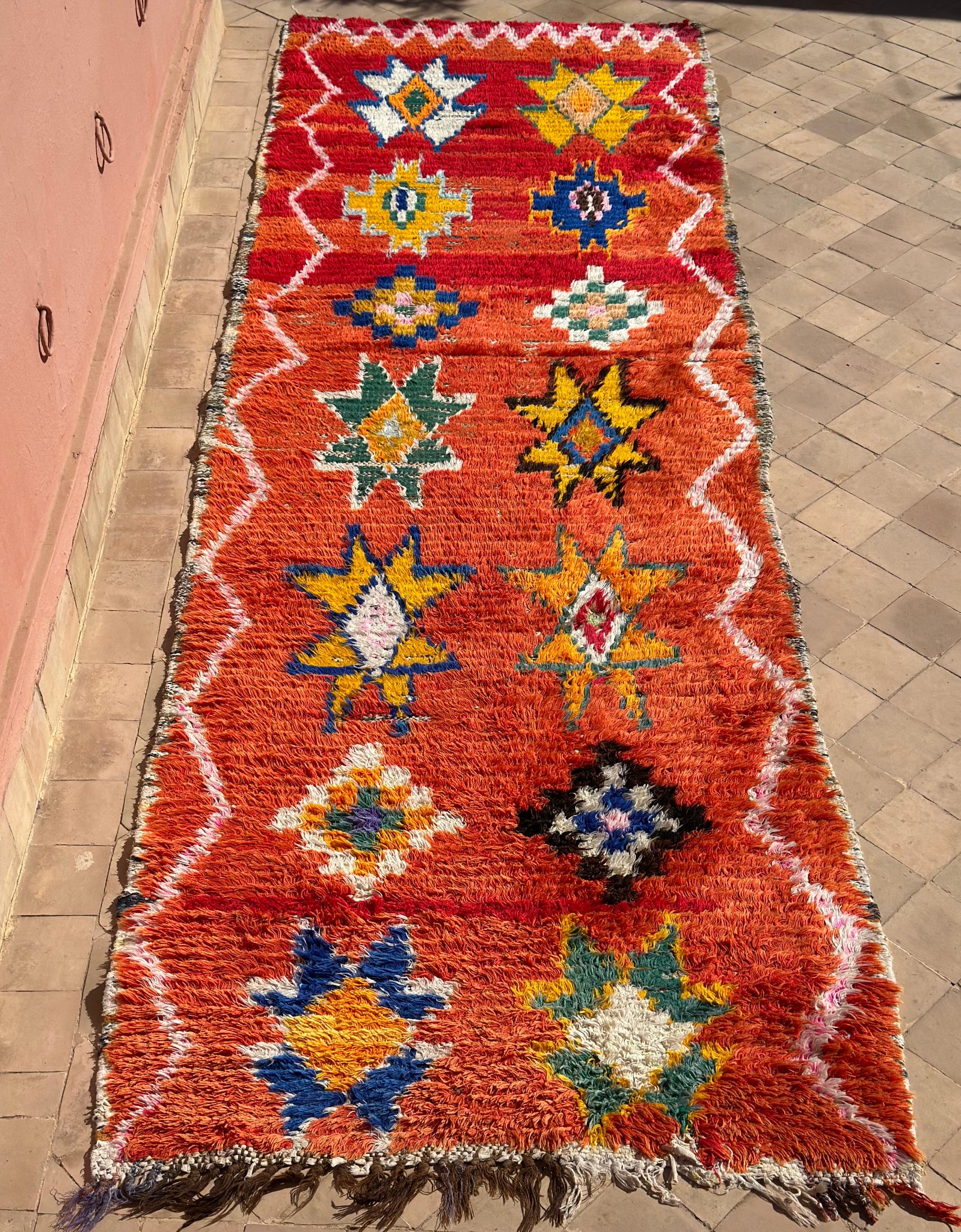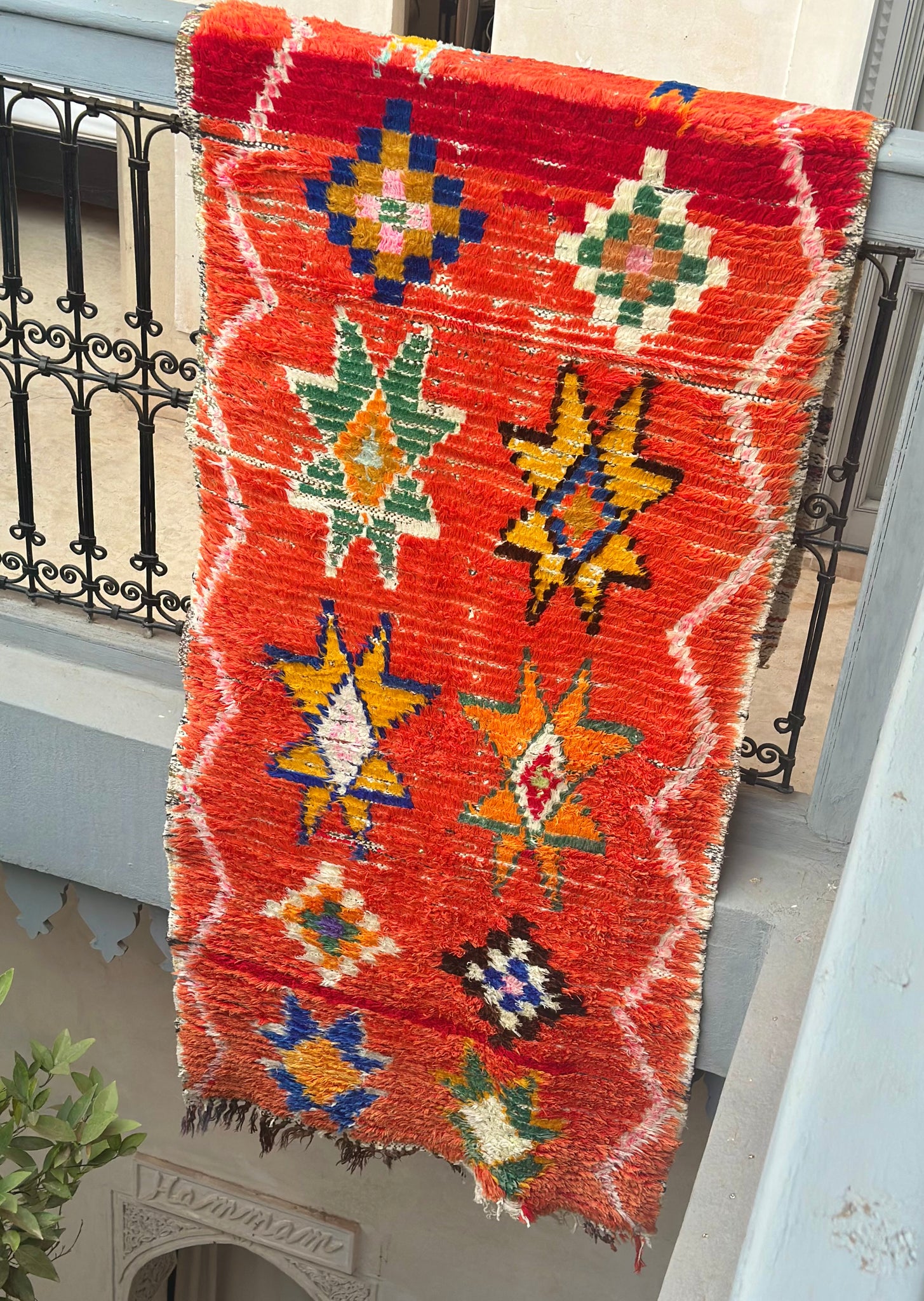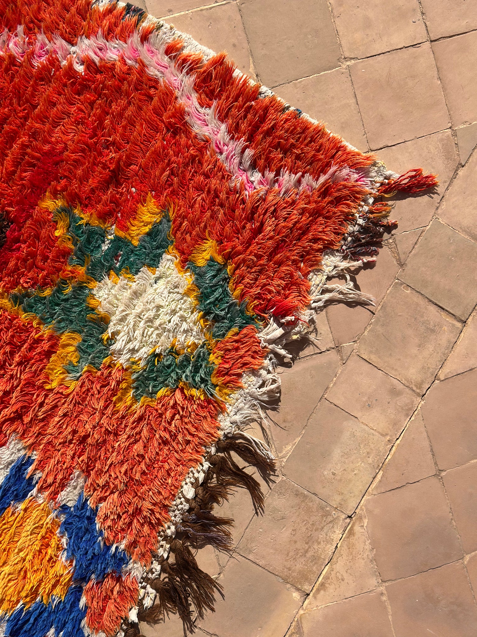 This vibrant boucherouite is all about energy and emotion: bold star-like motifs in saffron yellow, emerald green, inky blue and bright ivory dance across the surface, each one unique, each one carrying the joyful spontaneity of handwoven craft. Soft pink and white wave lines frame the composition like gentle brushstrokes, giving the entire piece movement and rhythm.