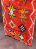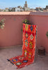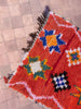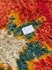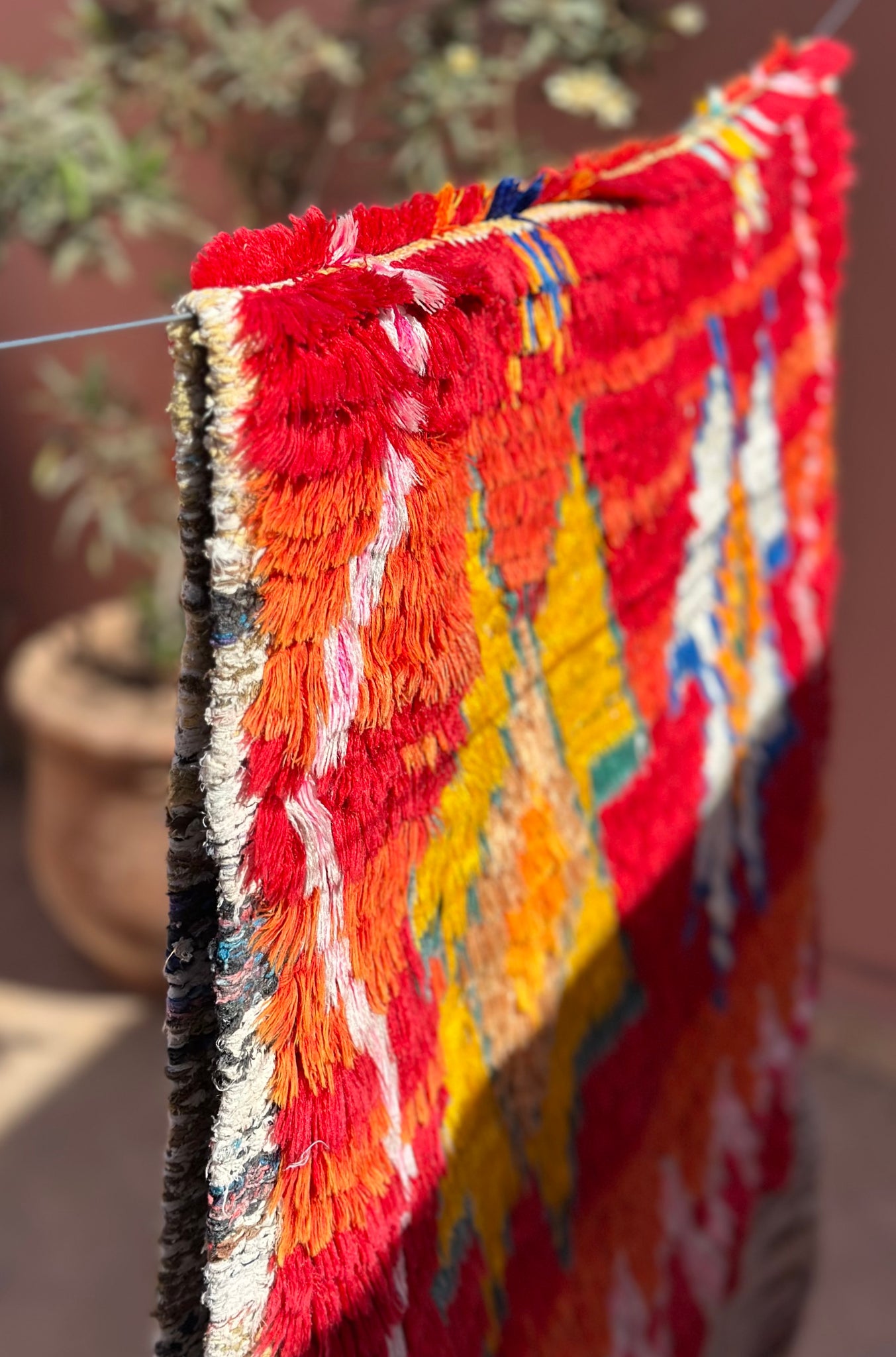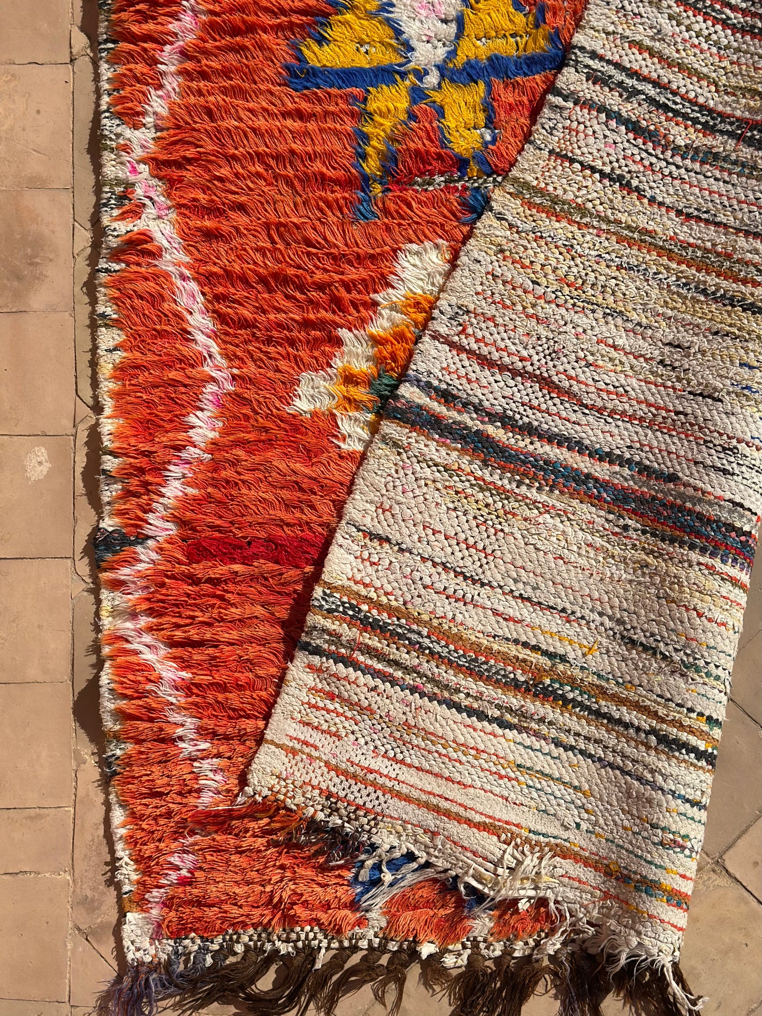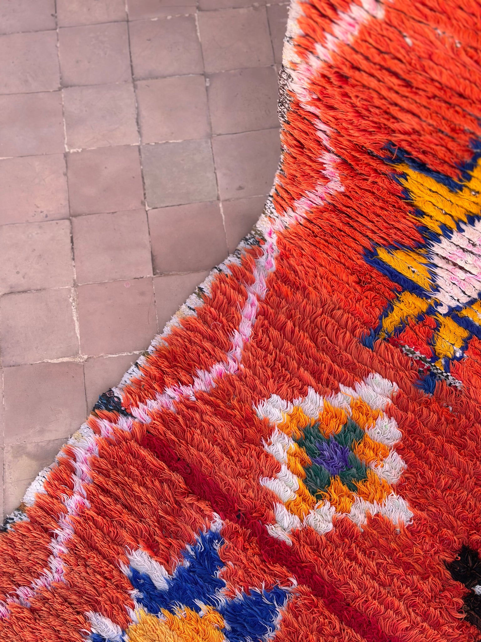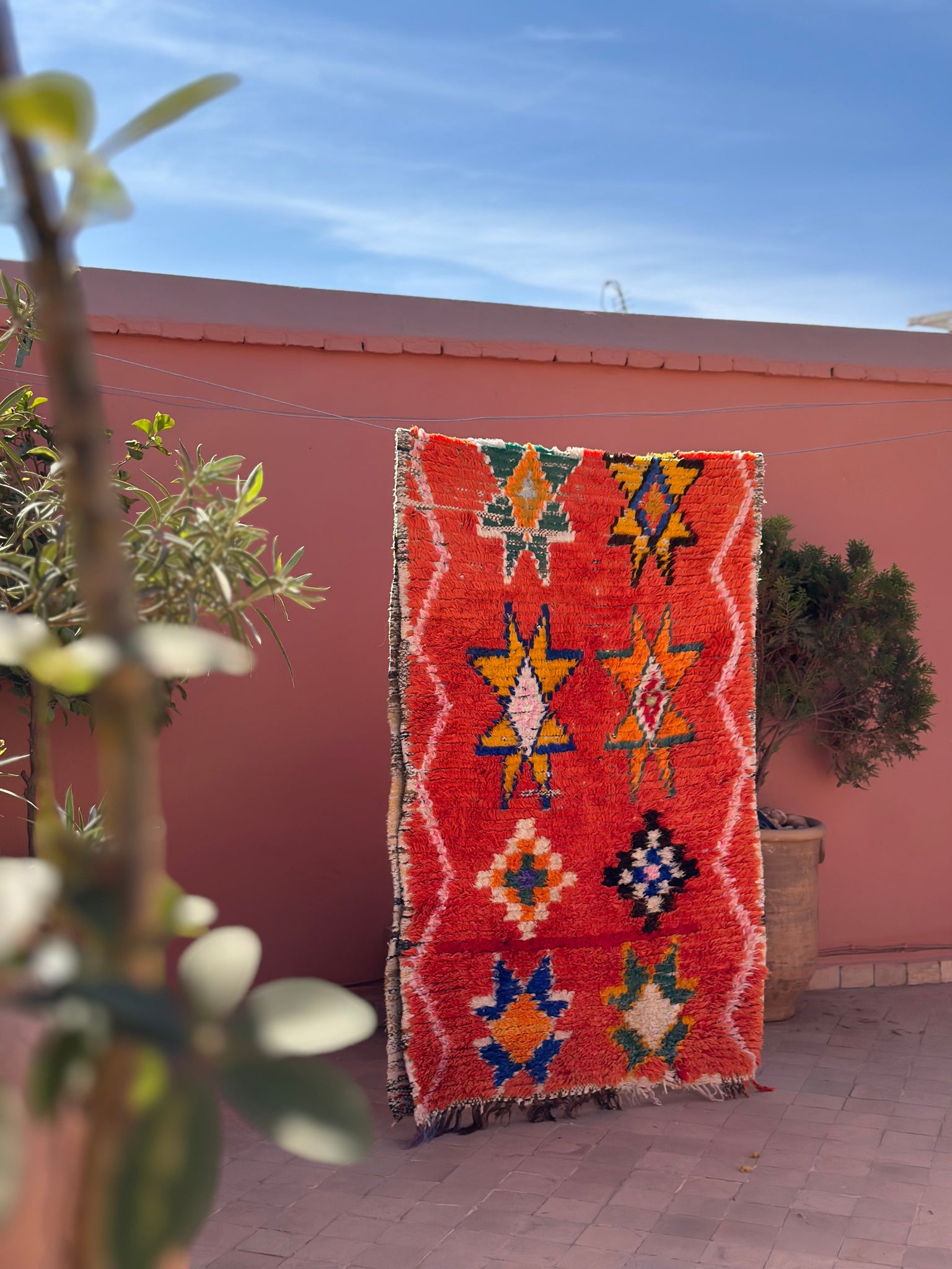 This vibrant boucherouite is all about energy and emotion: bold star-like motifs in saffron yellow, emerald green, inky blue and bright ivory dance across the surface, each one unique, each one carrying the joyful spontaneity of handwoven craft. Soft pink and white wave lines frame the composition like gentle brushstrokes, giving the entire piece movement and rhythm.
