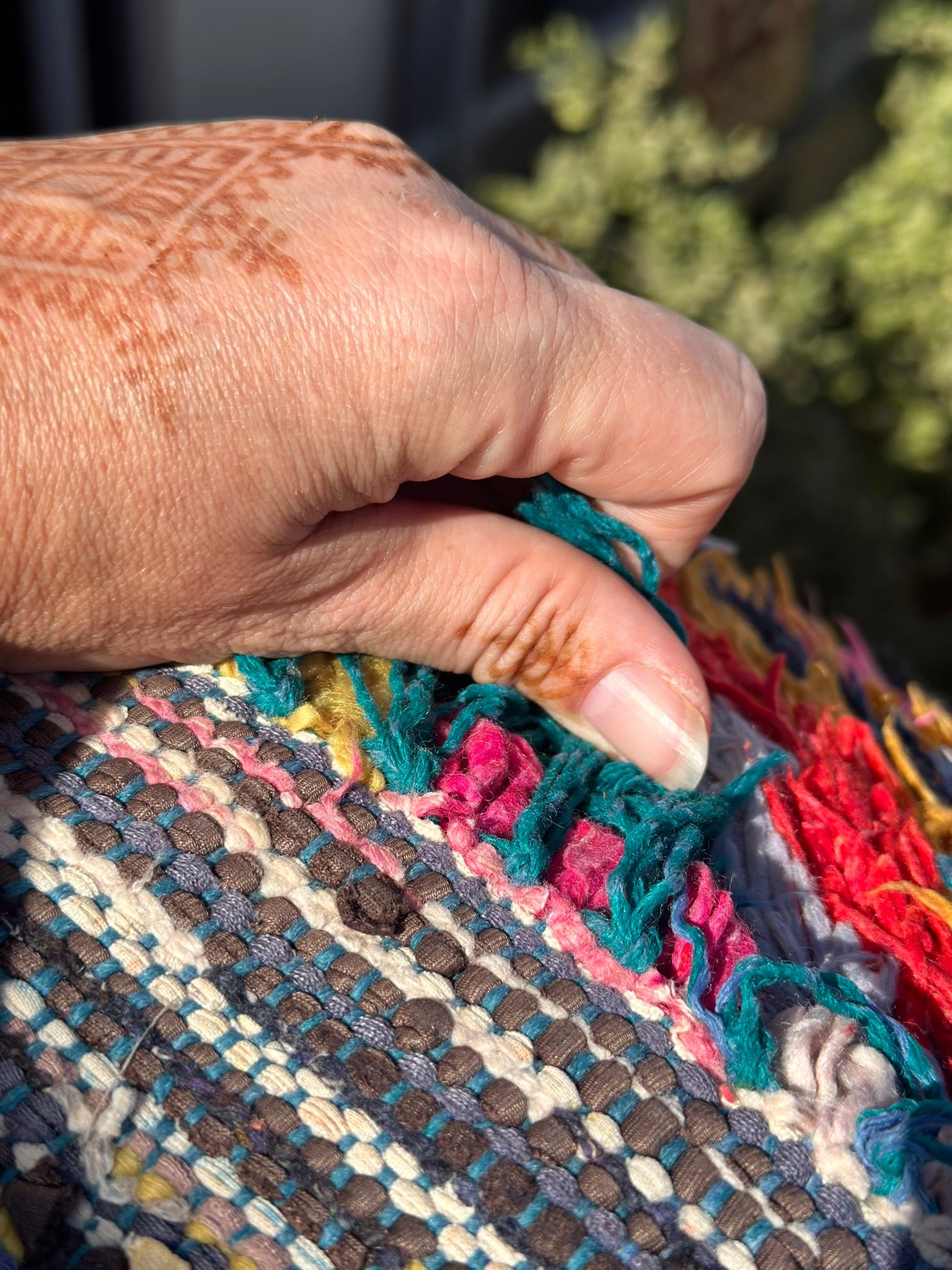 - Handwoven from recycled textiles — colourful cotton, wool, mixed fibres
