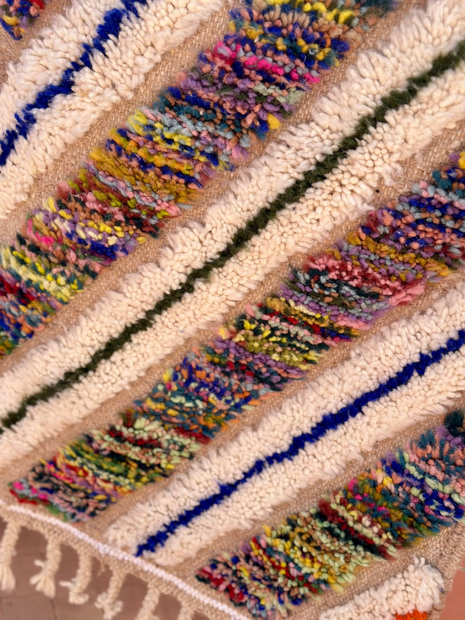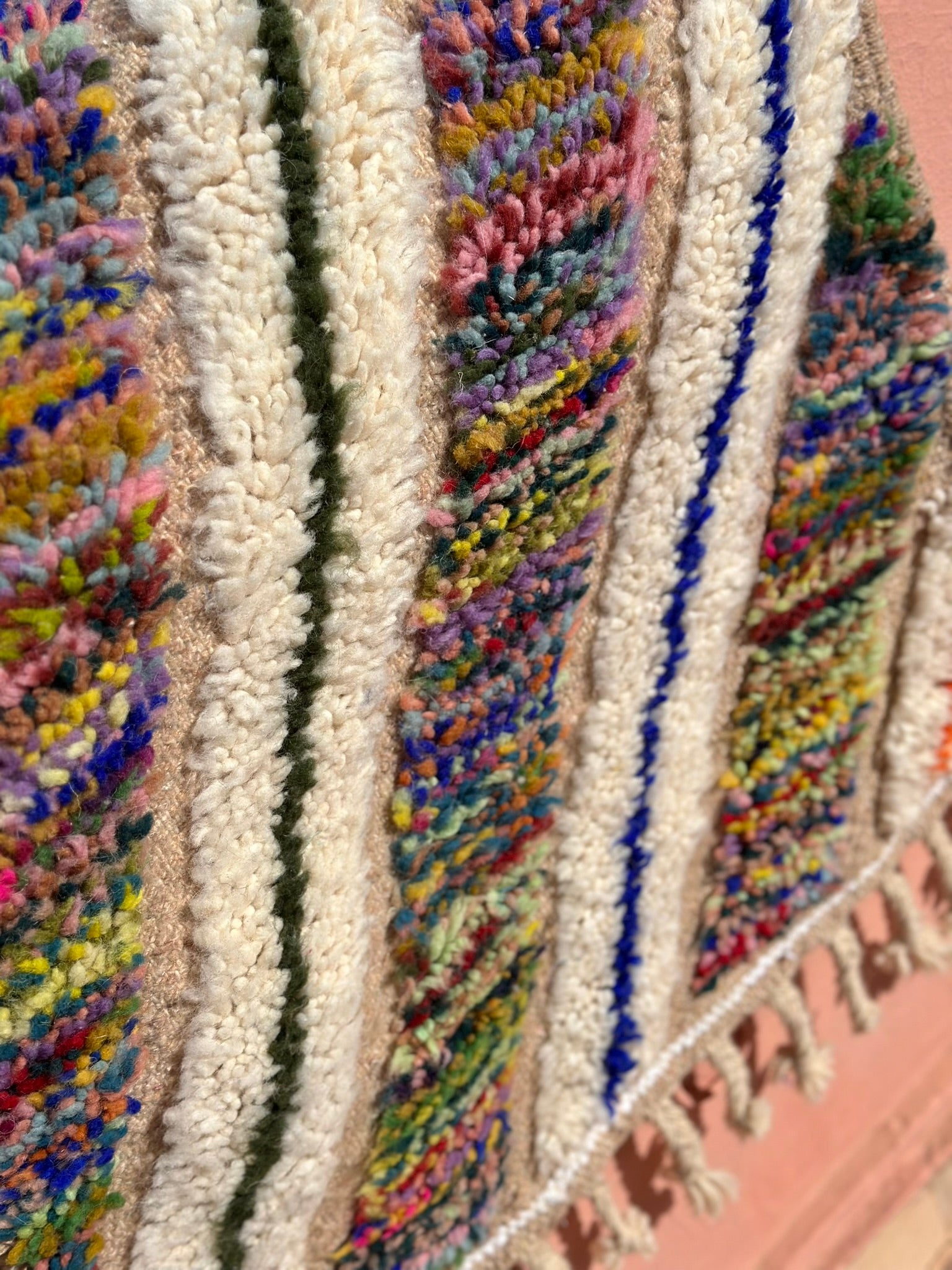 Handwoven from pure wool in Morocco, these pieces combine traditional Berber symbolism with modern spontaneity.