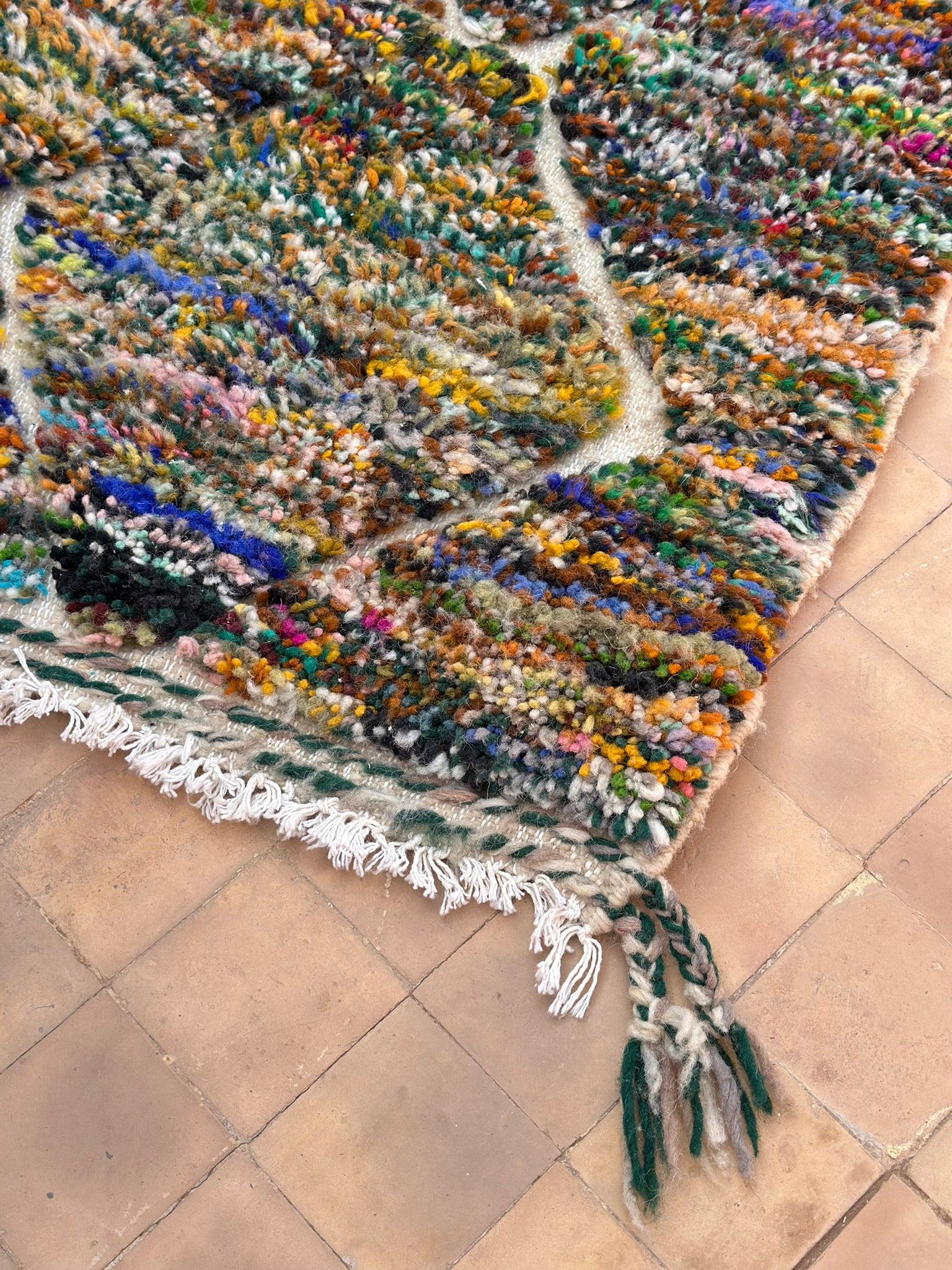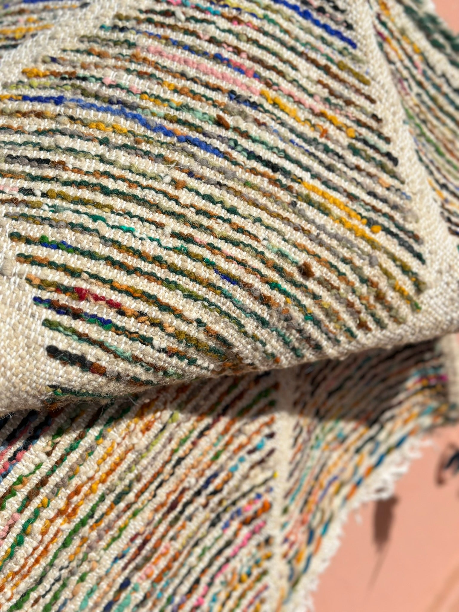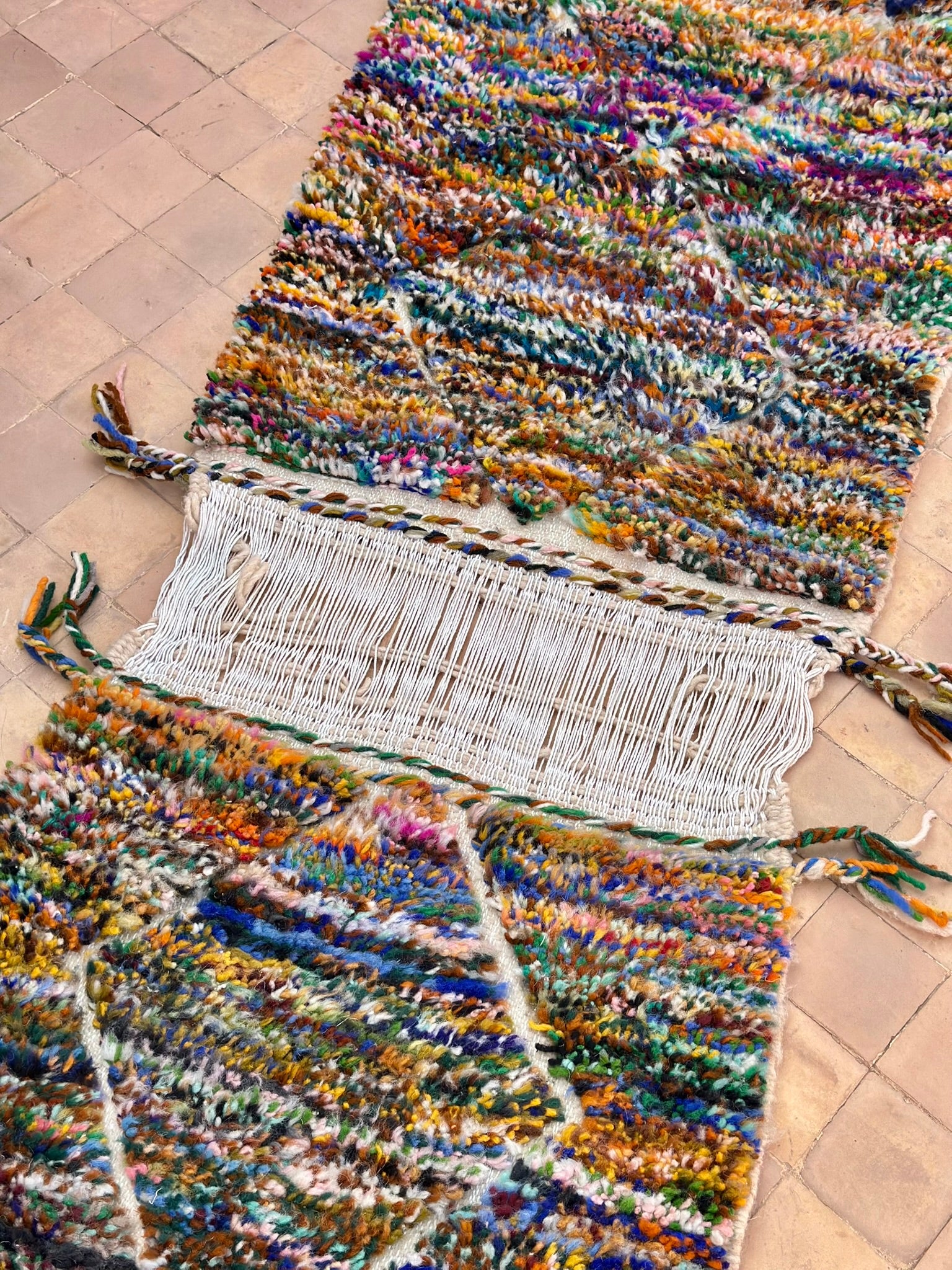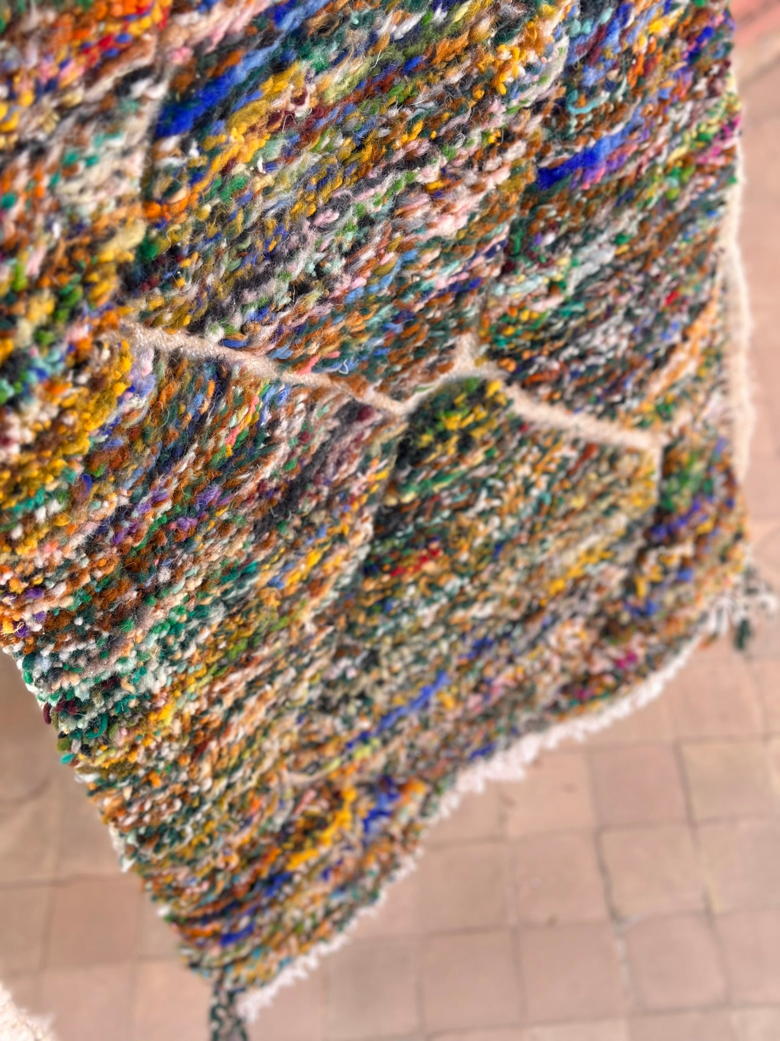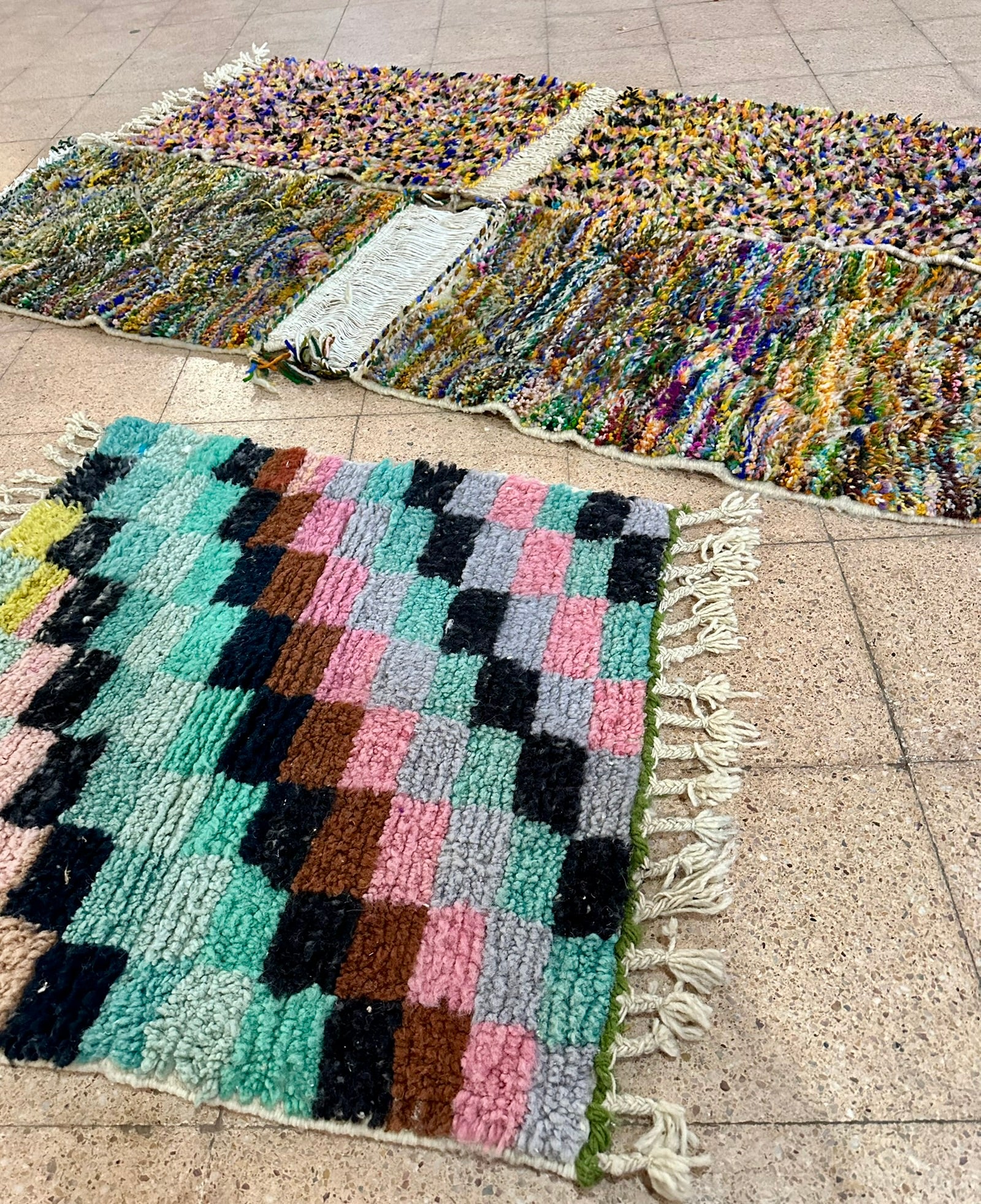A rare find straight from the artisan’s loom — our Twin Boujad Minis are woven in pairs, exactly as the maâlems create them in the Atlas villages. Still attached when sourced, each duo is carefully separated and hand-finished in our atelier, preserving their authentic woven connection while transforming them into two adorable individual rugs.