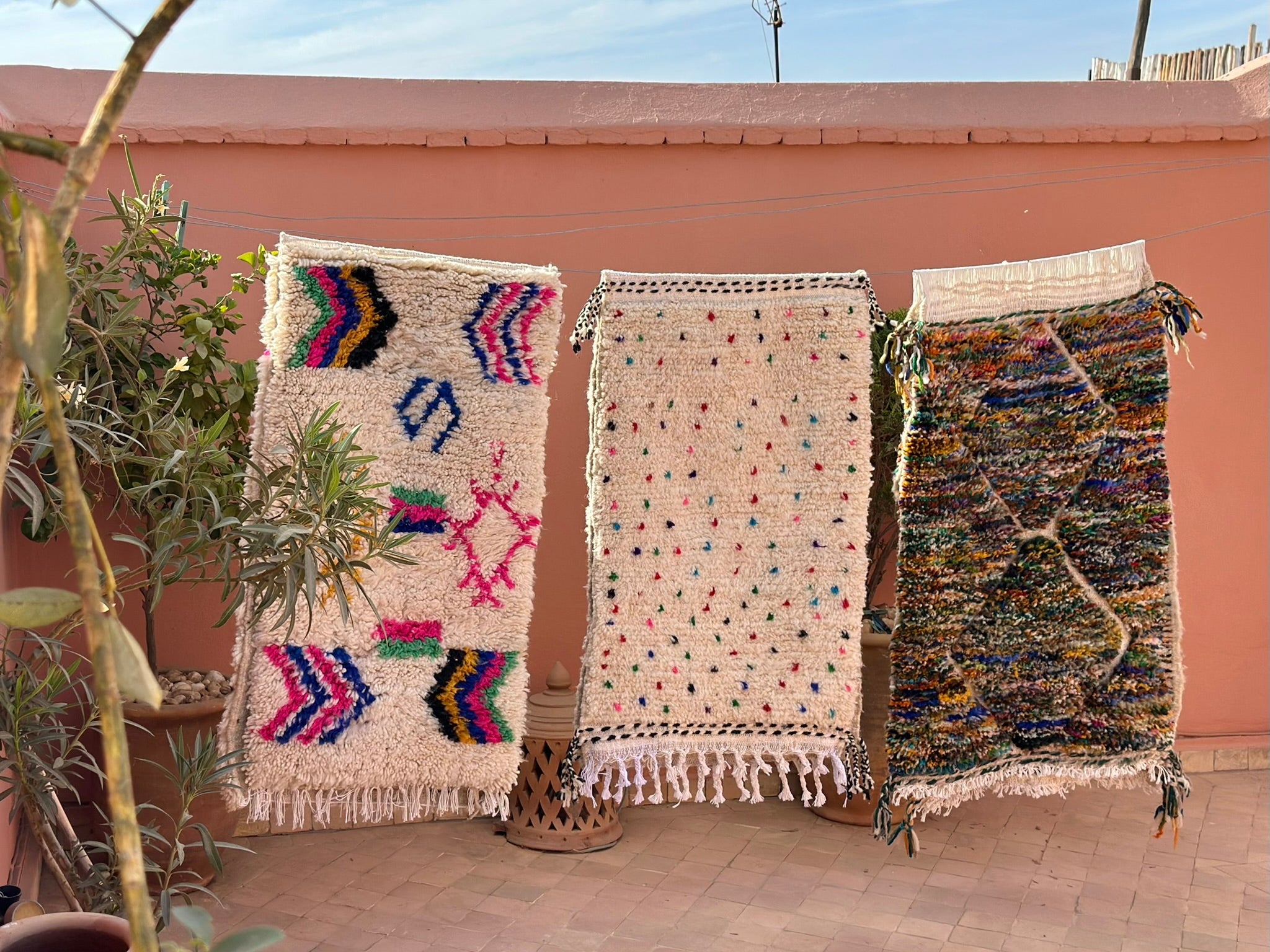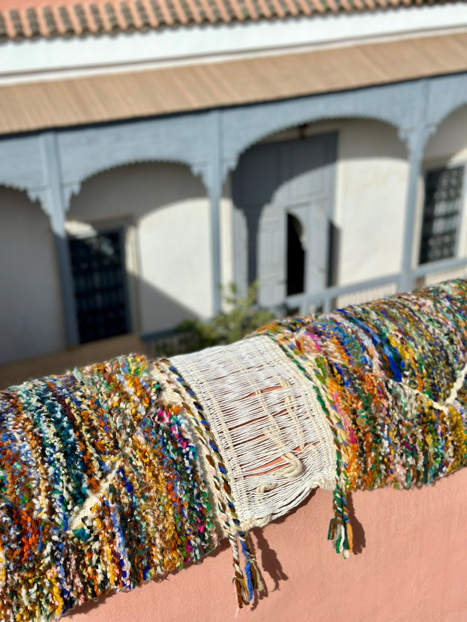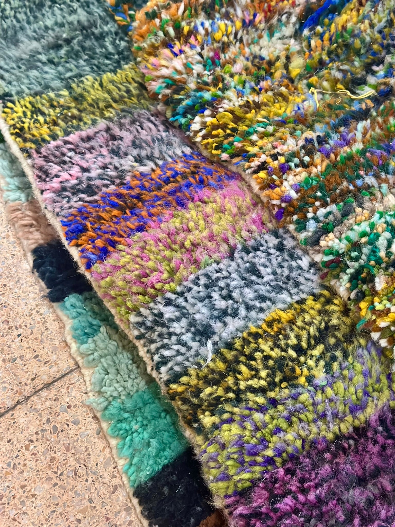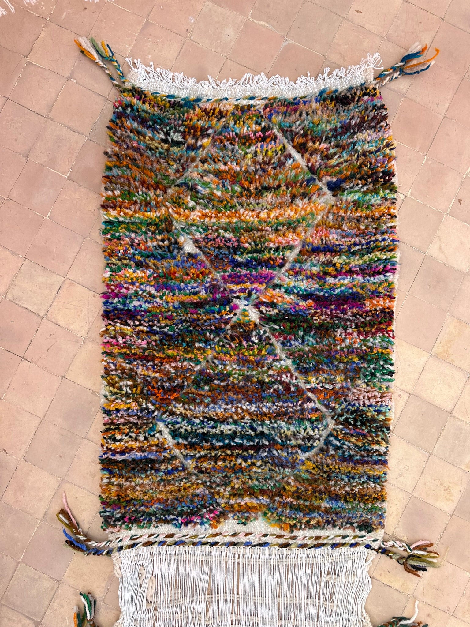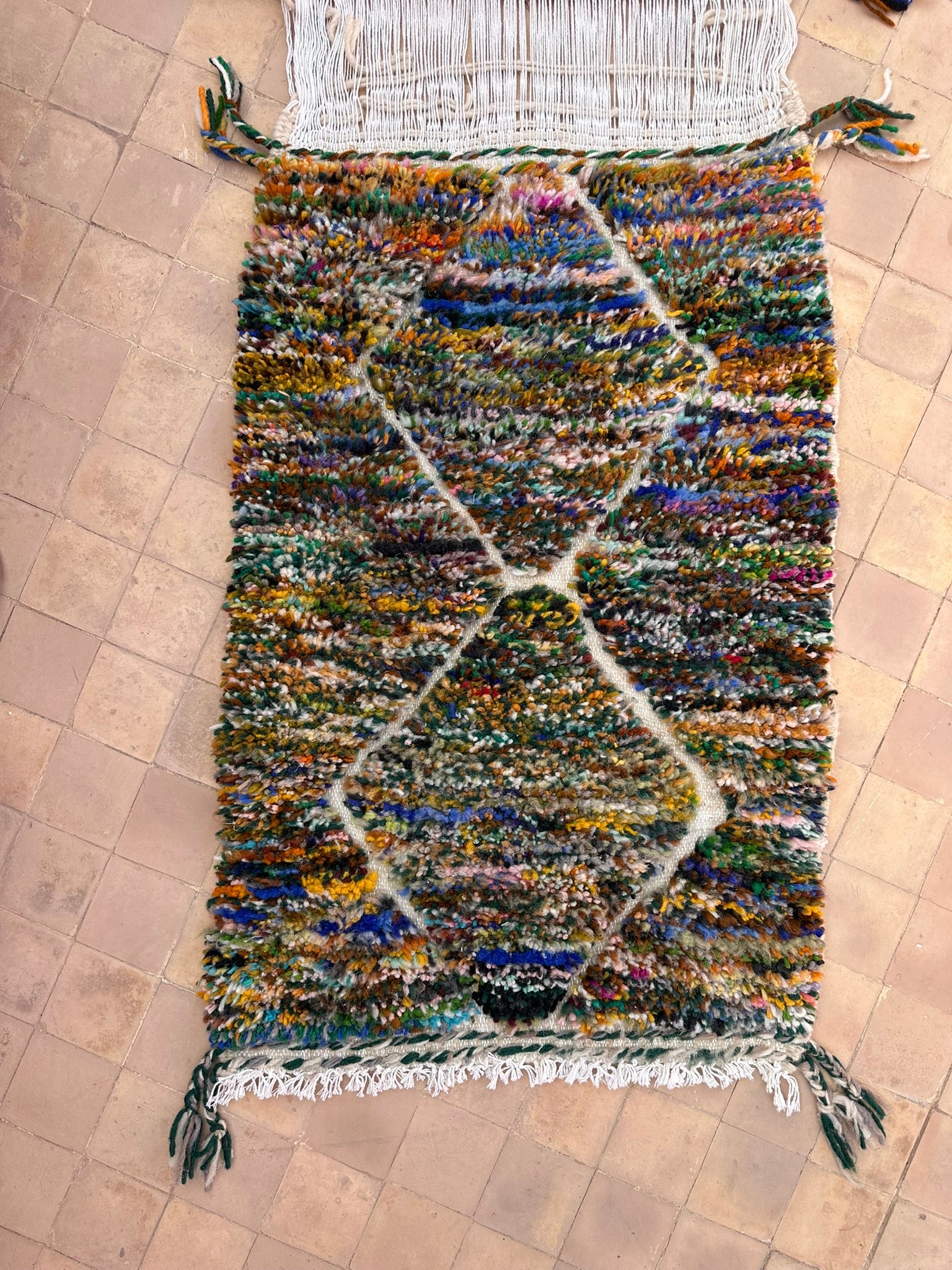 A rare find straight from the artisan’s loom — our Twin Boujad Minis are woven in pairs, exactly as the maâlems create them in the Atlas villages. Still attached when sourced, each duo is carefully separated and hand-finished in our atelier, preserving their authentic woven connection while transforming them into two adorable individual rugs.