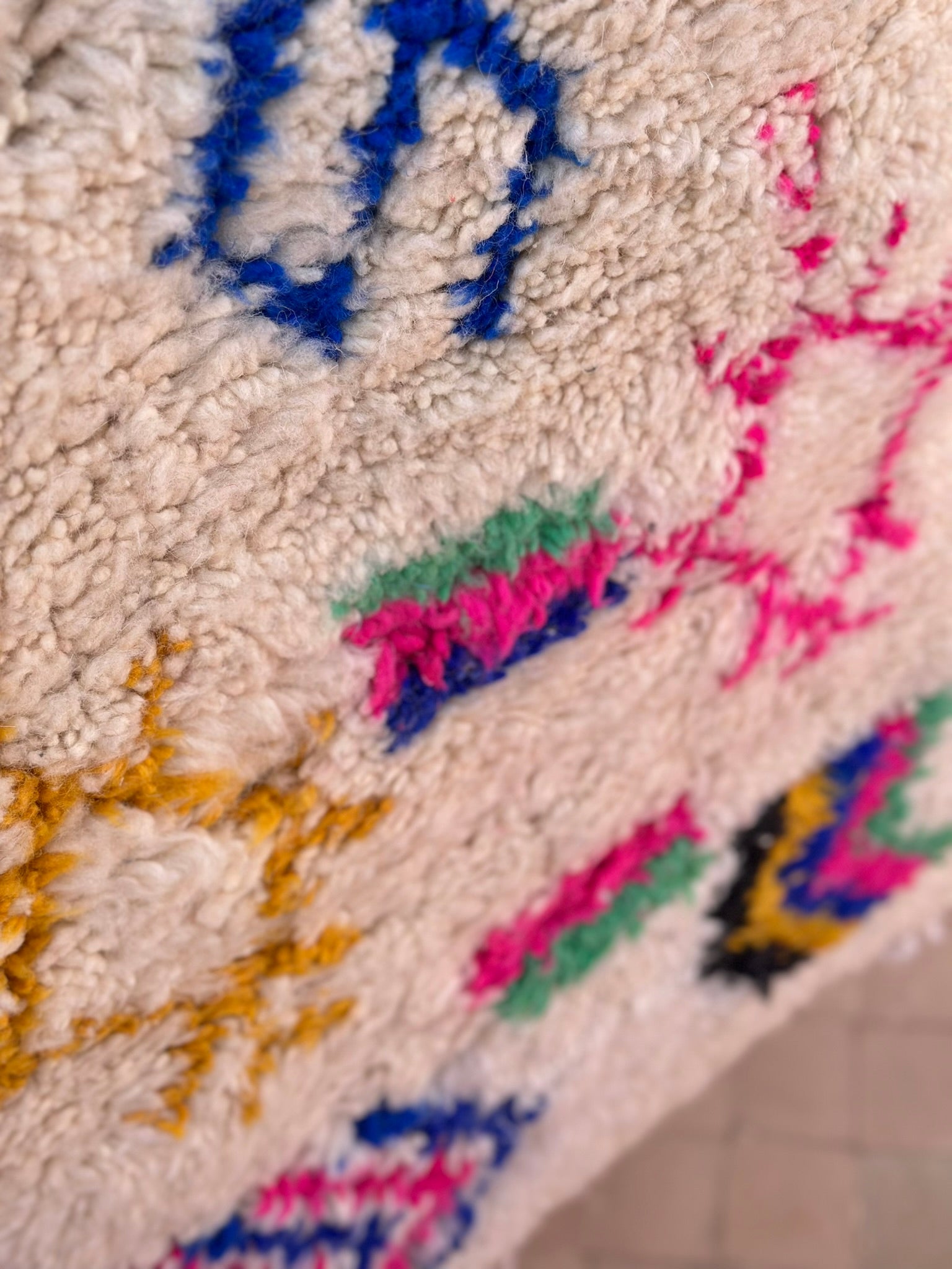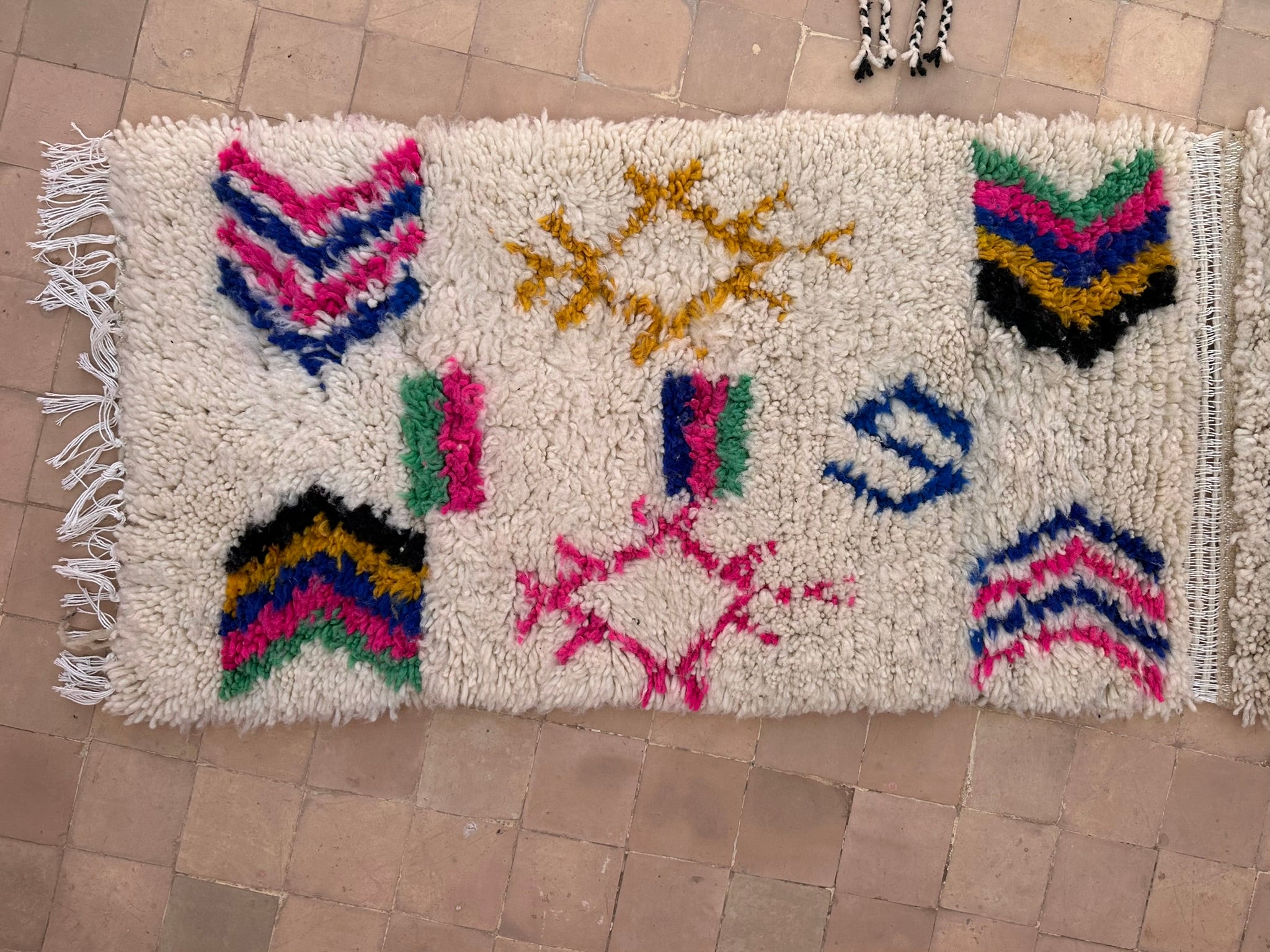 Soft cream wool decorated with playful Berber motifs in bright pink, mustard, black and cobalt. Each symbol carries a hint of tradition, protection and storytelling — two mini rugs that feel like modern talismans.