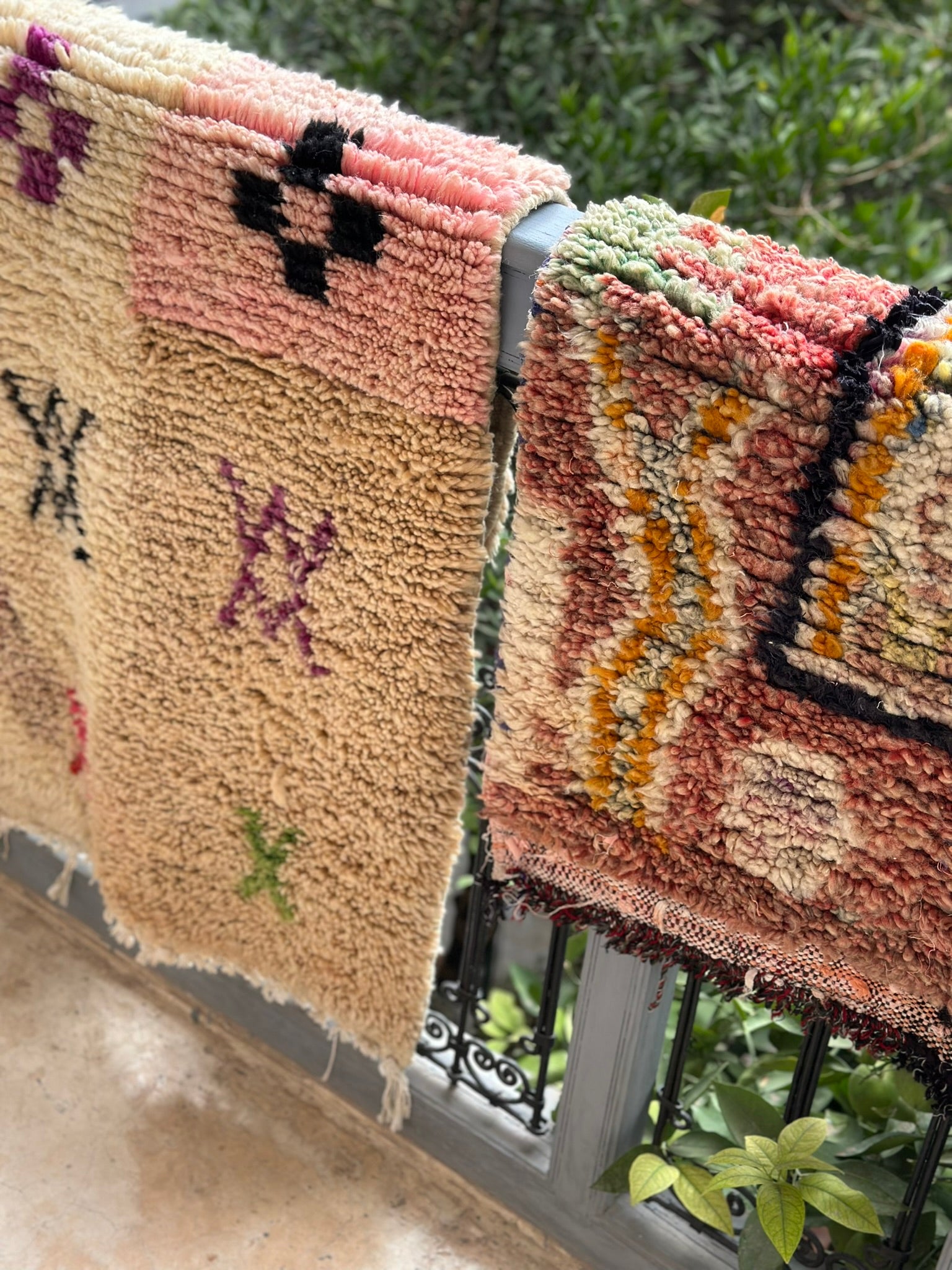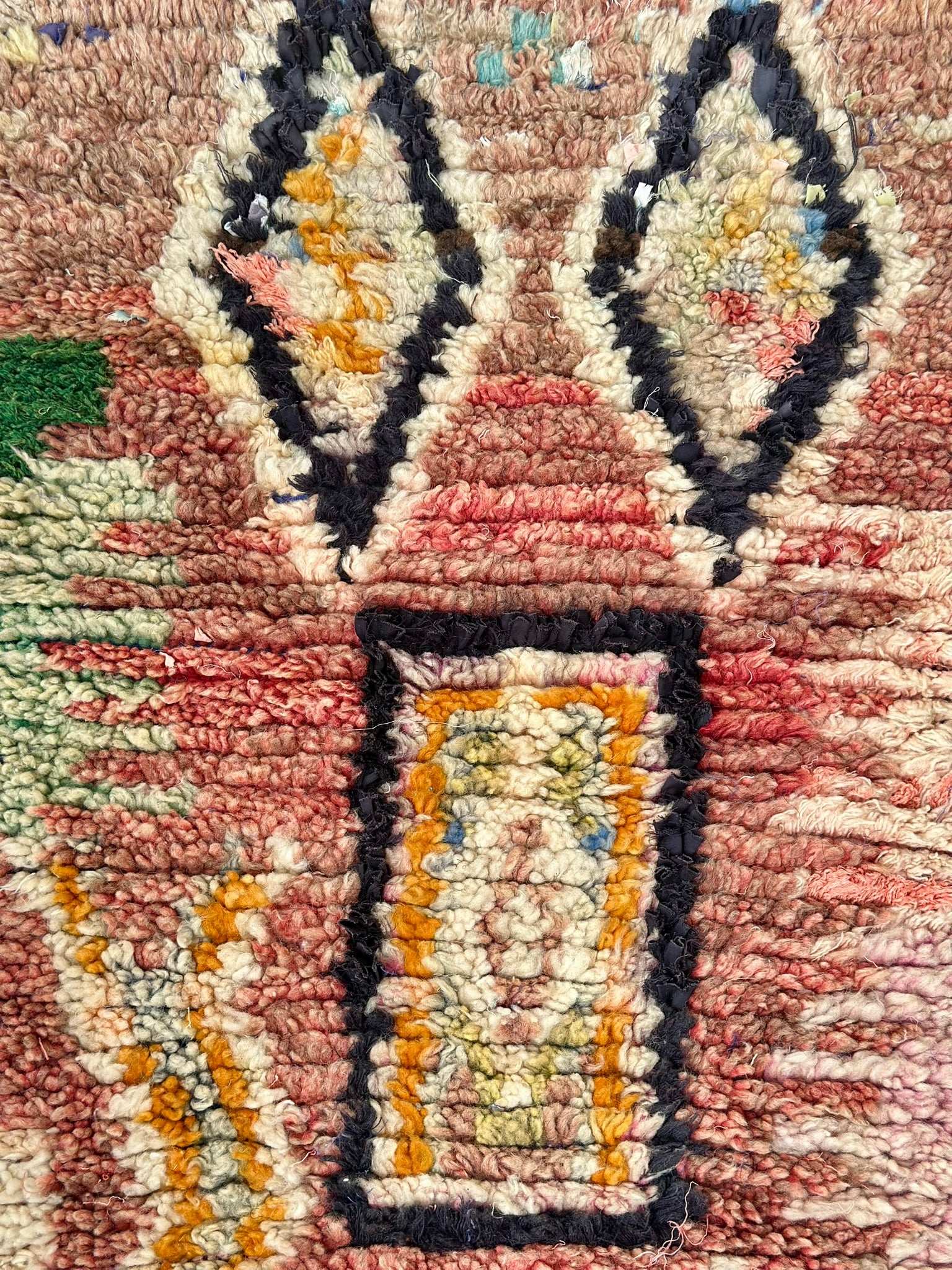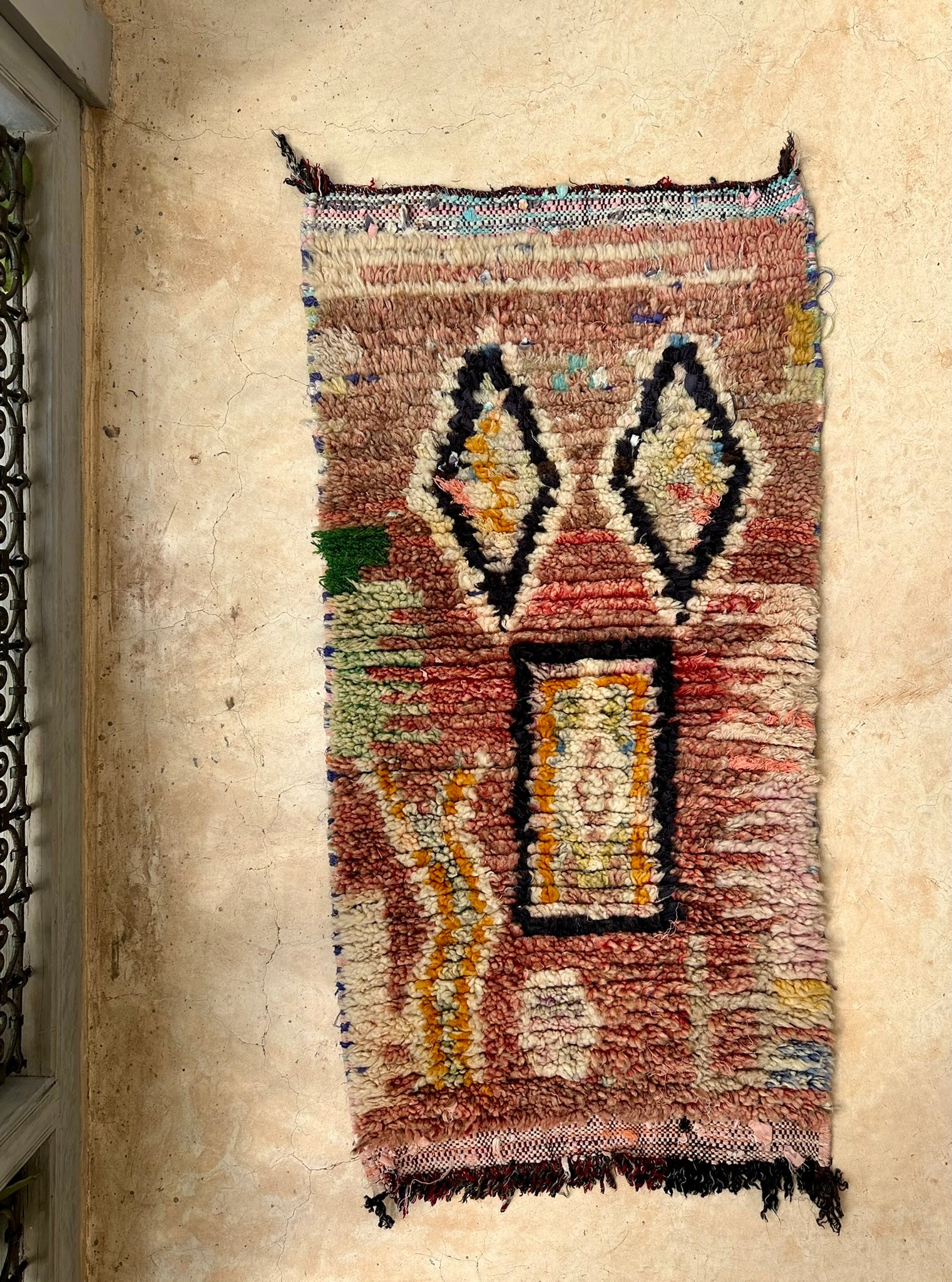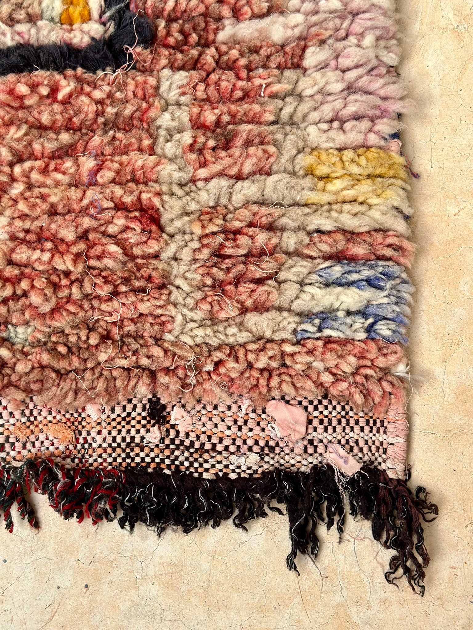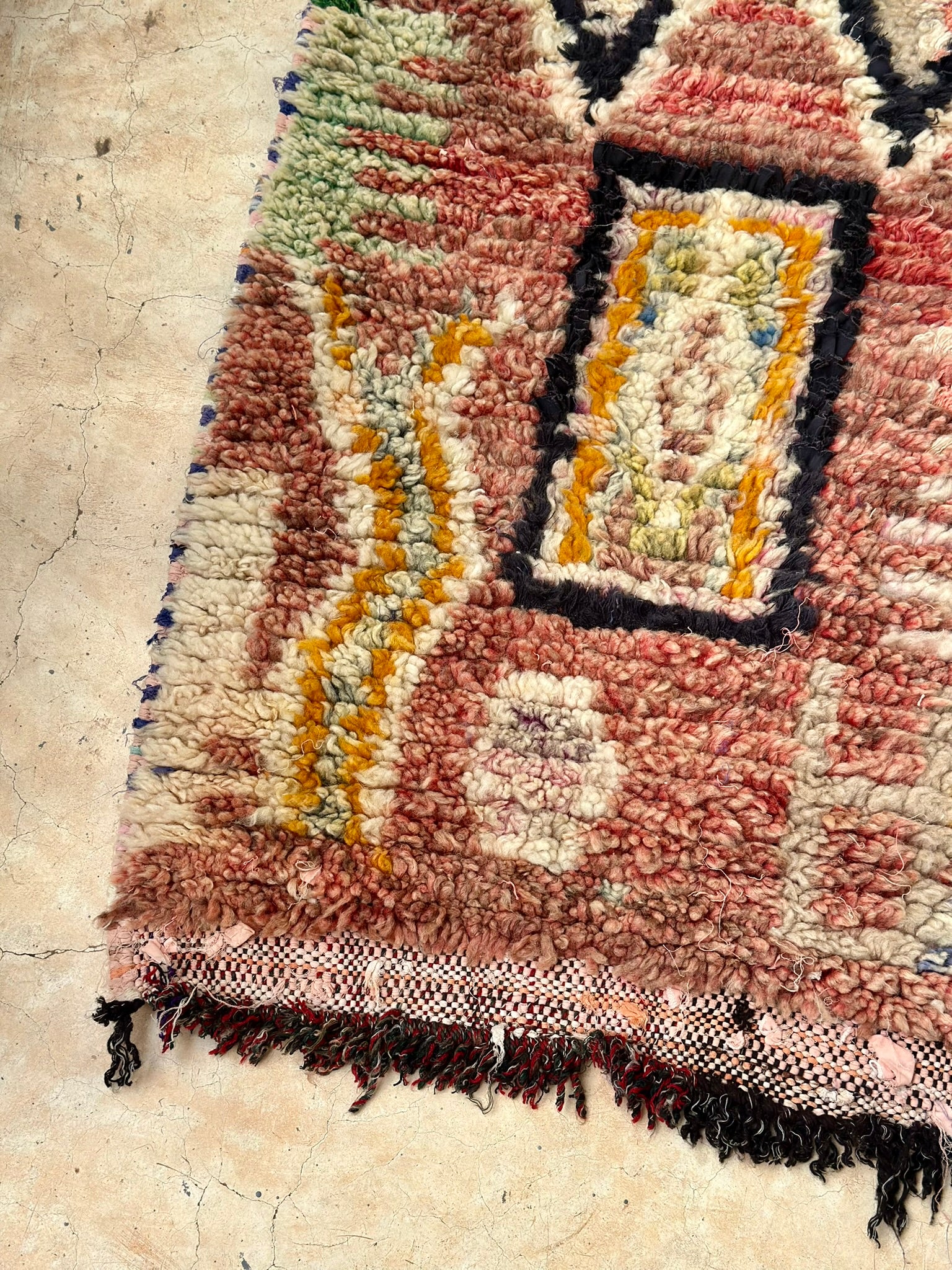 • Wool pile hand-knotted on cotton boucherouite woven base
