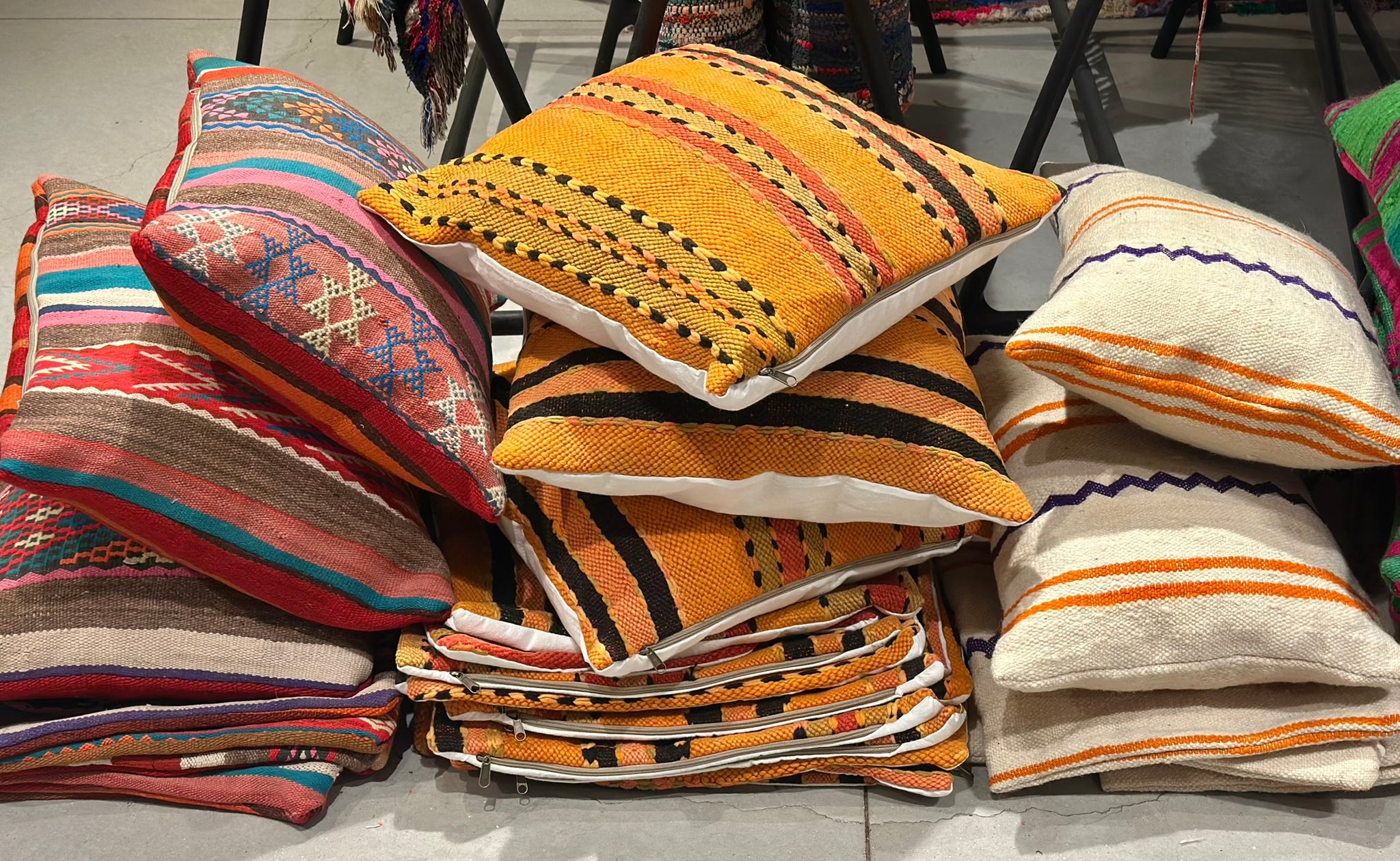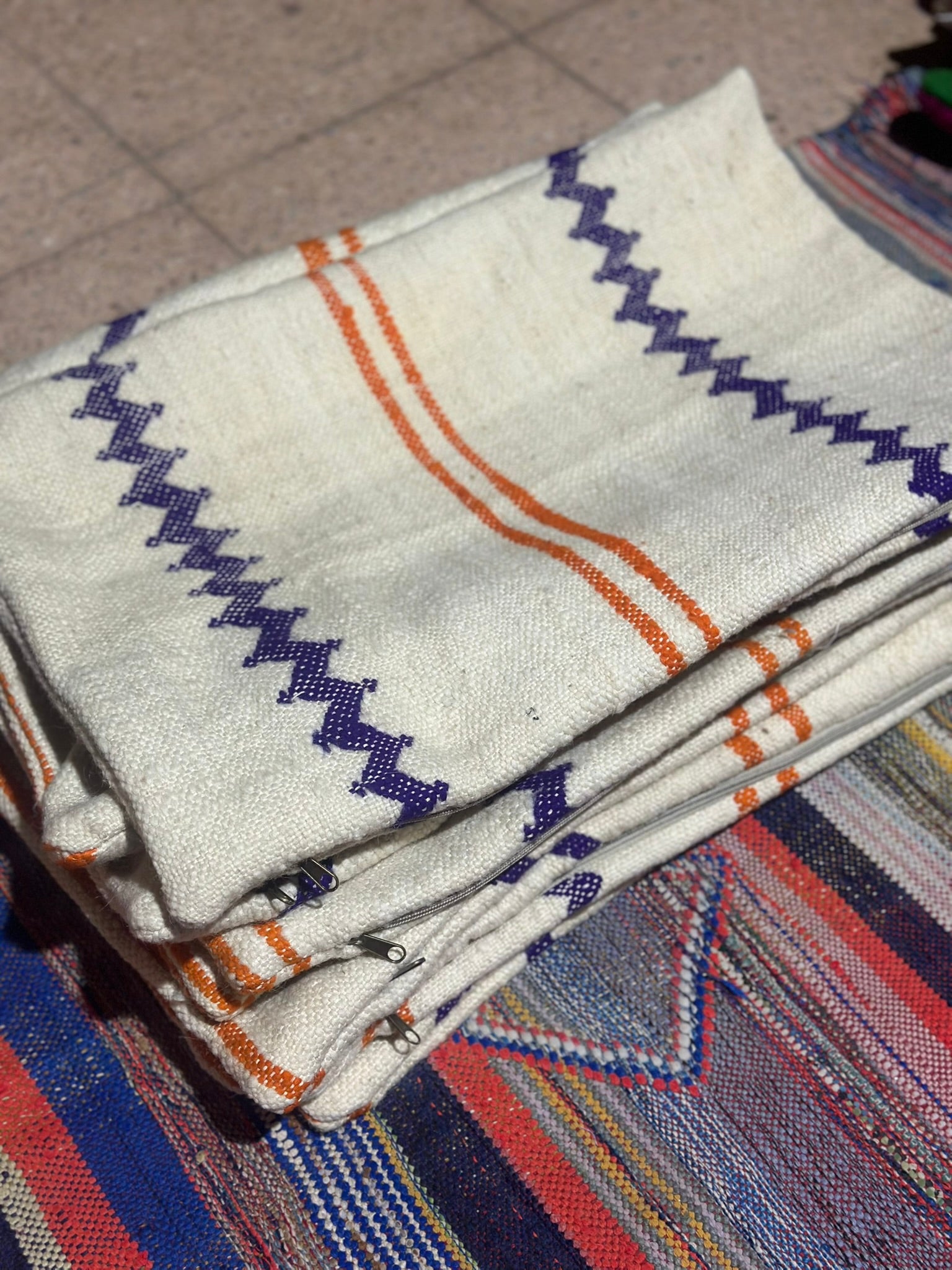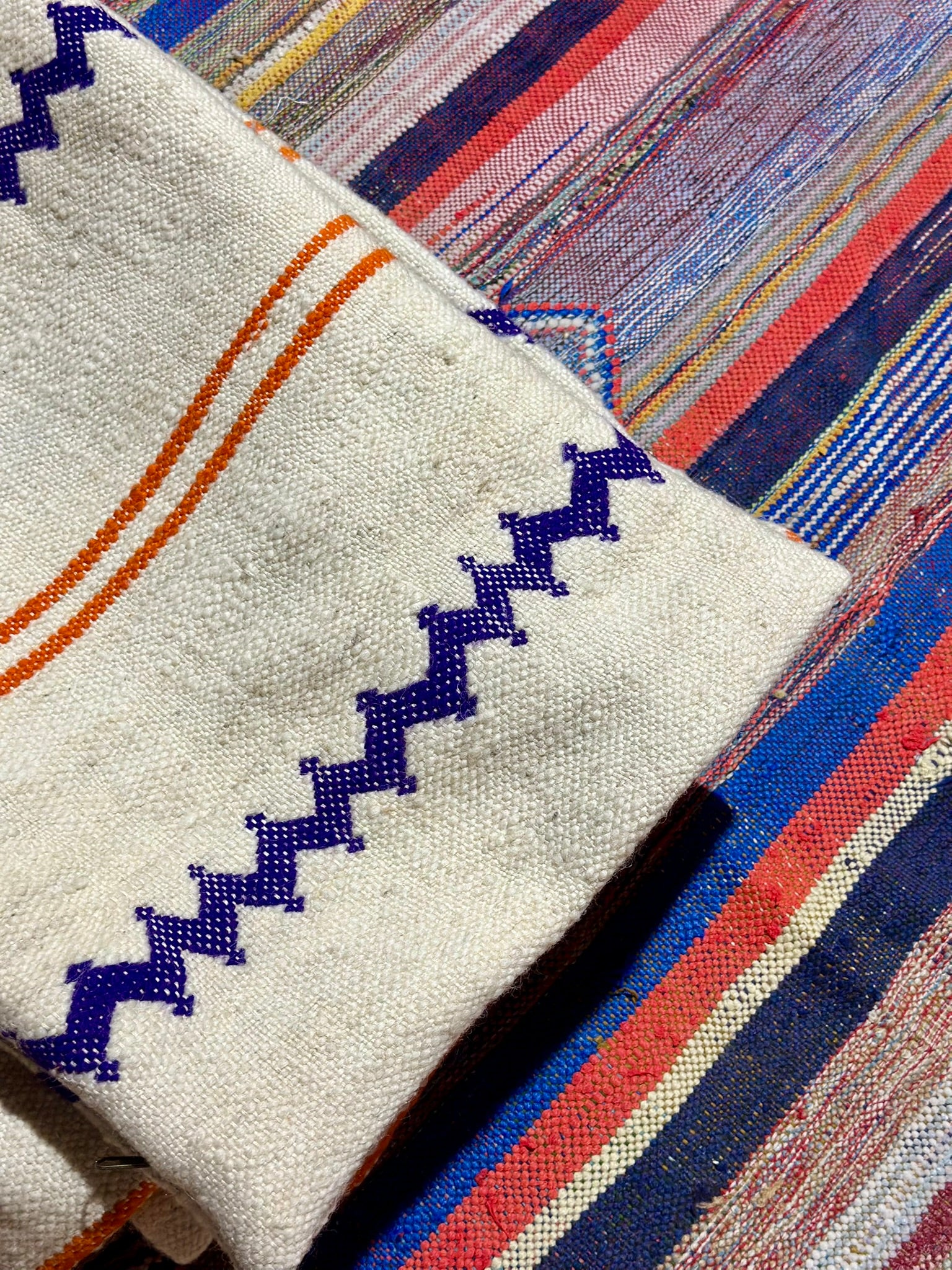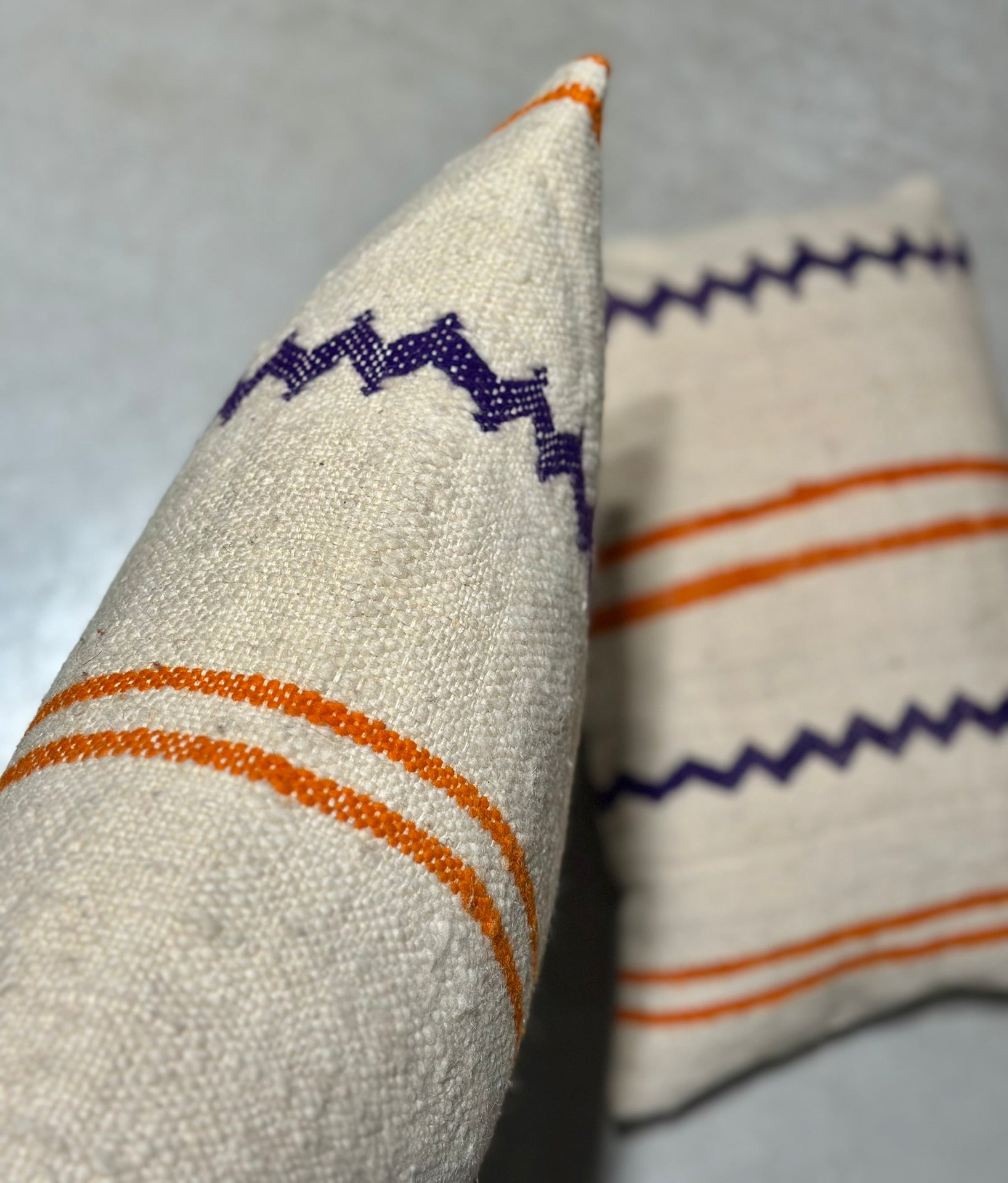 Fresh, balanced and quietly striking — meet AZZAYDA, a small-batch cushion collection created from a beautifully woven Amazigh textile sourced at the criée berbère in Marrakech. Defined by its crisp ivory base, bold violet zzayda zigzags and warm orange stripes, this series blends artisan heritage with a clean, modern feel.
