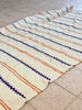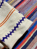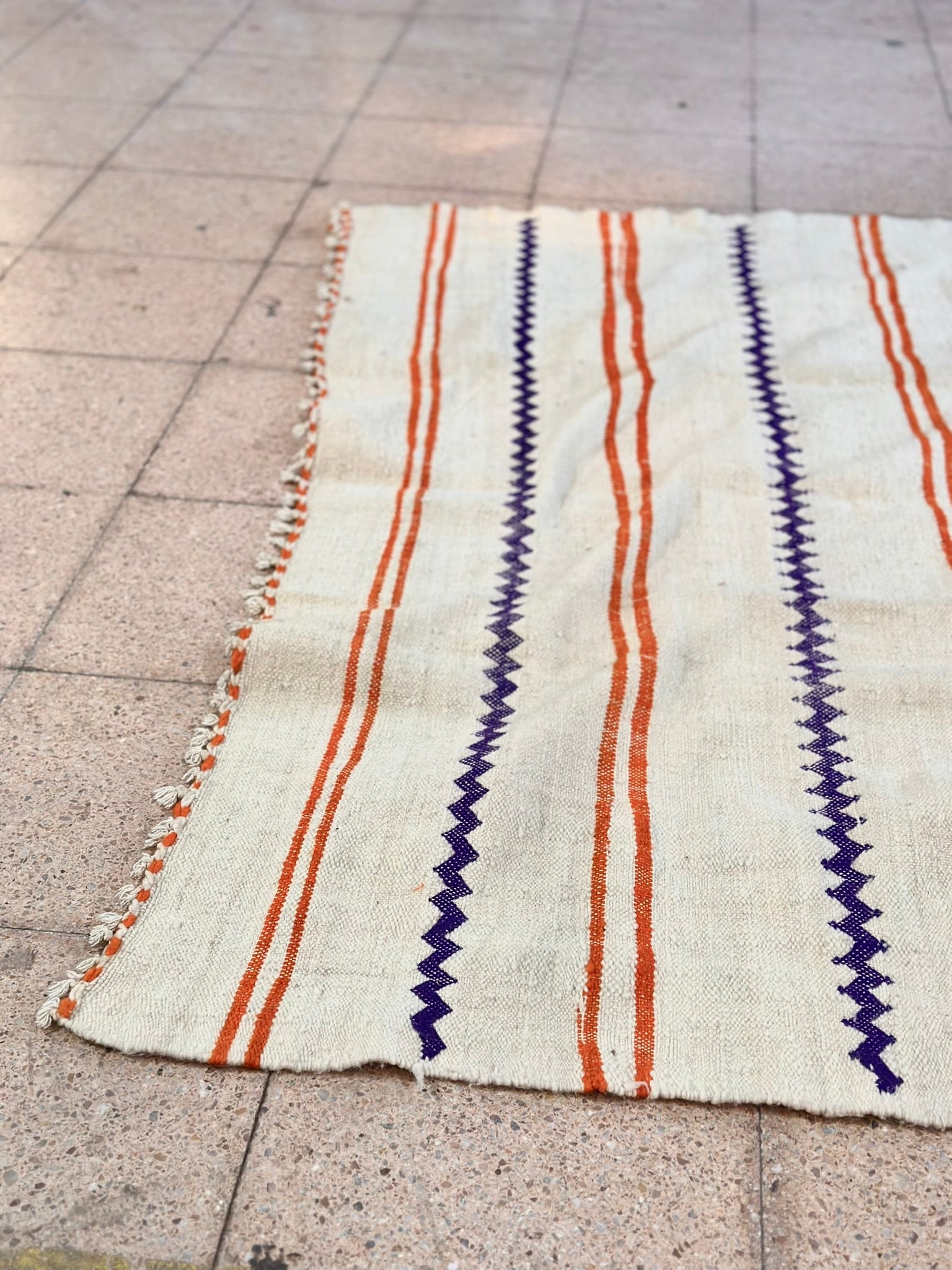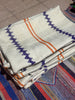 This textile was handpicked at the bustling criée berbère in Marrakech, where rural weavings from the Atlas Mountains are auctioned daily. Among hundreds of pieces, this ivory panel stood out for its crisp zigzags, balanced stripes and timeless colour harmony — a quietly bold treasure ready to be transformed into something new.