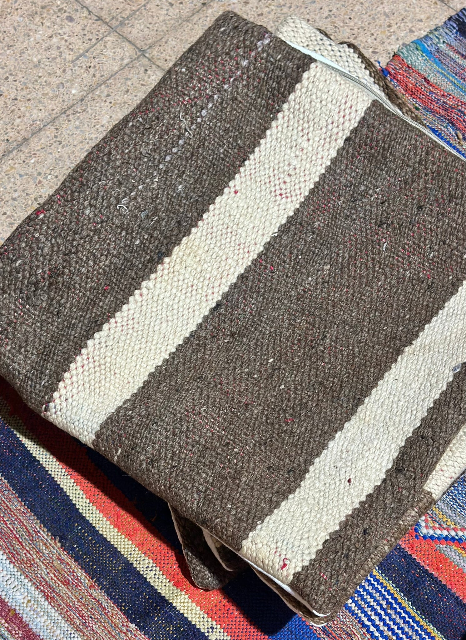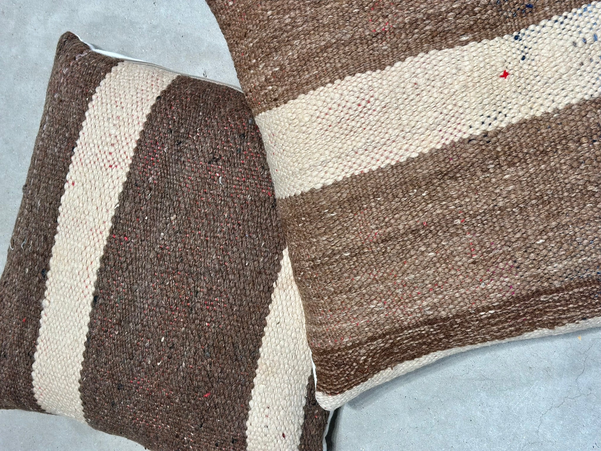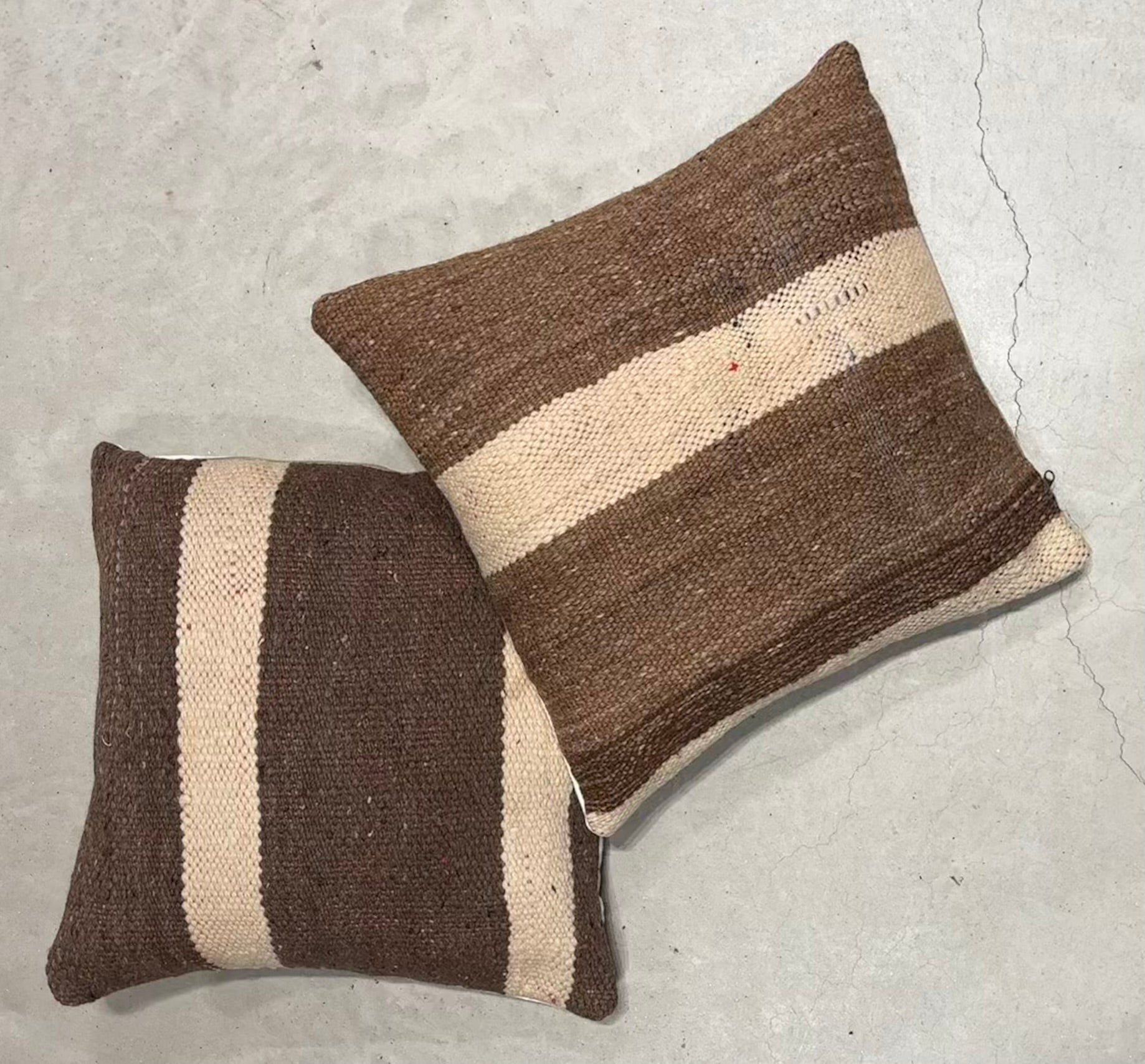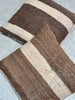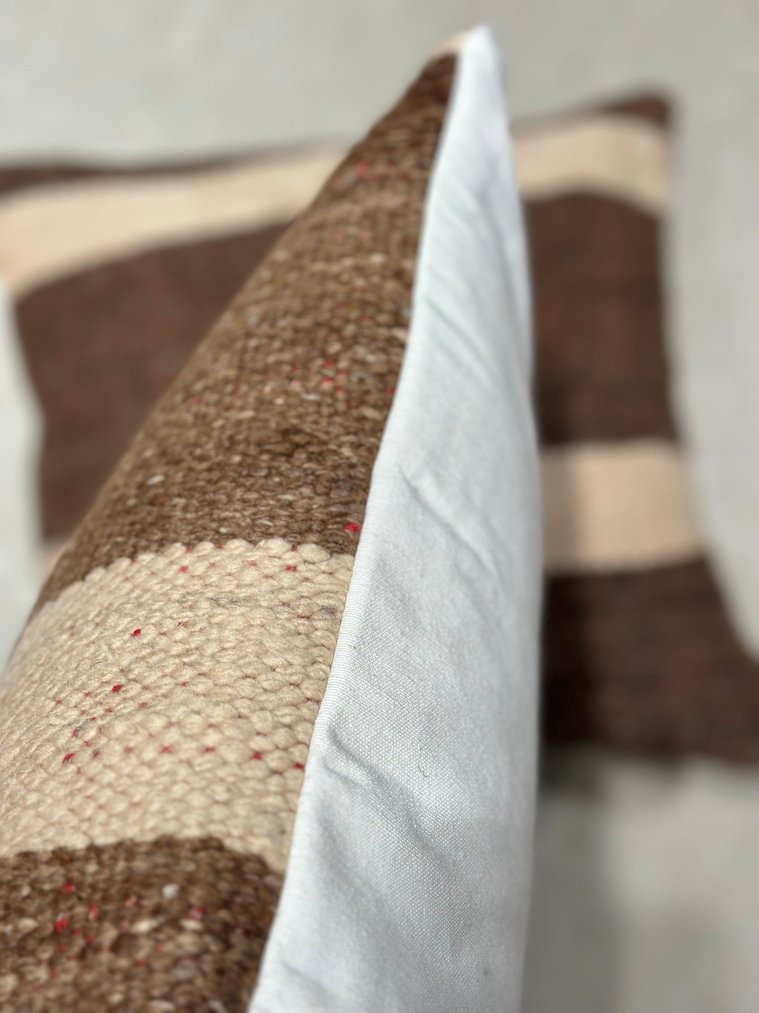 Introducing TIDILI — a warm, graphic cushion series woven from sturdy wool panels in bold brown-and-cream stripes, finished with a soft keria cotton back.