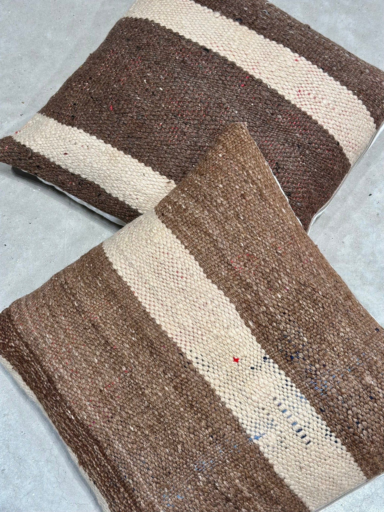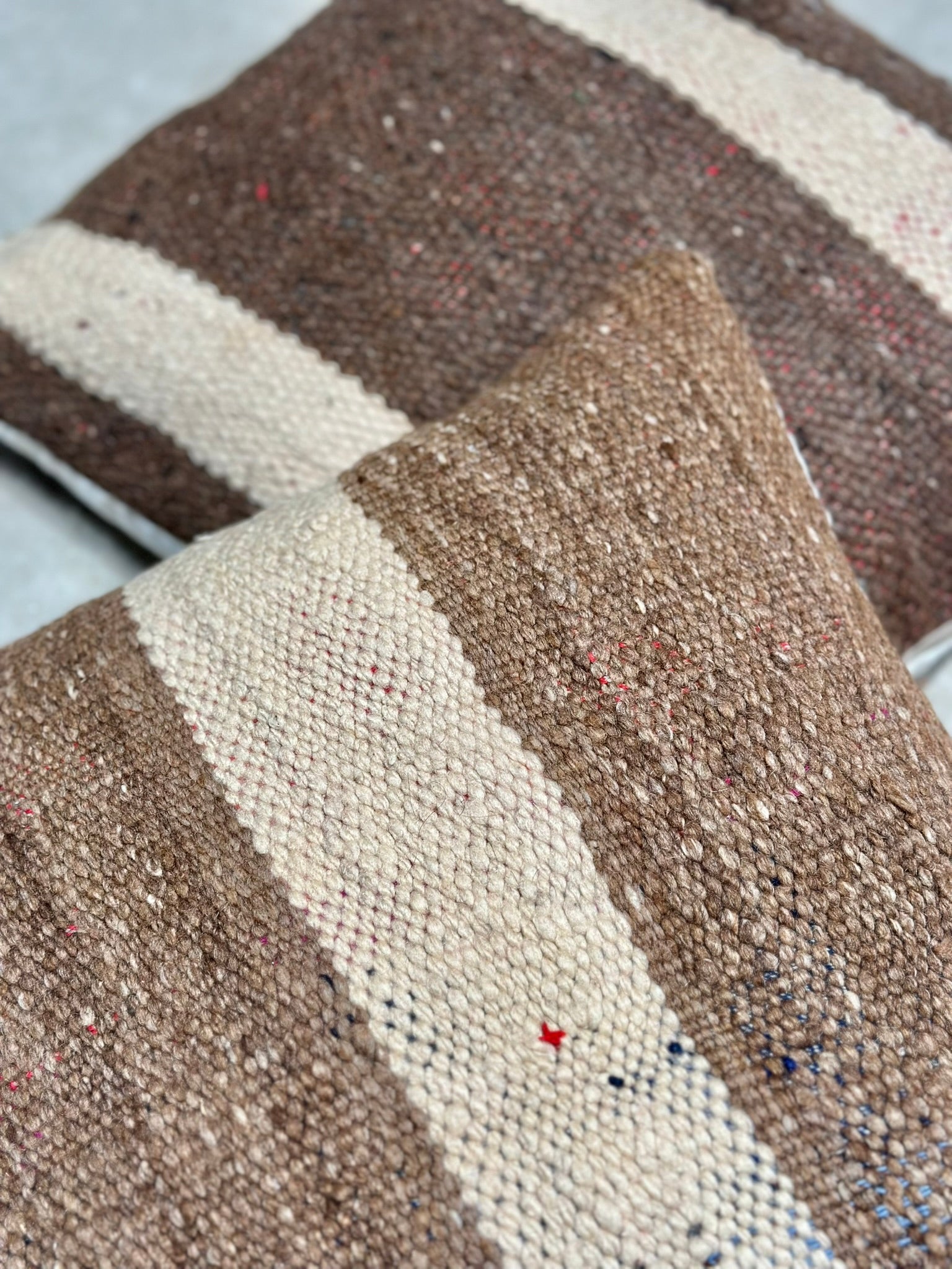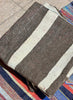 Handpicked at the criée berbère in Marrakech, these textiles stand out for their pronounced striping: wide sandy bands mixed with cocoa and walnut tones, sprinkled with subtle flecks from the hand-spun wool.