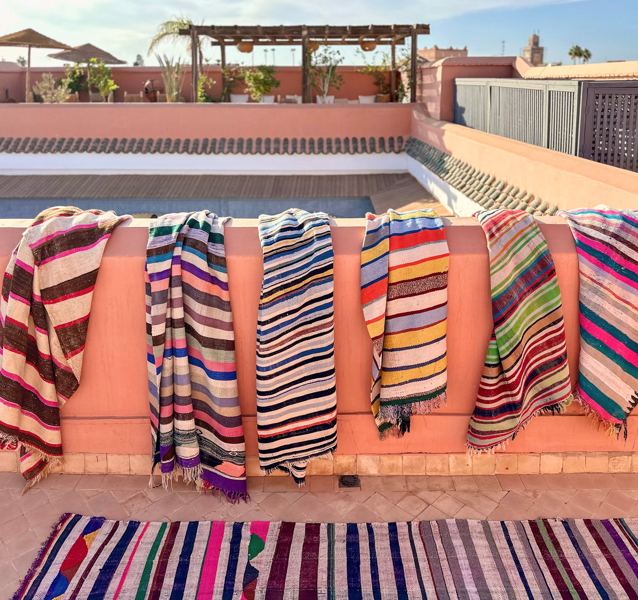 Its joyful colour palette pairs beautifully with terracotta walls, raw wood, earthy tiles and greenery — just like the Marrakech rooftops where it was photographed.