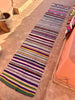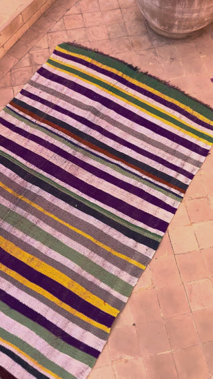 Introducing Lalla Mira — a captivating XL hayk runner full of colour, elegance and traditional Berber soul. Handwoven from vintage wool and cotton blends, this piece features an endless choreography of stripes: deep violet, forest green, soft grey, mustard, berry red, ivory and touches of bright pink. Each line feels like a brushstroke, creating a rhythm only a true handmade textile can offer.