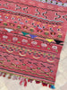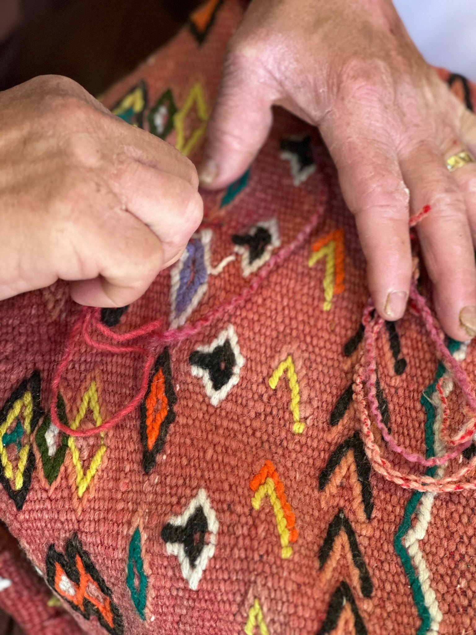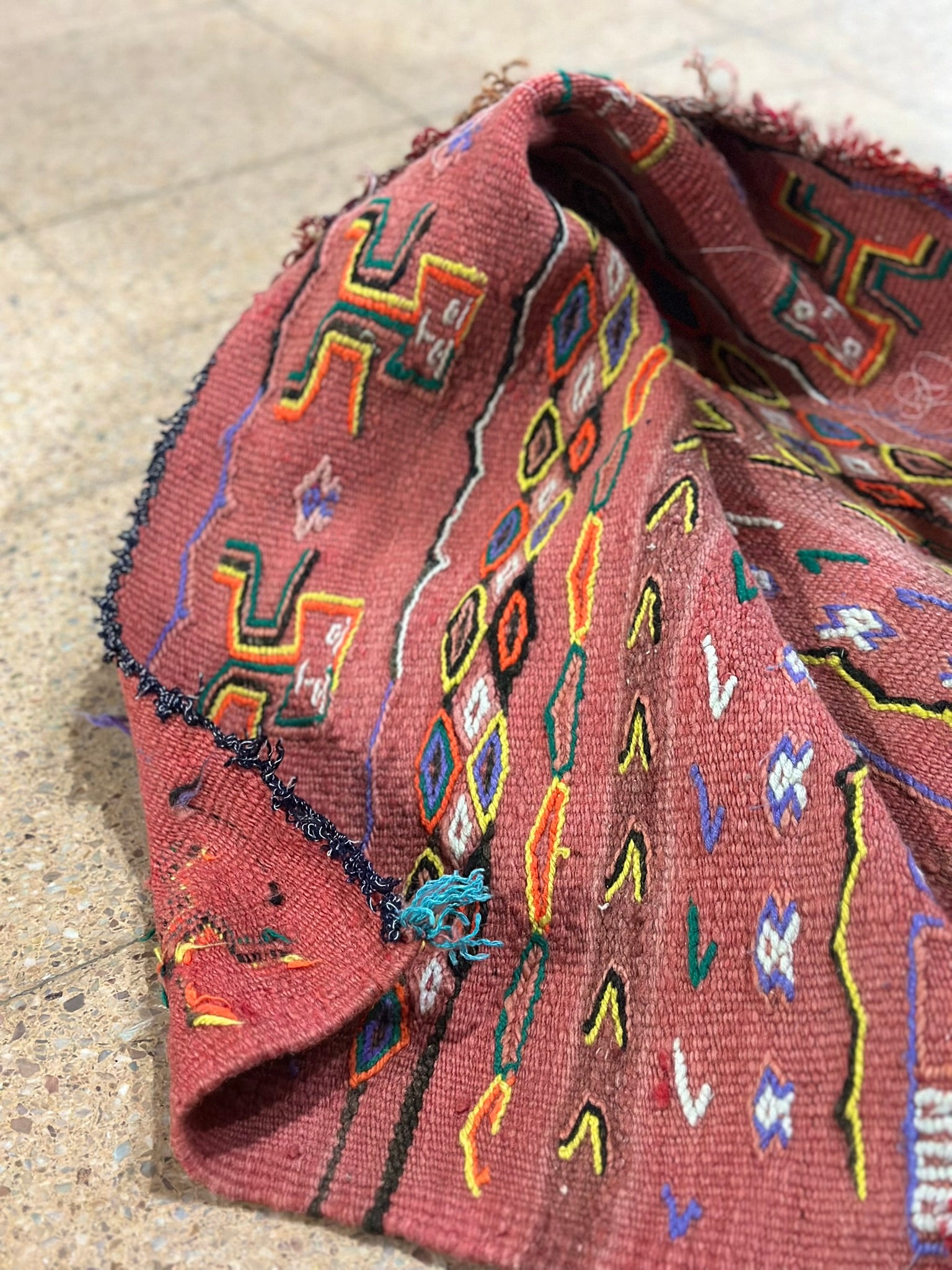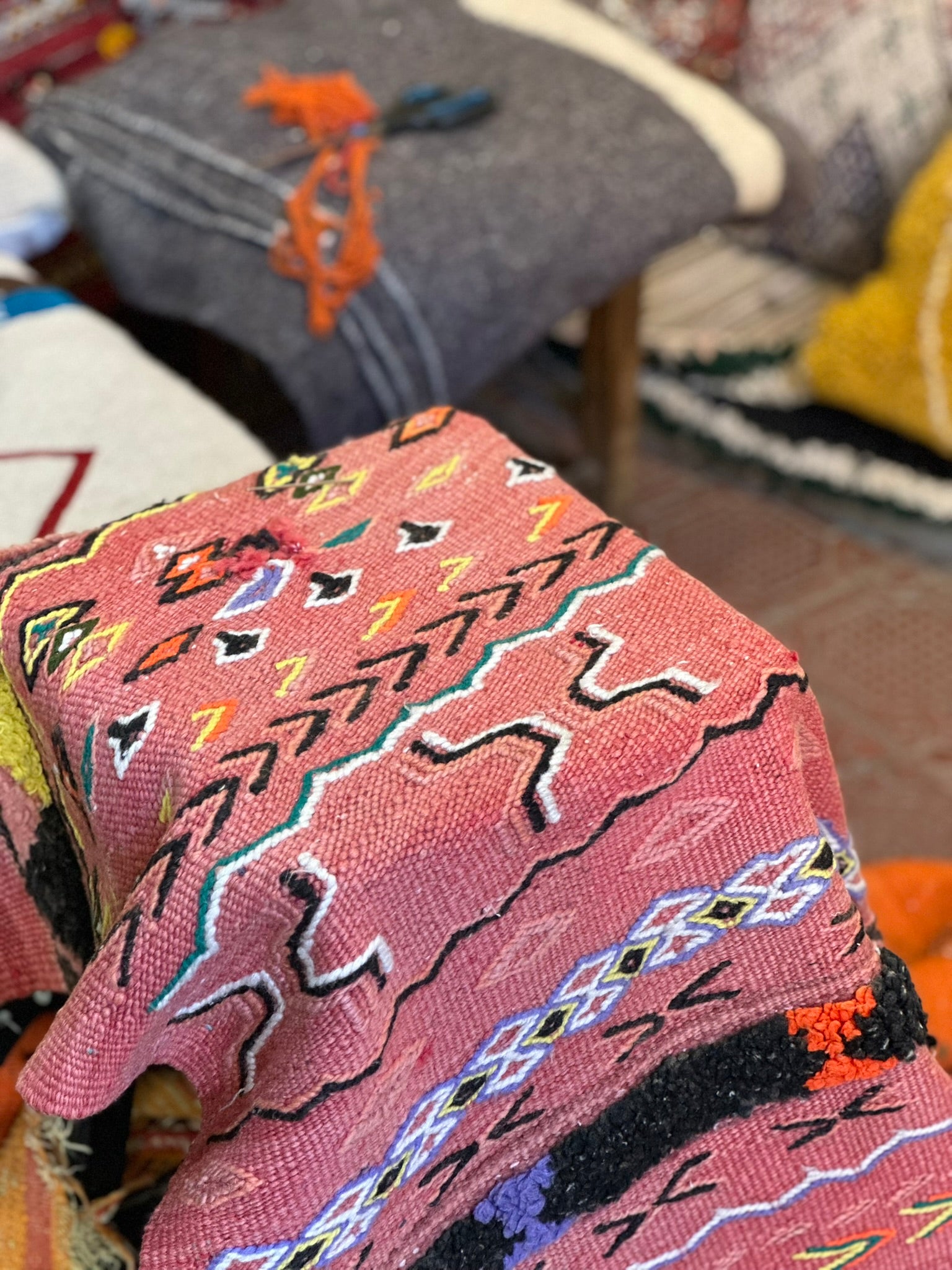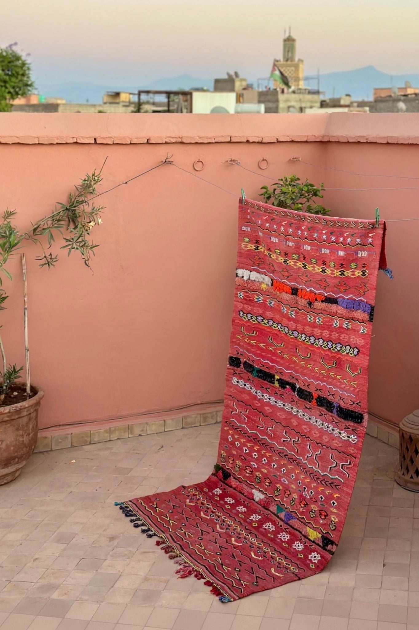 Photographed on our riad rooftop at sunset, this kilim is more than décor — it’s a statement piece, a collector’s textile, a colourful slice of Moroccan heritage.