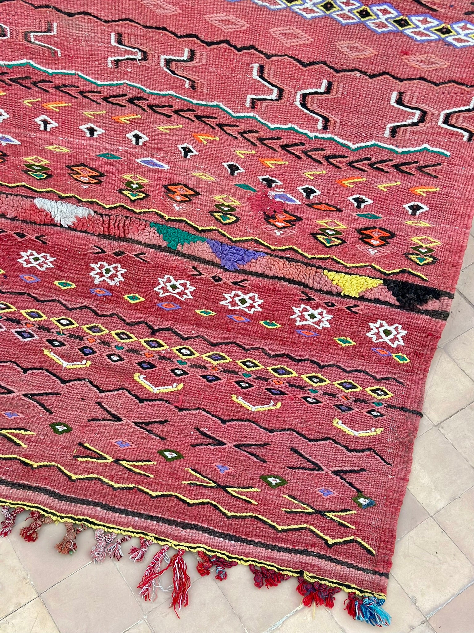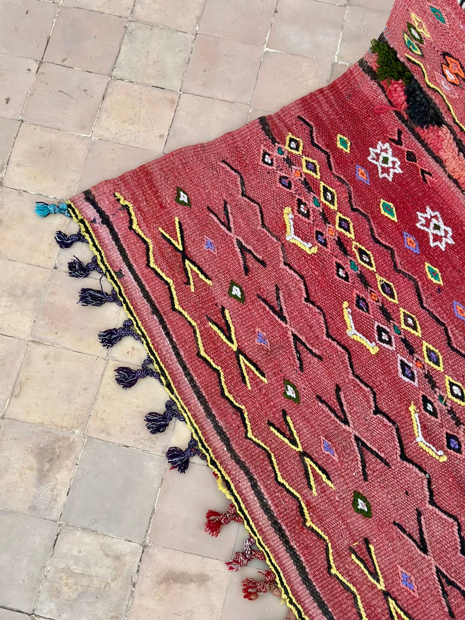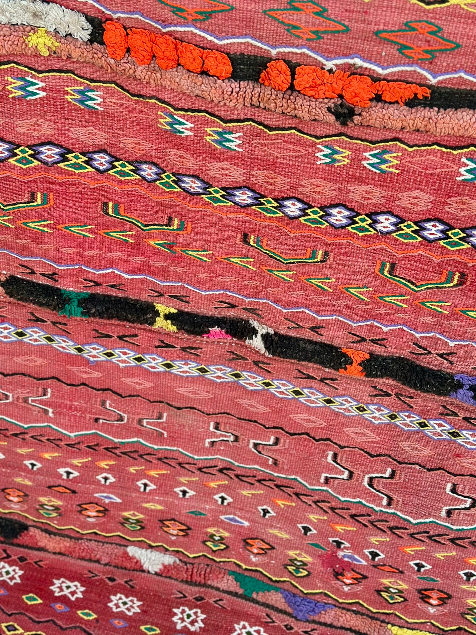 The base is a soft, sun-warmed rose red — a colour Boujad is famous for — enriched with bursts of saffron yellow, emerald green, bright orange, charcoal black and sky blue. Some motifs are woven flat; others rise slightly from the surface, creating a tactile rhythm unique to older Boujad kilims.