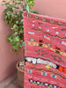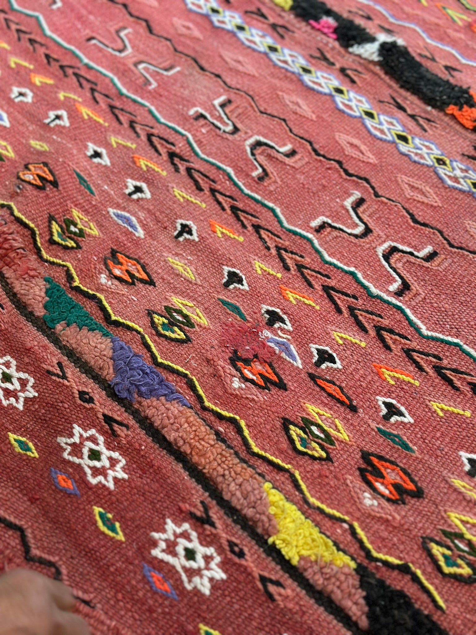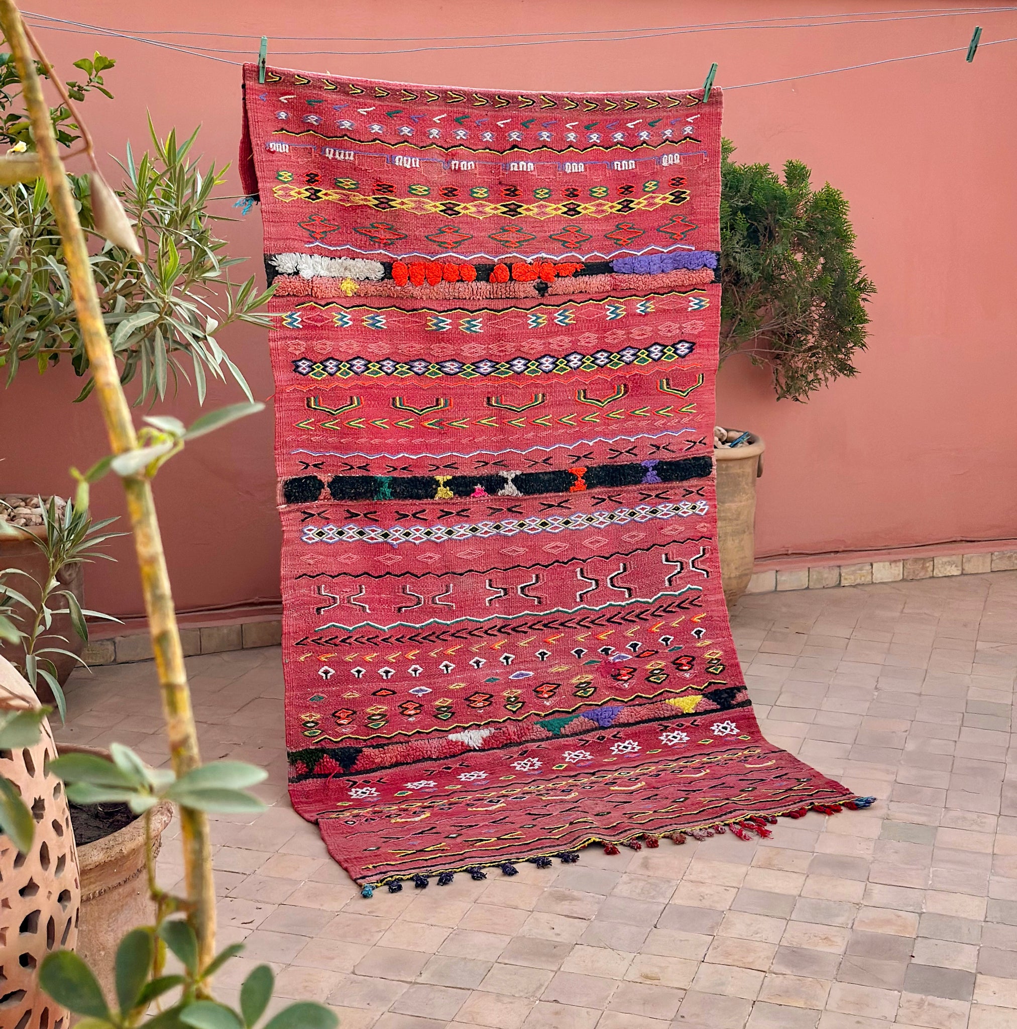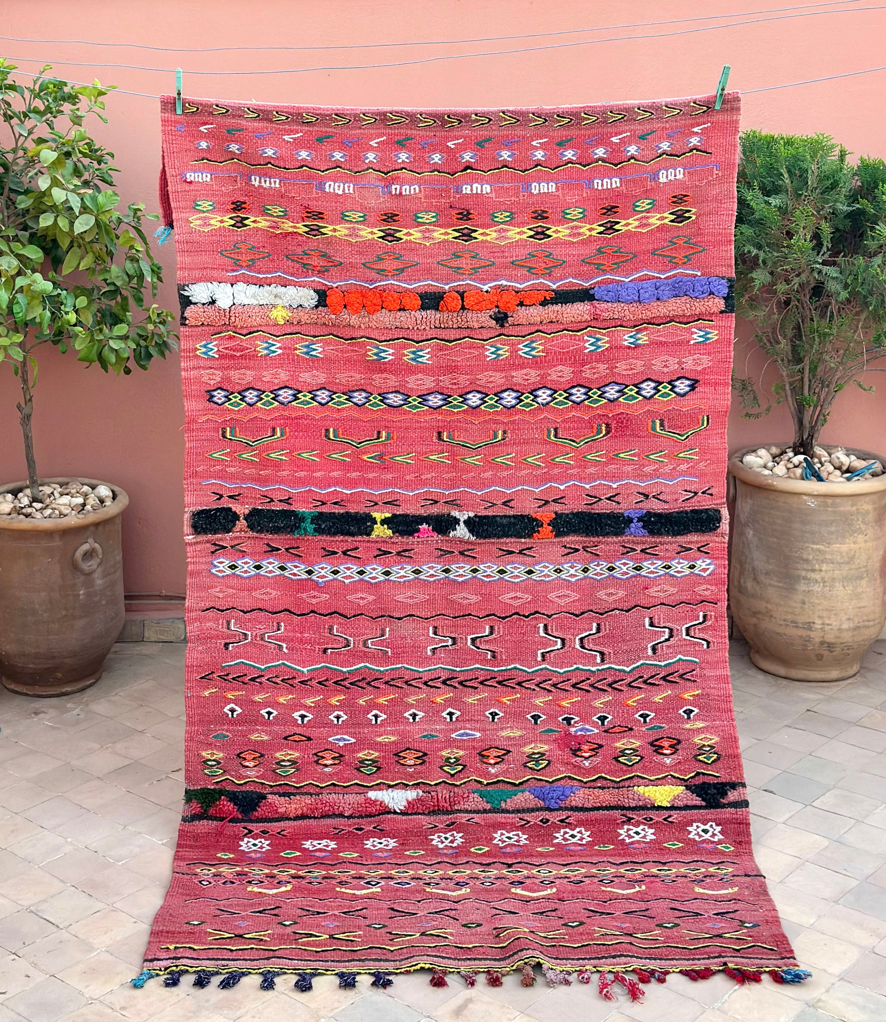 The base is a soft, sun-warmed rose red — a colour Boujad is famous for — enriched with bursts of saffron yellow, emerald green, bright orange, charcoal black and sky blue. Some motifs are woven flat; others rise slightly from the surface, creating a tactile rhythm unique to older Boujad kilims.