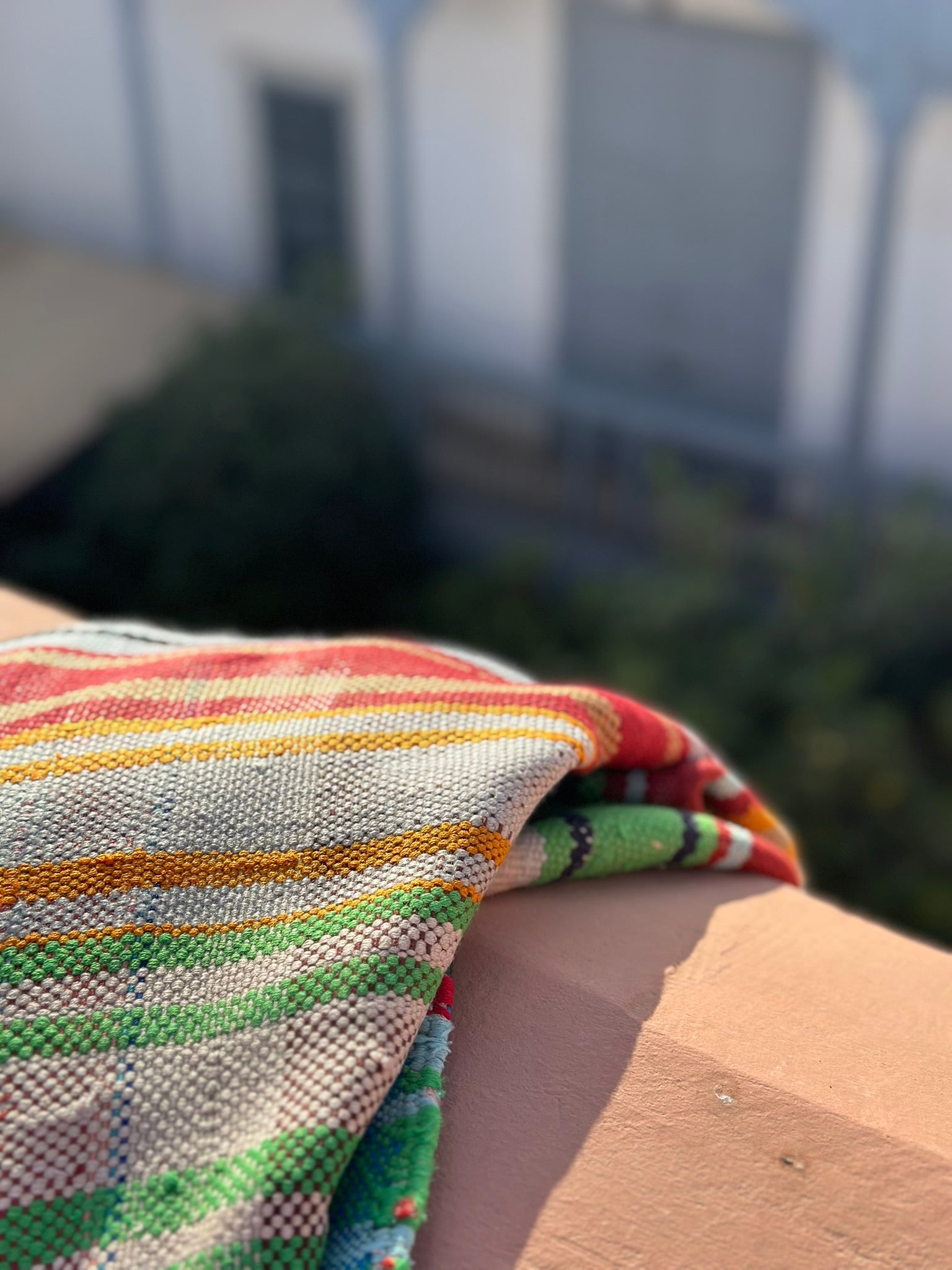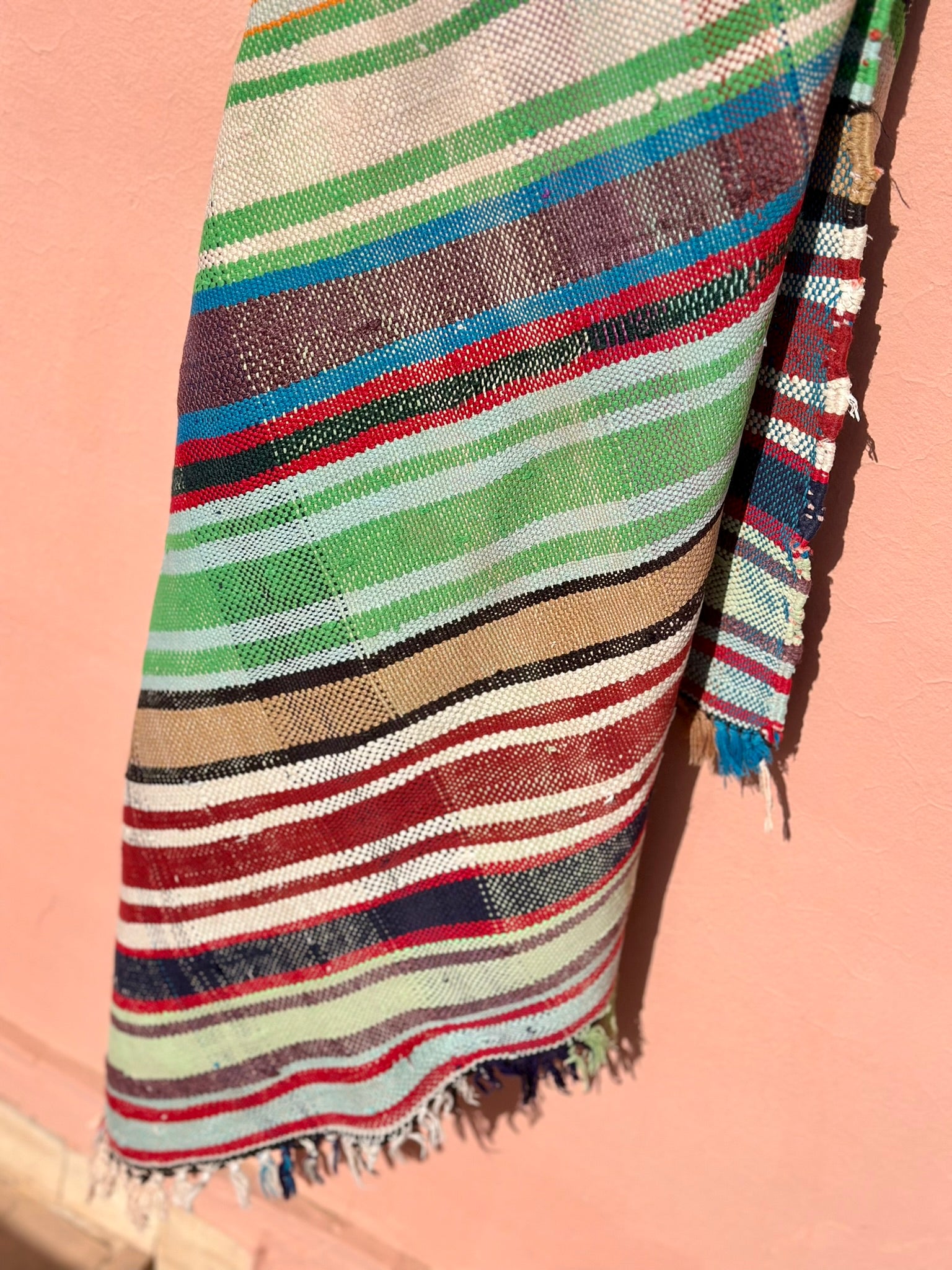 A sun-soaked celebration of colour, Tifawen Stripe brings together every shade that makes Morocco feel alive. Handwoven on traditional wooden looms, this vintage hayk blends bands of saffron, mint, clay red, olive, ivory and sky blue into a rhythmic, joyful whole — the sort of palette you only find drying on a rooftop under Marrakesh light.