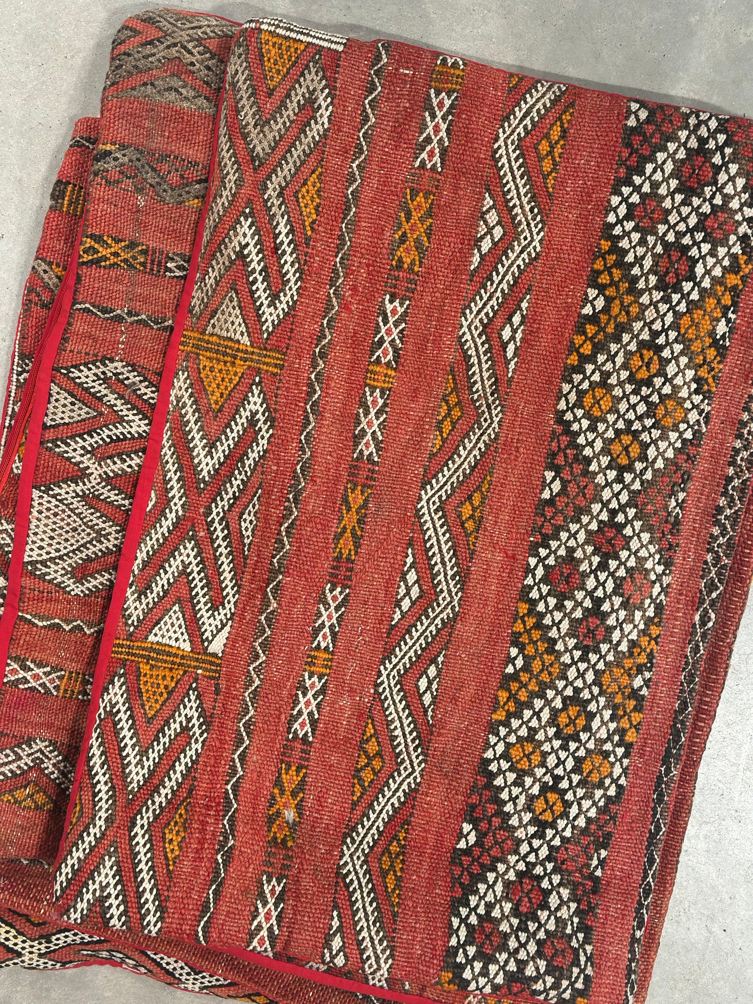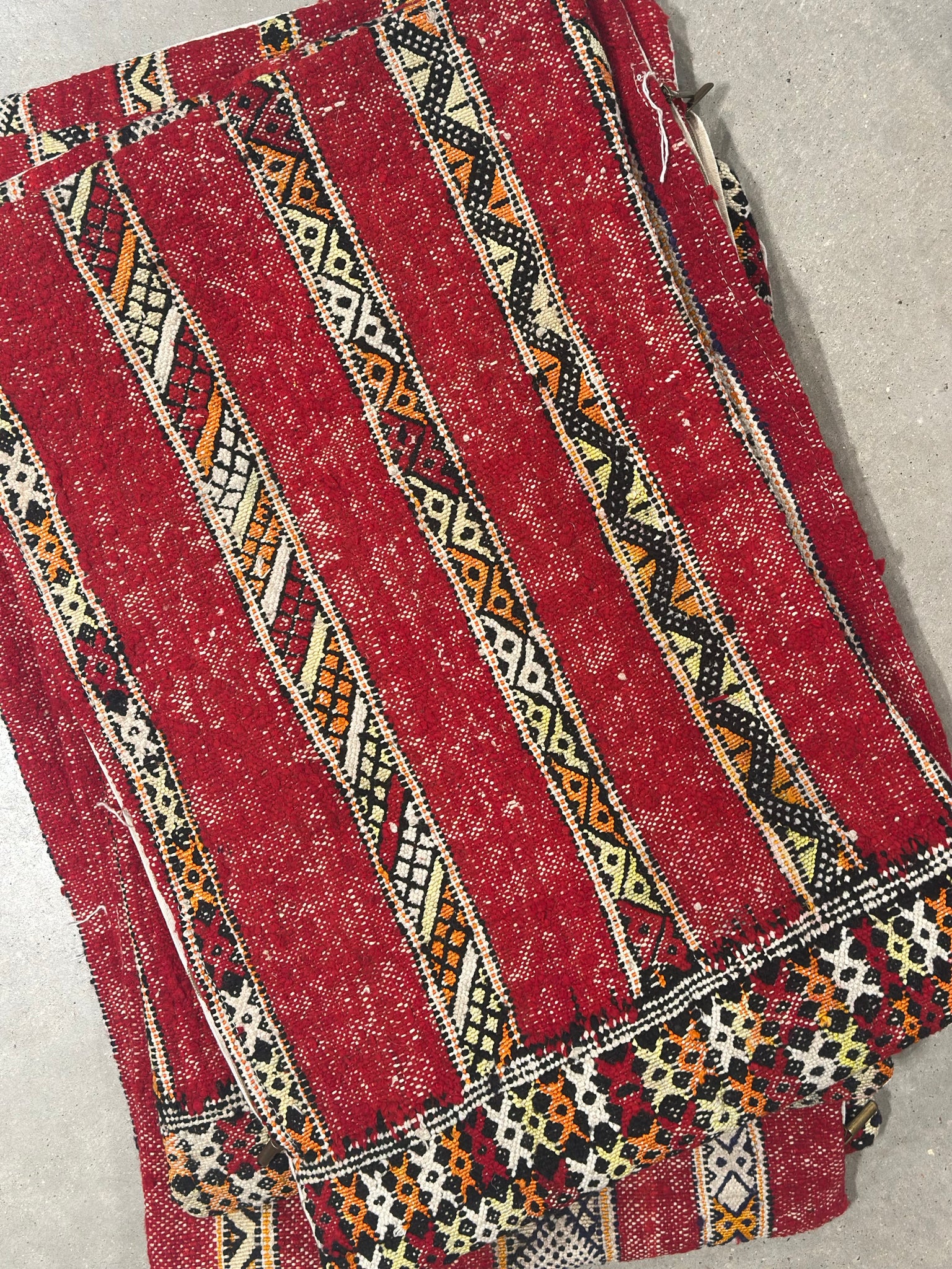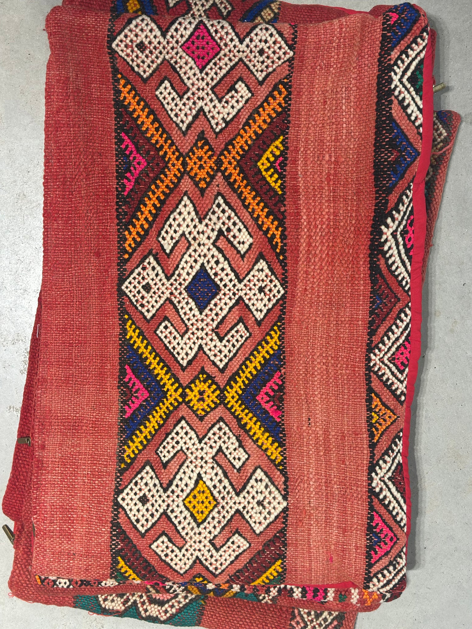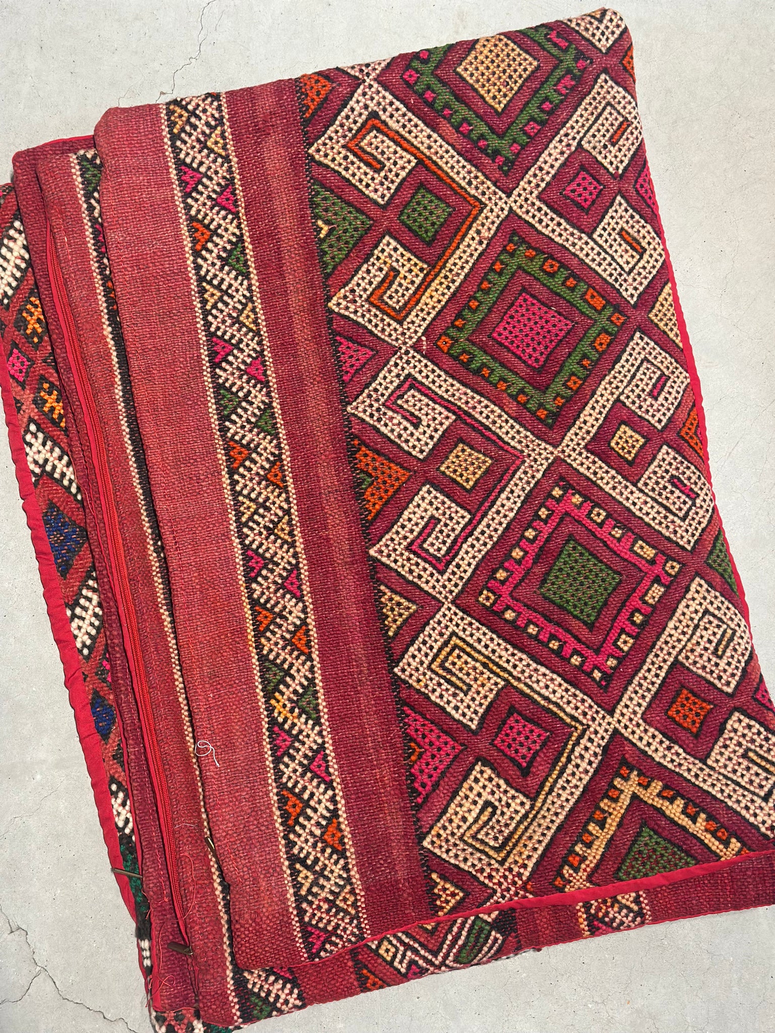 Made of vintage kelims, in a wonderful combo of authentic berber patterns and red base. Boho perfect, doublesided or with cotton keria back.