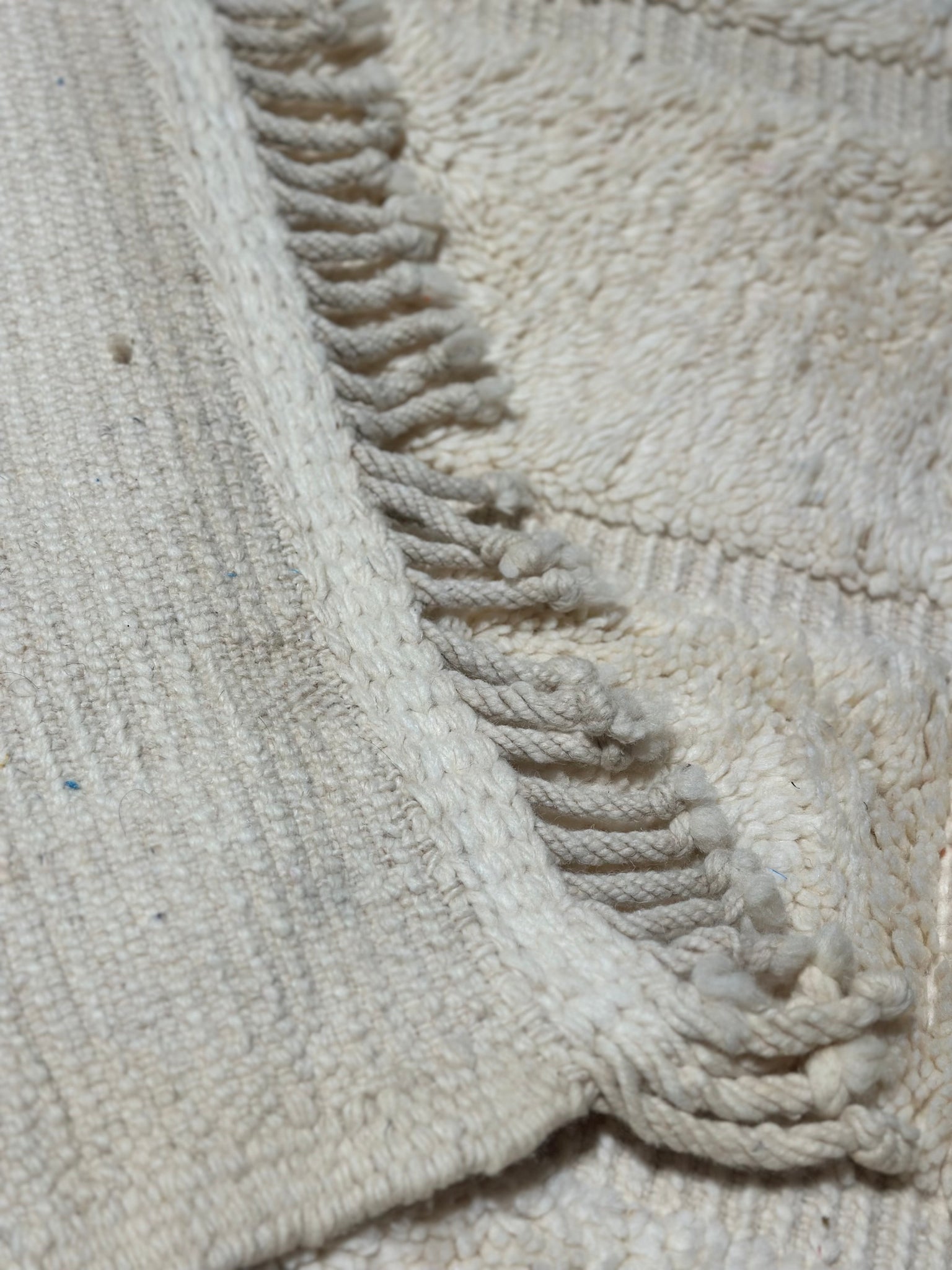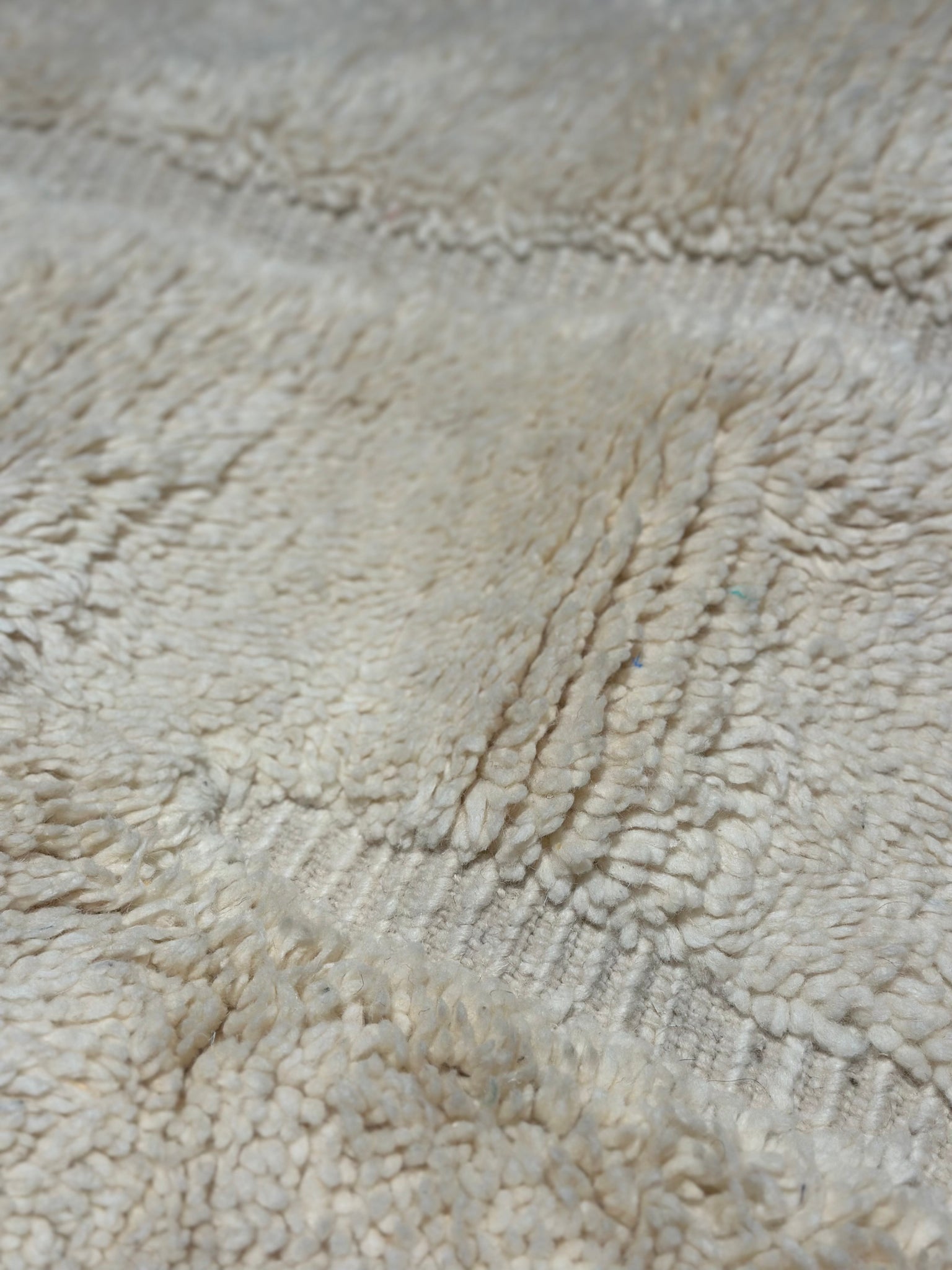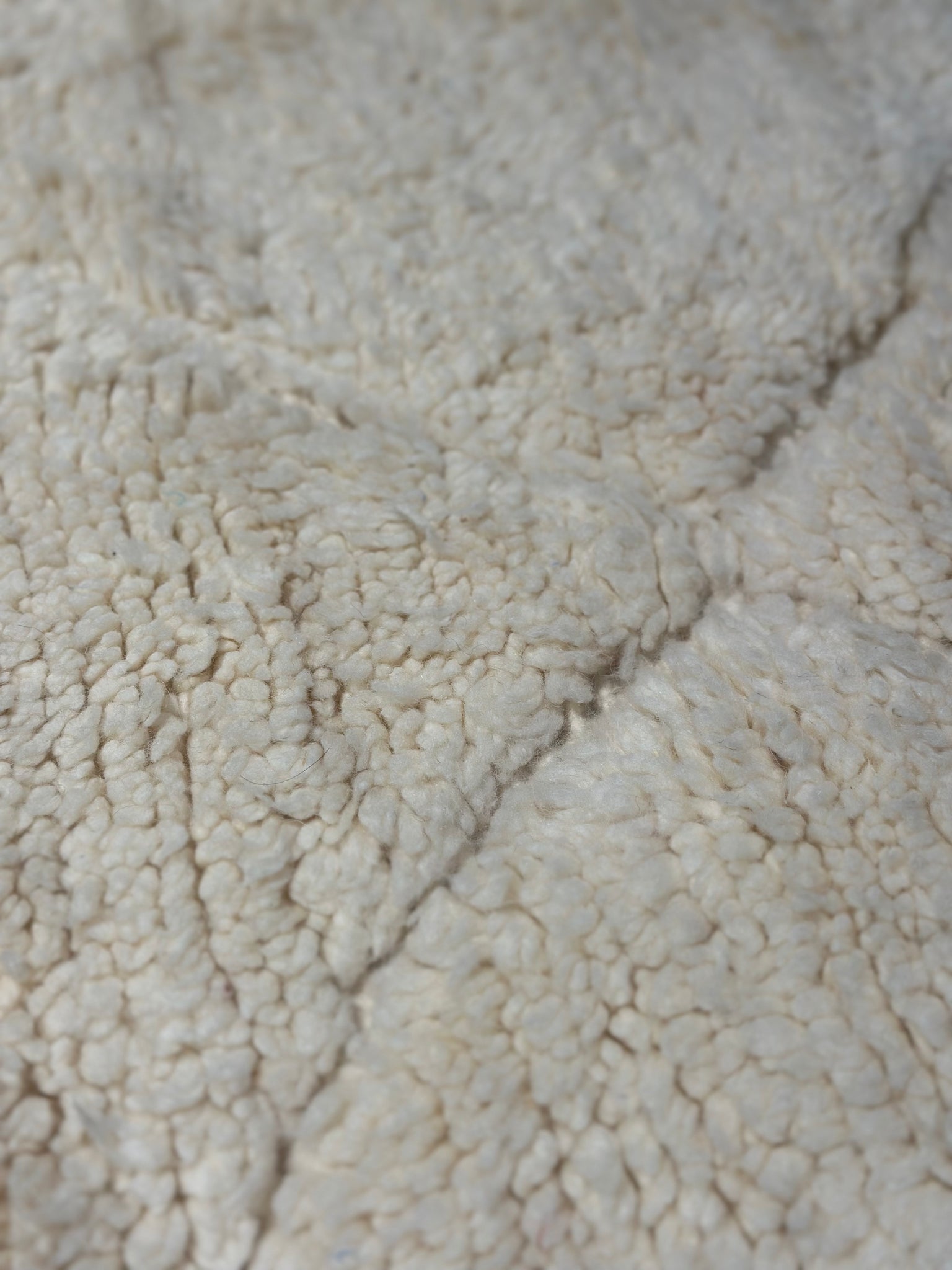 Soft, sculptural and soothingly monochrome — “Cloudline” is the calmest expression of our Beni Ouarain collection. Instead of dark charcoal lines, this rare ton-sur-ton piece features a raised pattern woven in creamy, cloud-like wool. The subtle diamonds emerge gently from the plush surface, creating texture through shadow and relief rather than contrast.