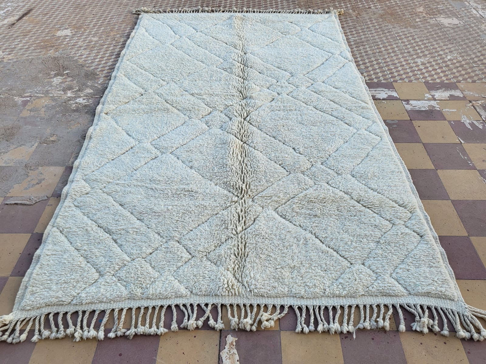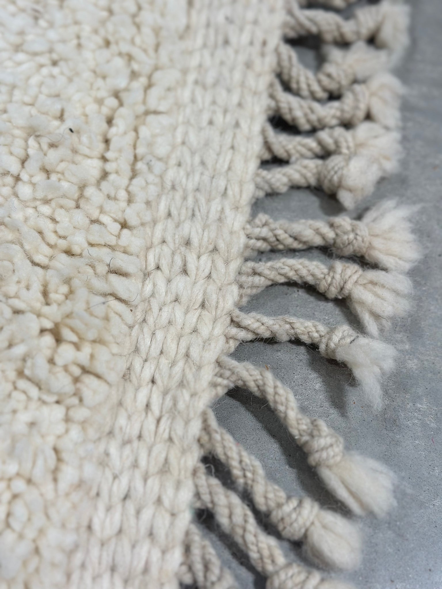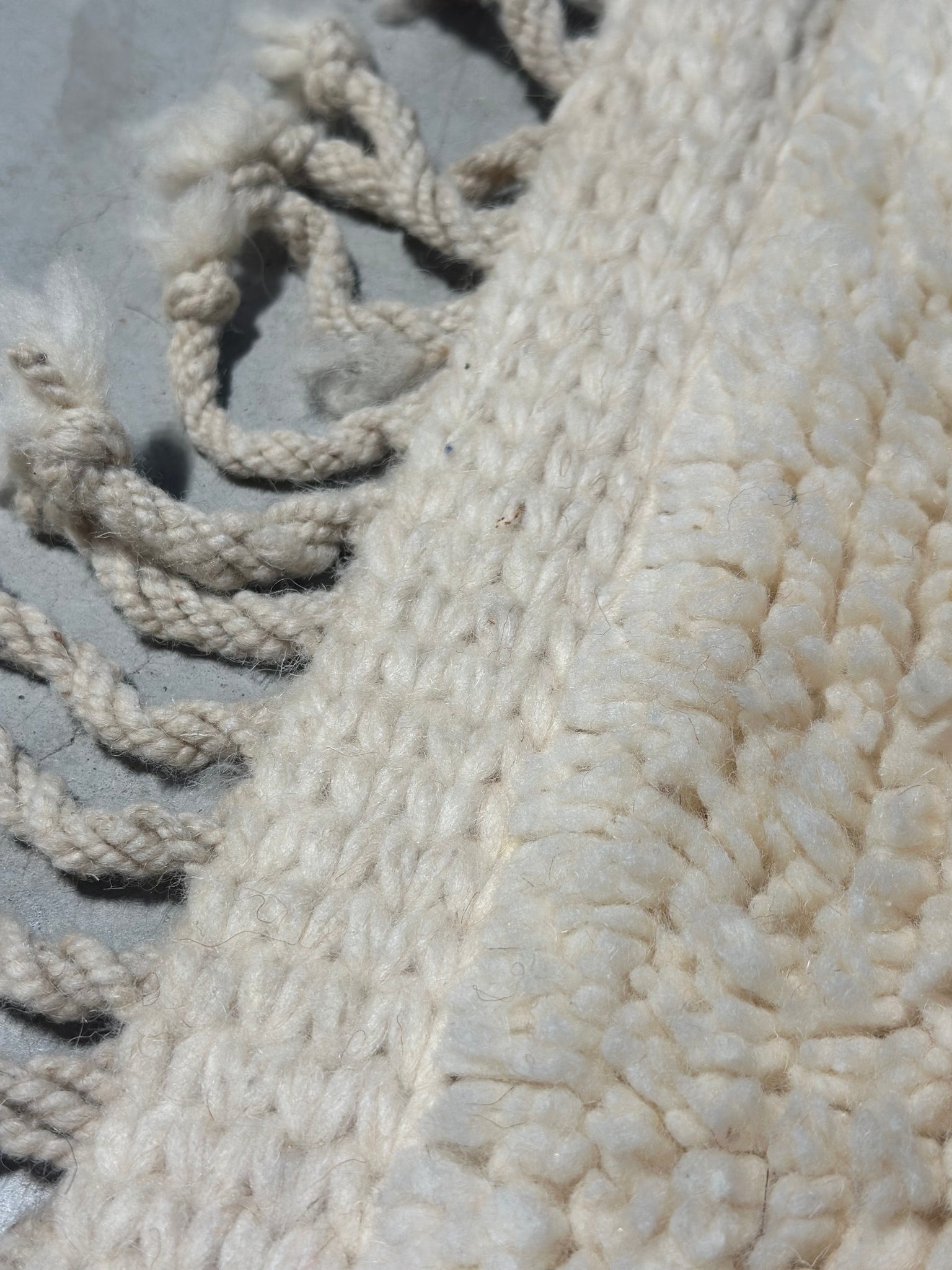 Soft, sculptural and soothingly monochrome — “Cloudline” is the calmest expression of our Beni Ouarain collection. Instead of dark charcoal lines, this rare ton-sur-ton piece features a raised pattern woven in creamy, cloud-like wool. The subtle diamonds emerge gently from the plush surface, creating texture through shadow and relief rather than contrast.
