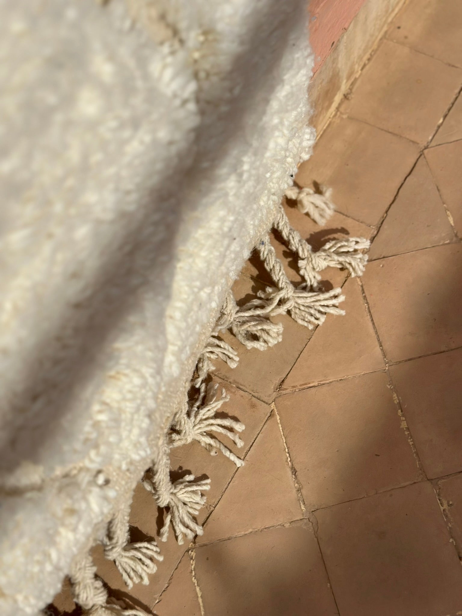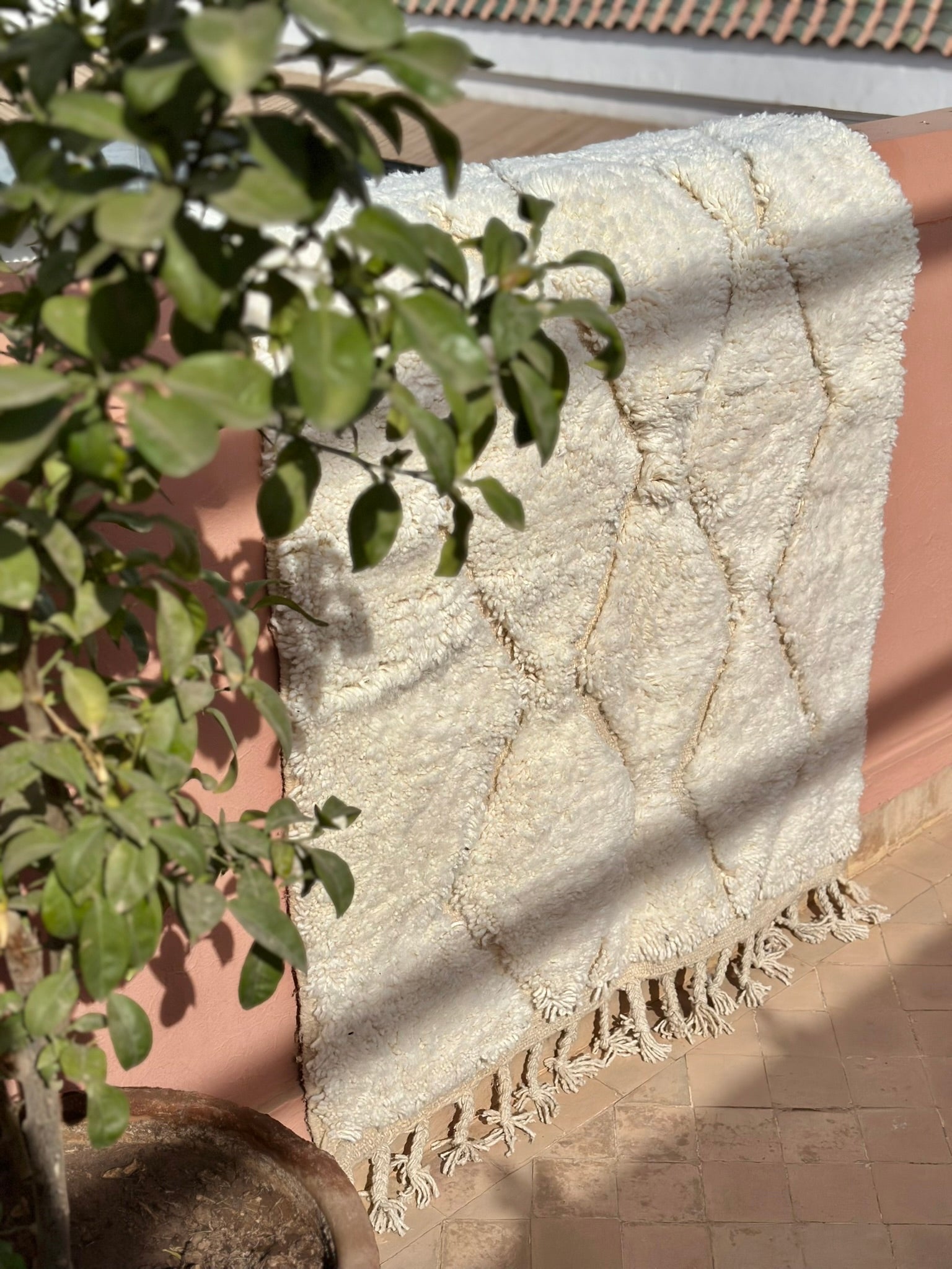 Evoking the warm softness of shifting sands, Beni Dunes is a serene Beni Ouarain treasure woven in a gentle palette of creamy ivory and natural beige. Its flowing diamond motifs echo the curves and ridges of desert dunes — subtle, calming, and timeless.