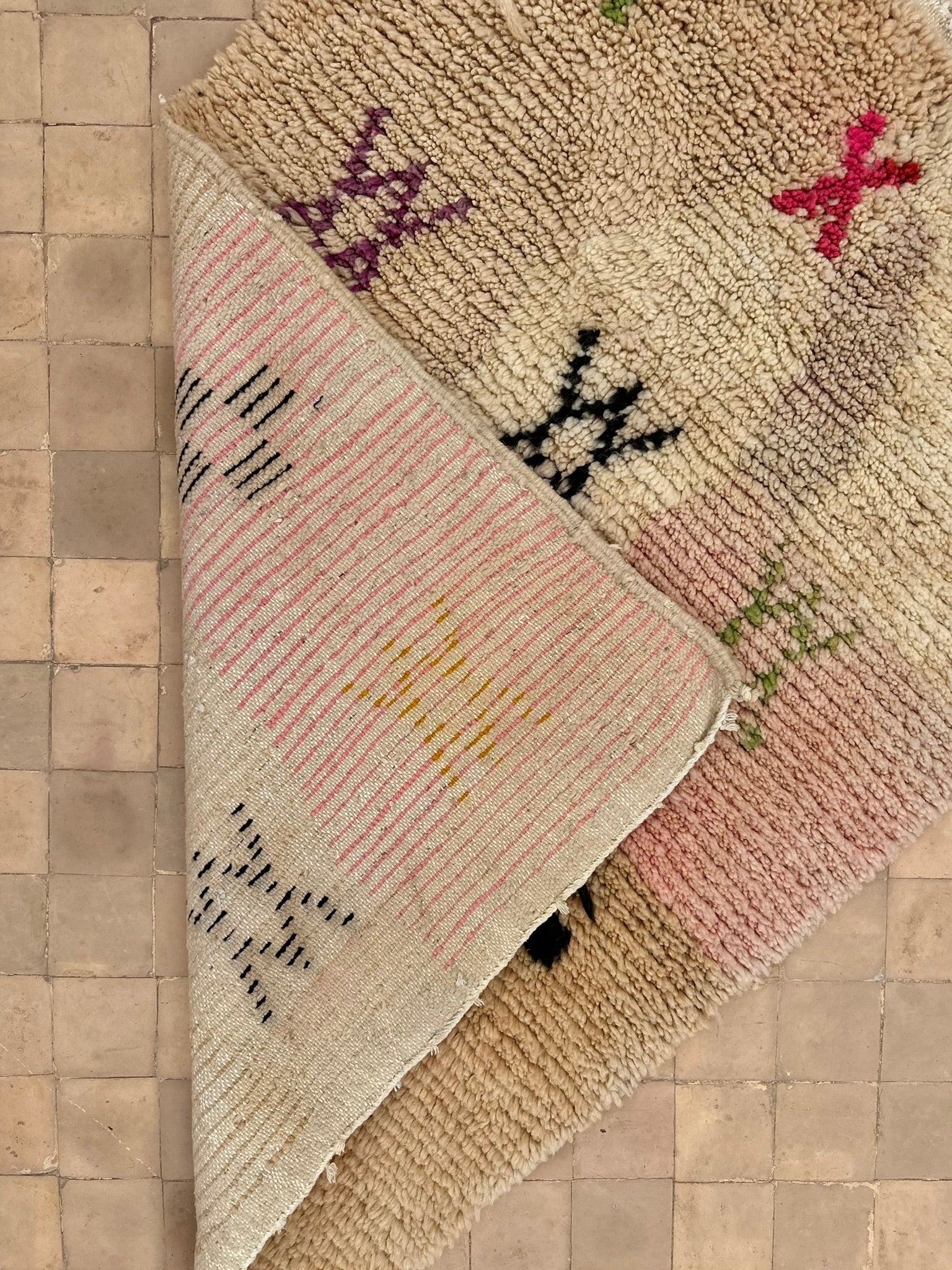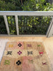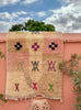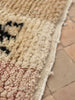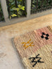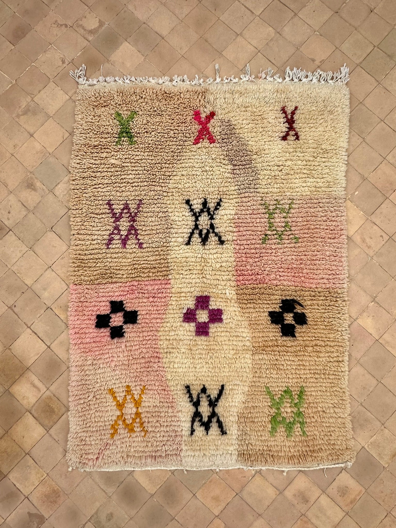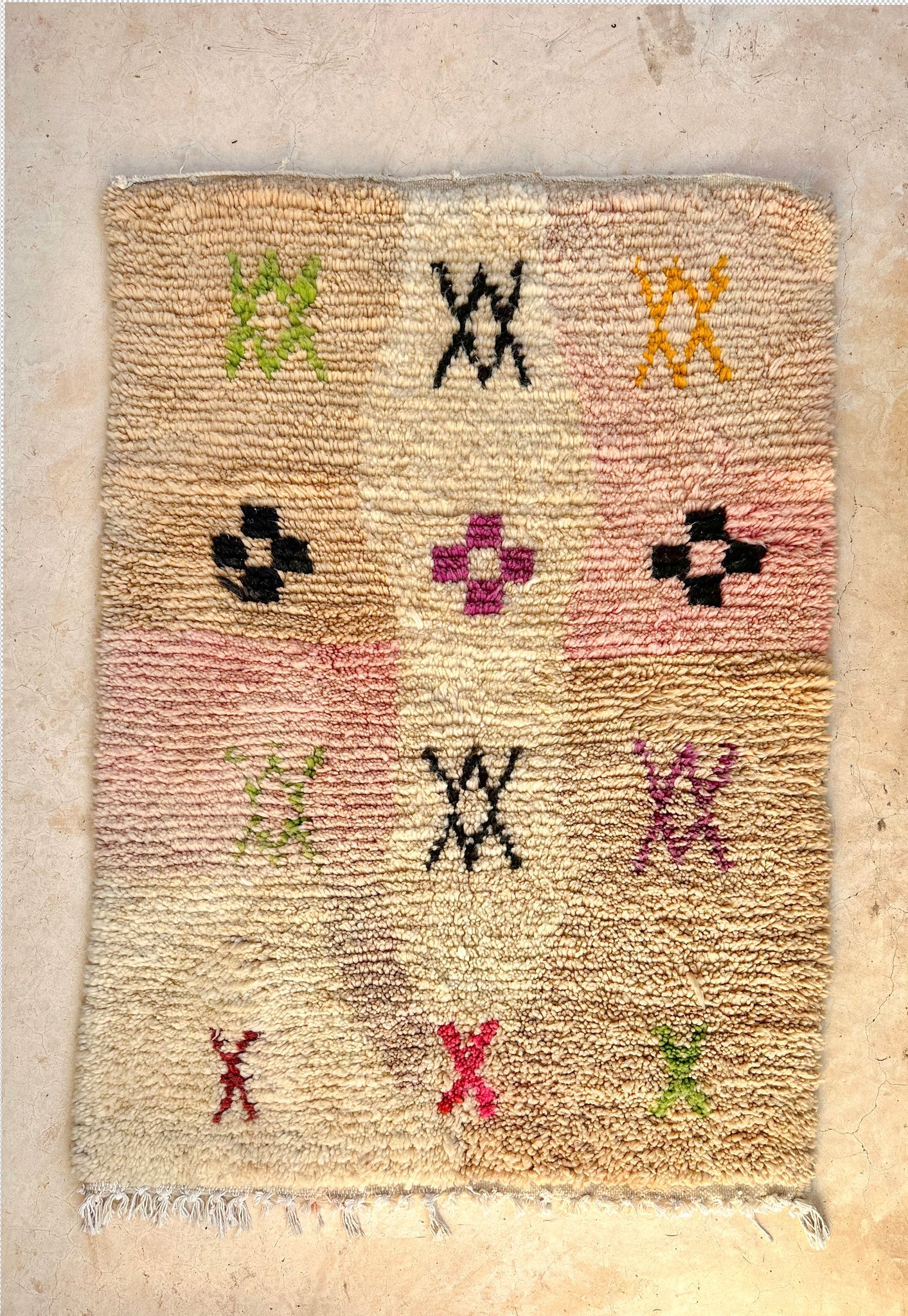Soft, subtle, and soulfully symbolic — TIZIRI is a petite Boujad treasure that brings gentle warmth and quiet character into any space. With its blush-to-ivory gradient base and hand-knotted Berber symbols sprinkled across the surface — from protective X-motifs to cross-shaped talismans — this piece feels both playful and deeply rooted in tradition.