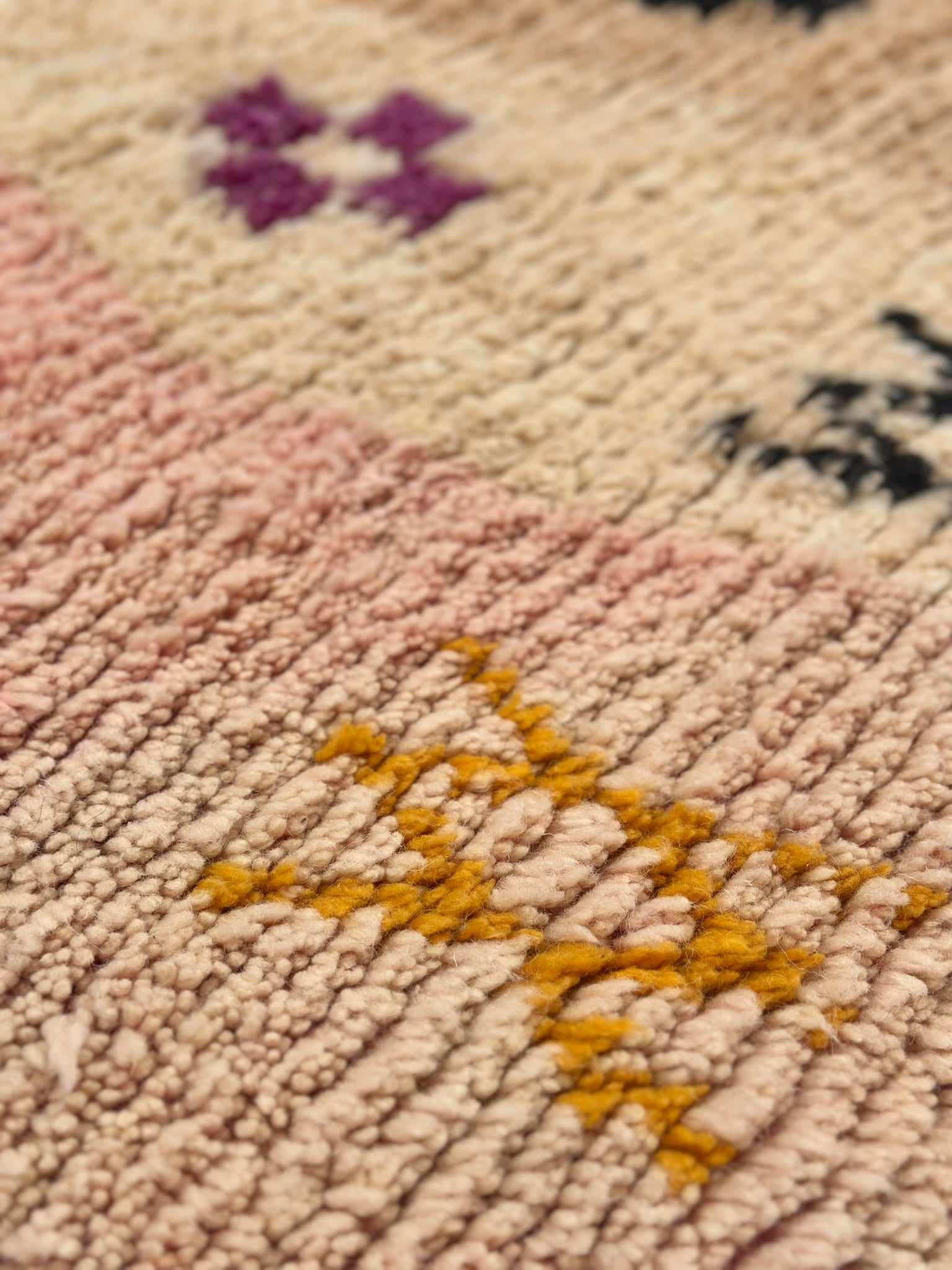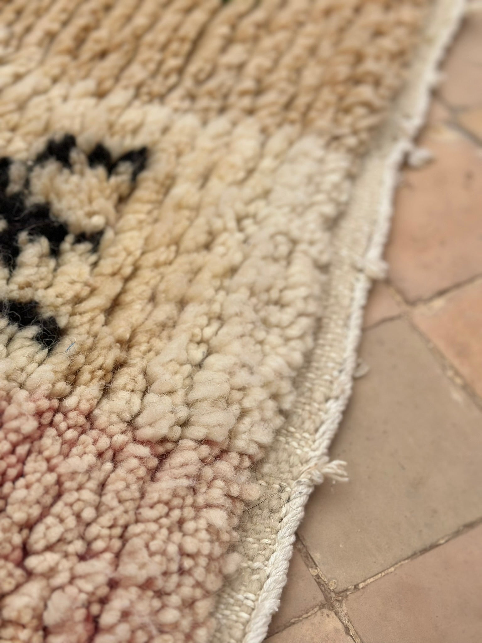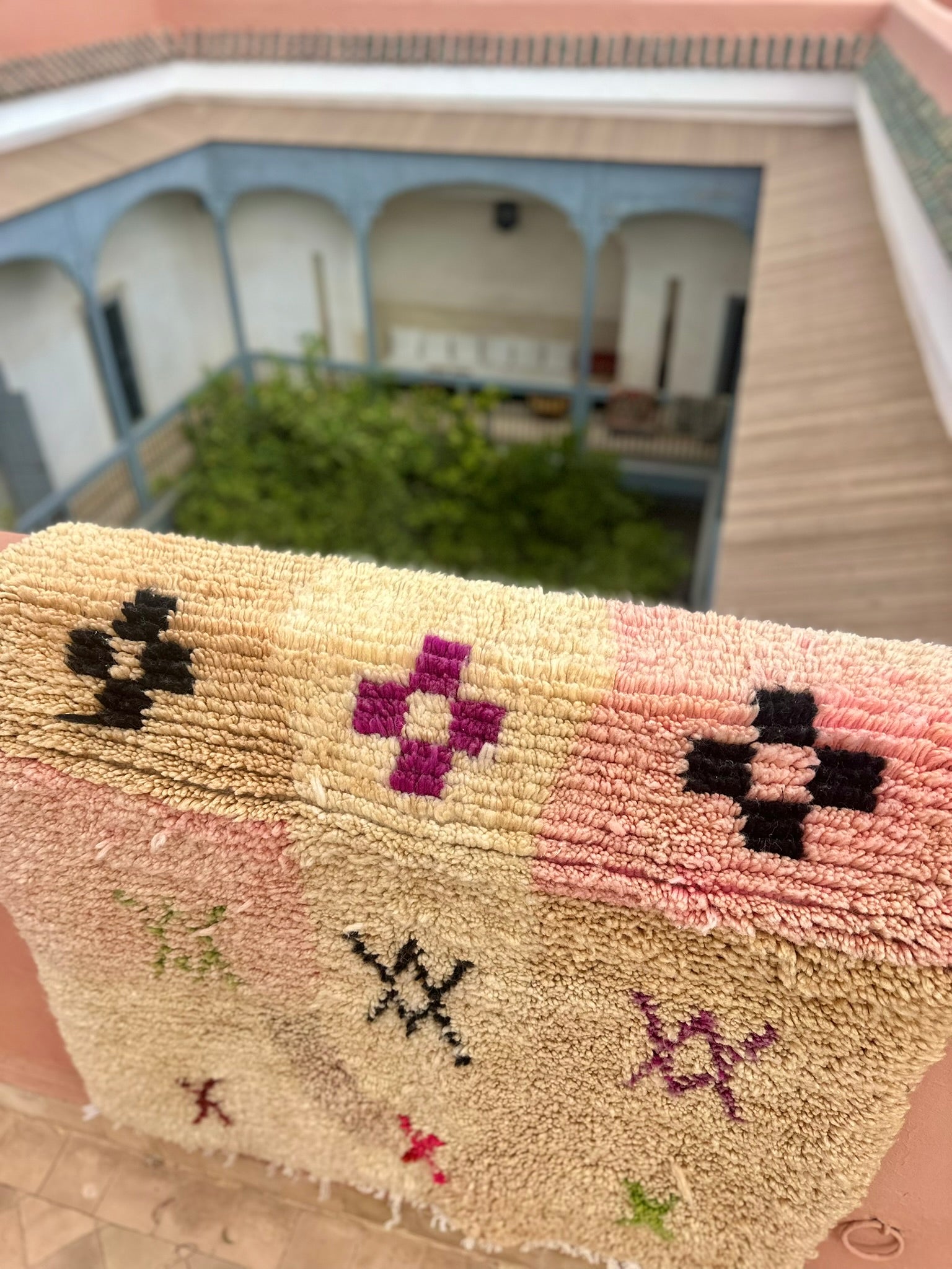 Soft, subtle, and soulfully symbolic — TIZIRI is a petite Boujad treasure that brings gentle warmth and quiet character into any space. With its blush-to-ivory gradient base and hand-knotted Berber symbols sprinkled across the surface — from protective X-motifs to cross-shaped talismans — this piece feels both playful and deeply rooted in tradition.